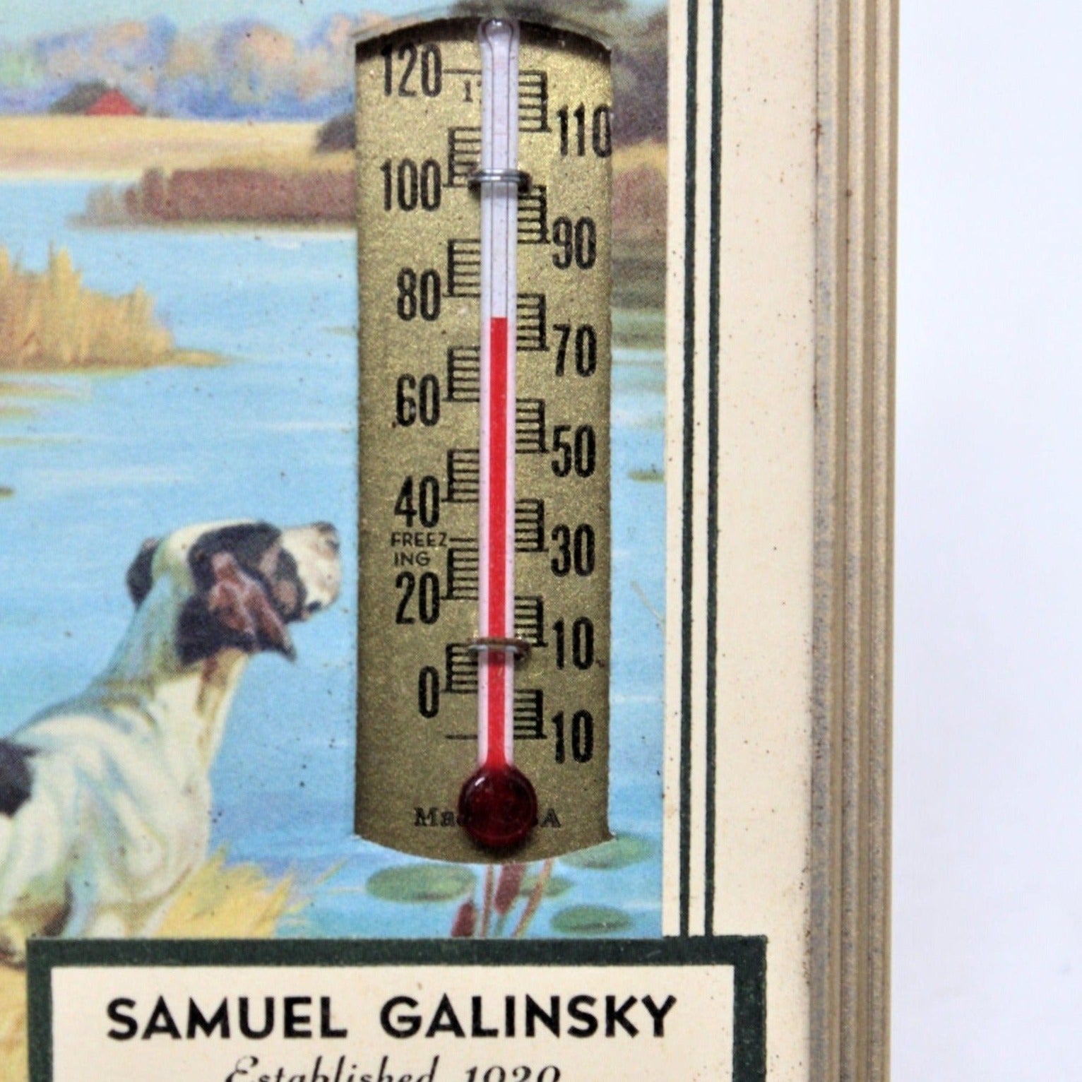 - Details: This is a wonderful piece of history when in the early 1900's local service providers, and large retailers, gifted items to their customers as part of their advertisement. Gasoline stations, plumbers, beauty salons, even large companies like Coca-Cola, have all gifted items, including thermometers. They figured these would not be thrown away as easily as a sign, so the practice continued well into the 1960's. These became so popular as home decor and collectibles, that in the 1980's some companies made reproductions with a retro-feel. This piece is a true original, not a reproduction, and it's in perfect working condition. This has a much-loved 1945 print from Henry Hintermeister called "Hunting Dogs". Shows two dogs by a lake, busy at their favorite activity, while their owner hides in the brush. This piece was given out during the holidays in 1952 with a new mini calendar for the upcoming 1953 year, on the back. The advertisement is for Samuel Galinsky, a plumbing and heating company in Jacksonville, FL, (no longer in business). It is framed in a gold-tone metal frame and it can be hung on the wall. This piece would make a nice addition to any man-cave, home bar, or rec-room. Great for a advertisement collector, or hunting enthusiast!