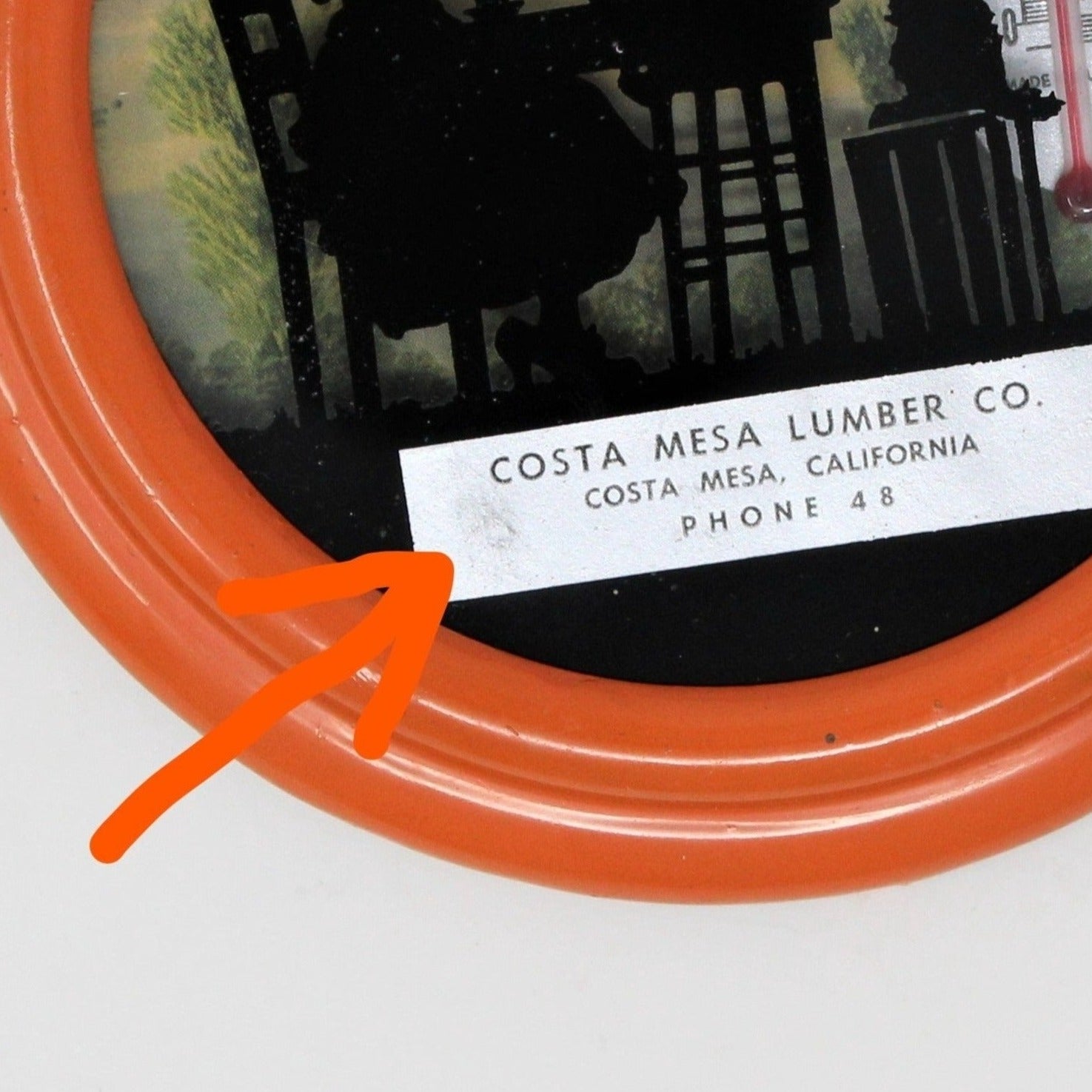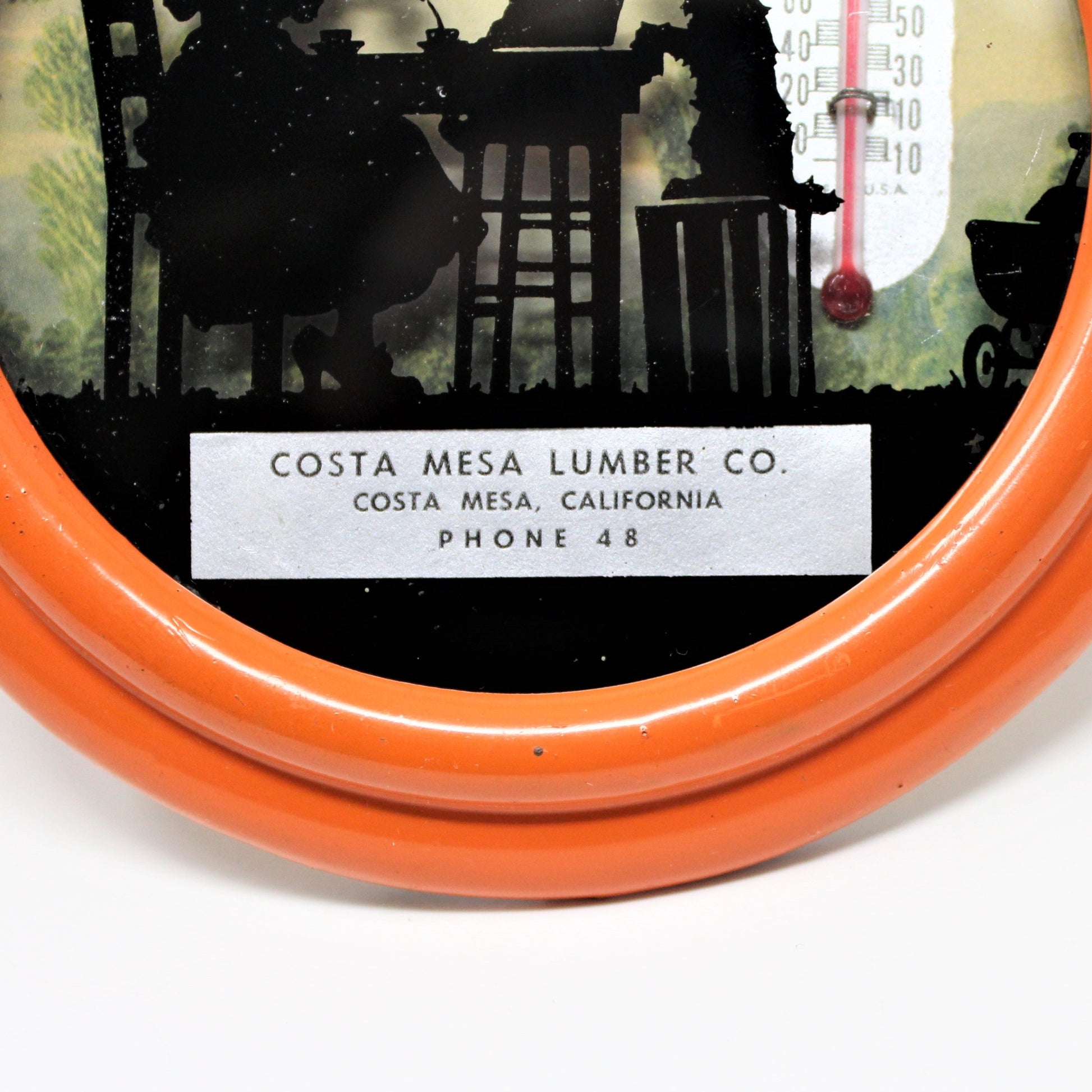 - Details: This is a wonderful piece of history, an advertising collectible from the early 1900's. This one features a reverse painted silhouette, an extremely rare image of a child playing dress-up (note the oversize shoes), serving tea to her doll as the family dog looks on, against a pretty outdoor background. The use of children in these reverse painted thermometers is very rare, typically adults were featured. There was a time when local service providers and large retailers, gifted items to their customers as part of their advertising strategy. Gasoline stations, plumbers, beauty salons, even large companies like Coca-Cola, have all gifted thermometers. They figured these would not be thrown away, so the practice continued well into the 1960's. These became so popular as home decor and collectibles, that in the 1980's some companies made reproductions with a retro-feel. This piece is a true original, NOT a reproduction. We dated this piece based primarily on the phone number "48", (see below for details). This is an advertisement for Costa Mesa Lumber Co. in Costa Mesa, CA, (no longer in business). It is framed in an orange metal frame and has a hook on back for hanging. The back reads: Made by Newton Manufacturing Co, Newton, Iowa. This piece is a great gift for an advertisement collector, or as part of your silhouette collection.
