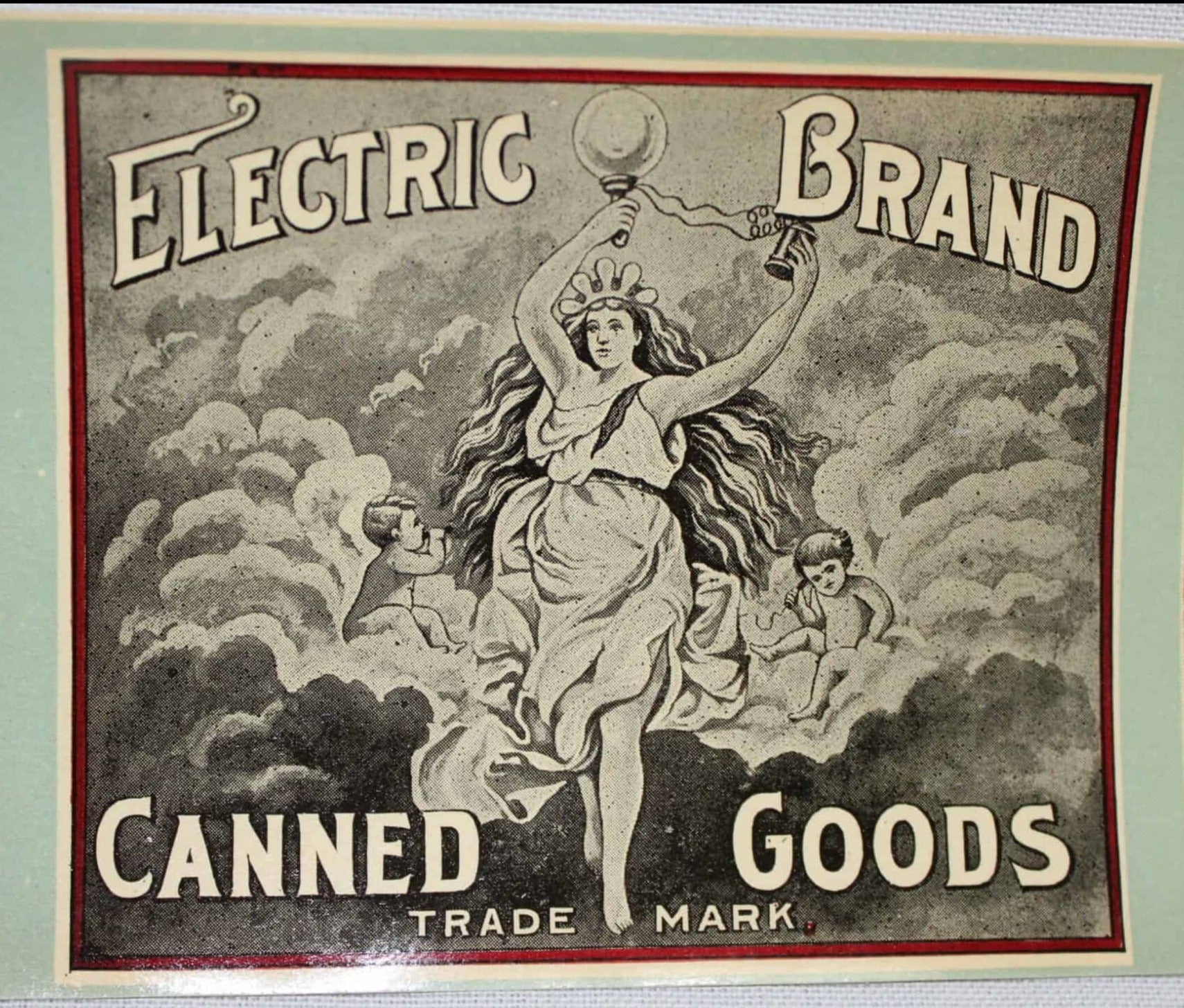 - Details: One of the rarest labels you'll see and one of the oldest labels made by Olney & Floyd. There are no weight markings, which was required by law around 1906, we've been able to date it to the 1890's. Truly one of a kind quality, Guaranteed Genuine/Original. This has an incredible image of a Goddess holding up a light with electricity flowing from a battery in her other hand. She has two babies by her side each holding a phone, this is from when phones and electricity were considered almost magical. (The image of the lady was updated and colorized in 1906, to a more modern looking woman, still with two babies on the phone besides her, this one is the earlier, older, version). The other side shows a well detailed corn and beans with ornate red lettering. The colors are bright with fantastic graphics and the attention to detail is amazing considering there were no computer graphics back then. It would take a craftsman 3 to 4 months to make the plates to produce a label like this. It wasn't until 1903 that the first lithographic offset press for paper was produced, slowly doing away with stone lithographs. This is an incredibly beautiful stone lithograph. It's rare to run into can labels of this kind of quality, definitely suitable for framing, and recommended to maintain this condition. Collecting labels has become a very popular hobby, mainly because of the many beautiful and unique images/artwork that can be found. If this is your hobby, we have lots more labels available, please feel free to browse.
