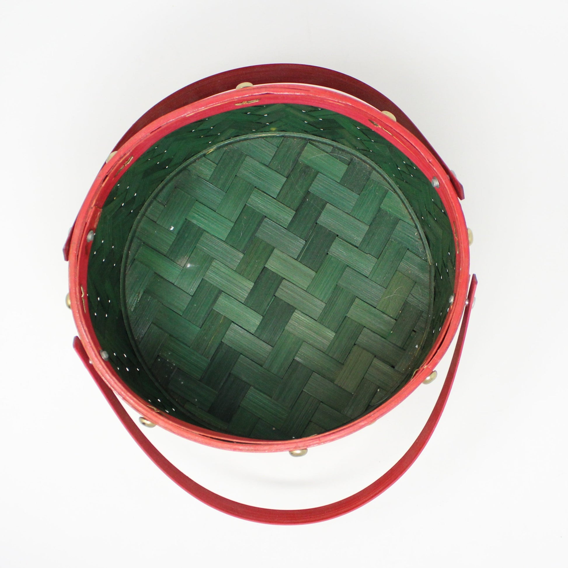 Basket, Red and Green Holiday Drum Shaped Basket with Handles, Vintage 9"