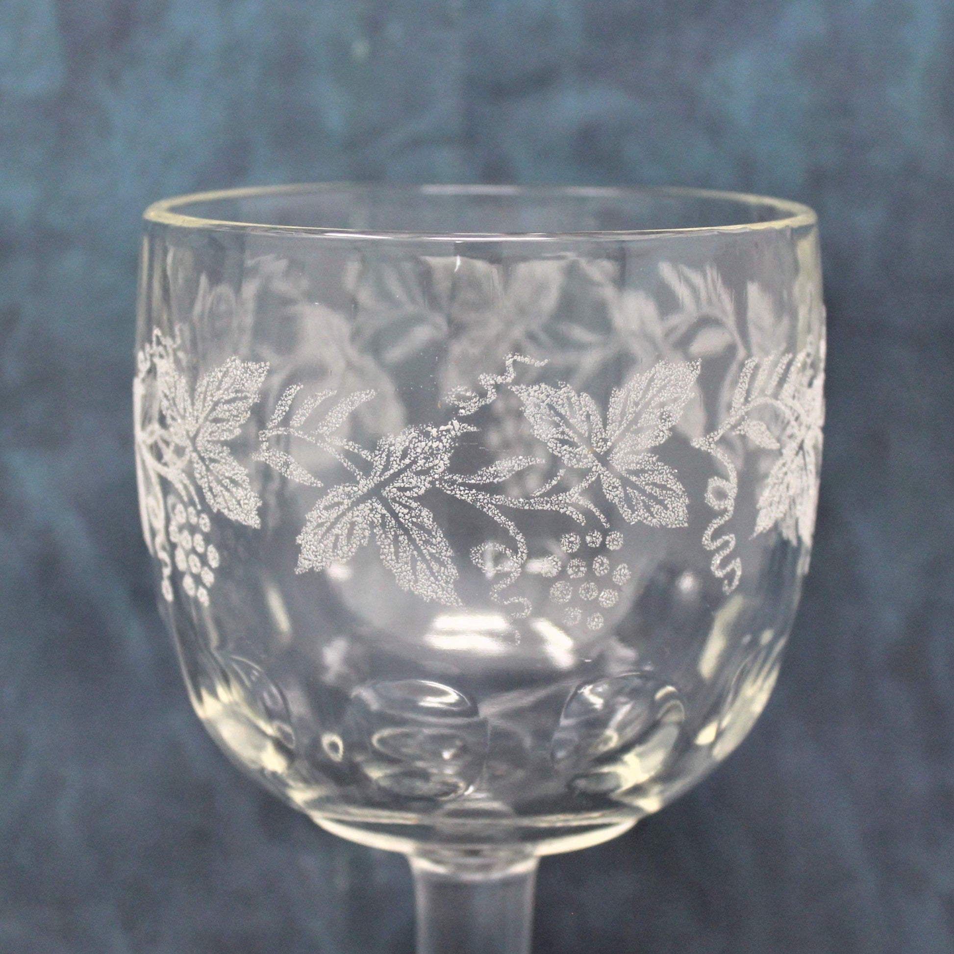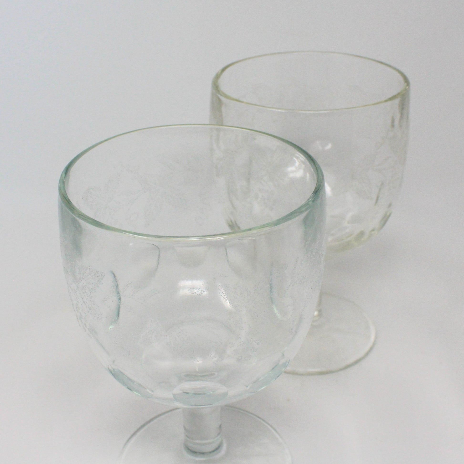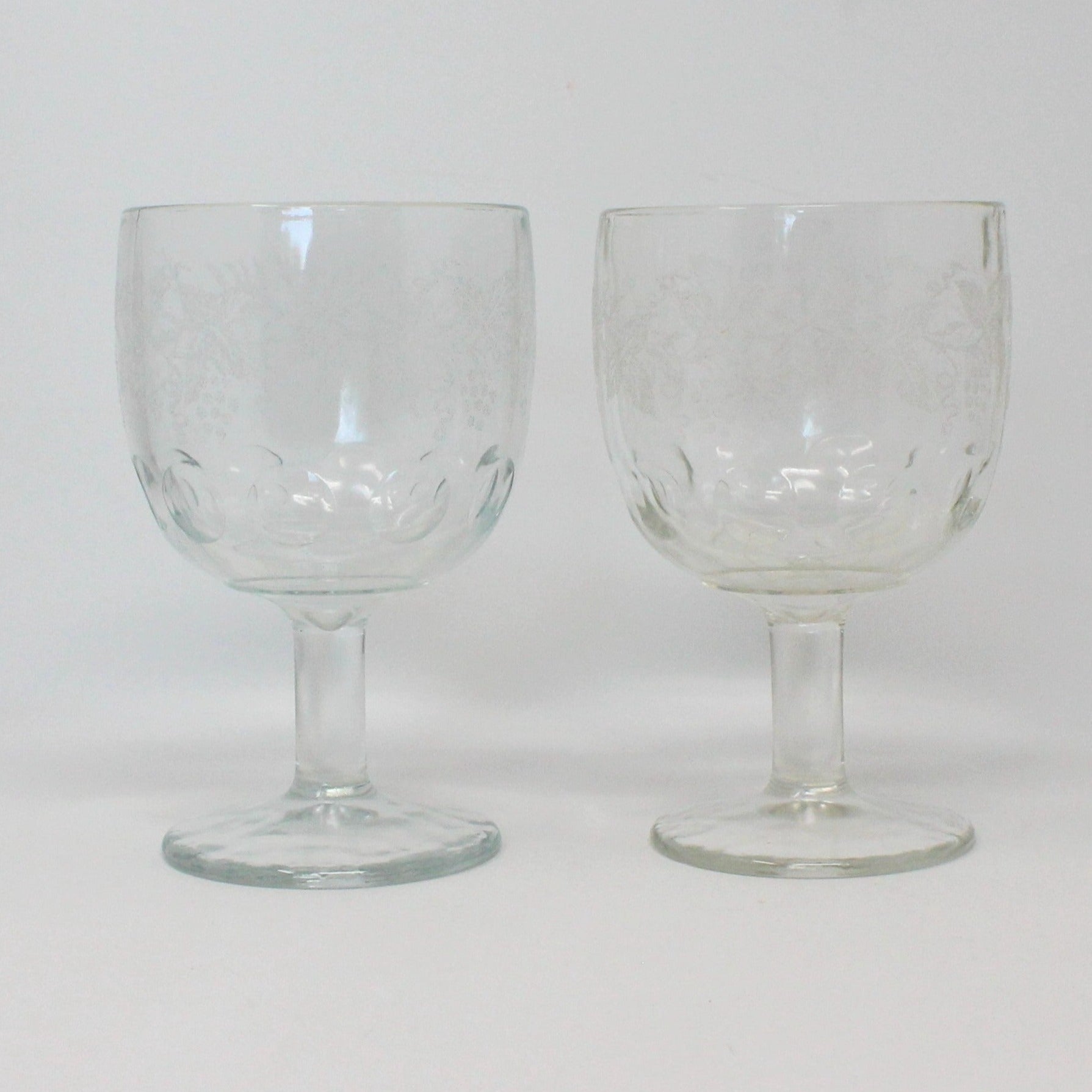 - Details: Bartlett Collins is well known for this Thumbprint pattern, they made it in clear and color glass, later adding different decals/patterns to the same glass shape. This one has these very pretty "sugared grapes", called Golden Grapes (decoration 806), Bartlett Collins introduced this pattern in 1947. The white grapes pattern was made by hand, applying finely ground glass or sand (there's conflicting information out there), to the outside of each piece to form the grapes and leaves. This stemmed style glass is known as a Schooner, designed for drinking beer, (it's sometimes identified as a water goblet), it is pressed glass and has two mold seams. Not only perfect for drinking LOTS of beer, but great size for holding lemons and limes or corks on your bar.