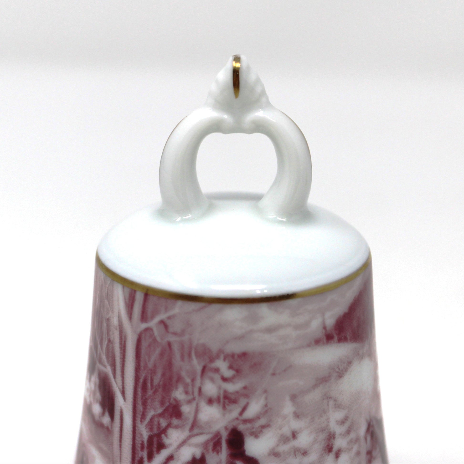 • Vintage Porcelain Bell, Snowy Winter Scene Horse Team Pulled Carriage Through Pine Tree Forest, Holiday Collectible, Christmas Home Decor, German Porcelain, Pink / Purple, Fuchsia Transferware (Discontinued)