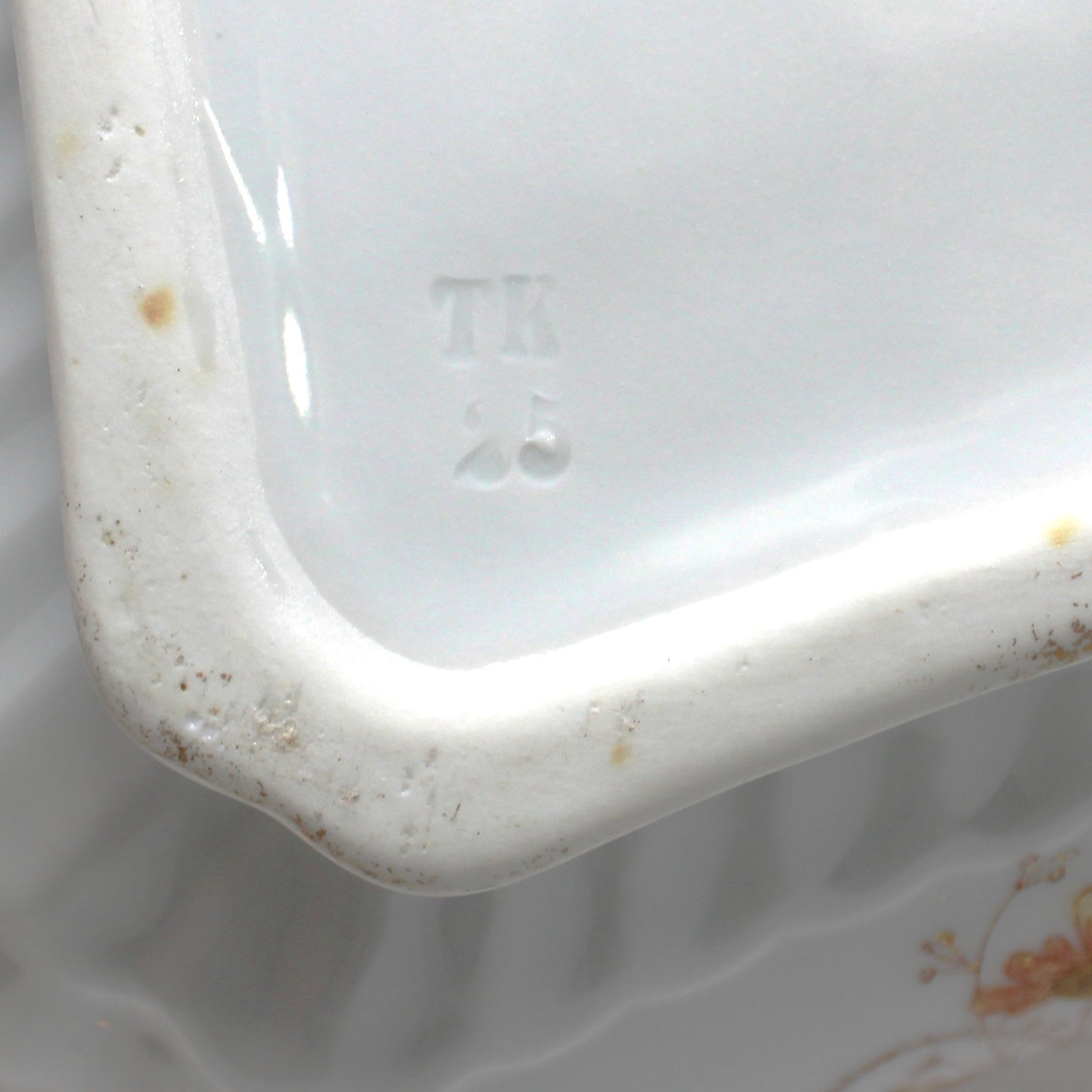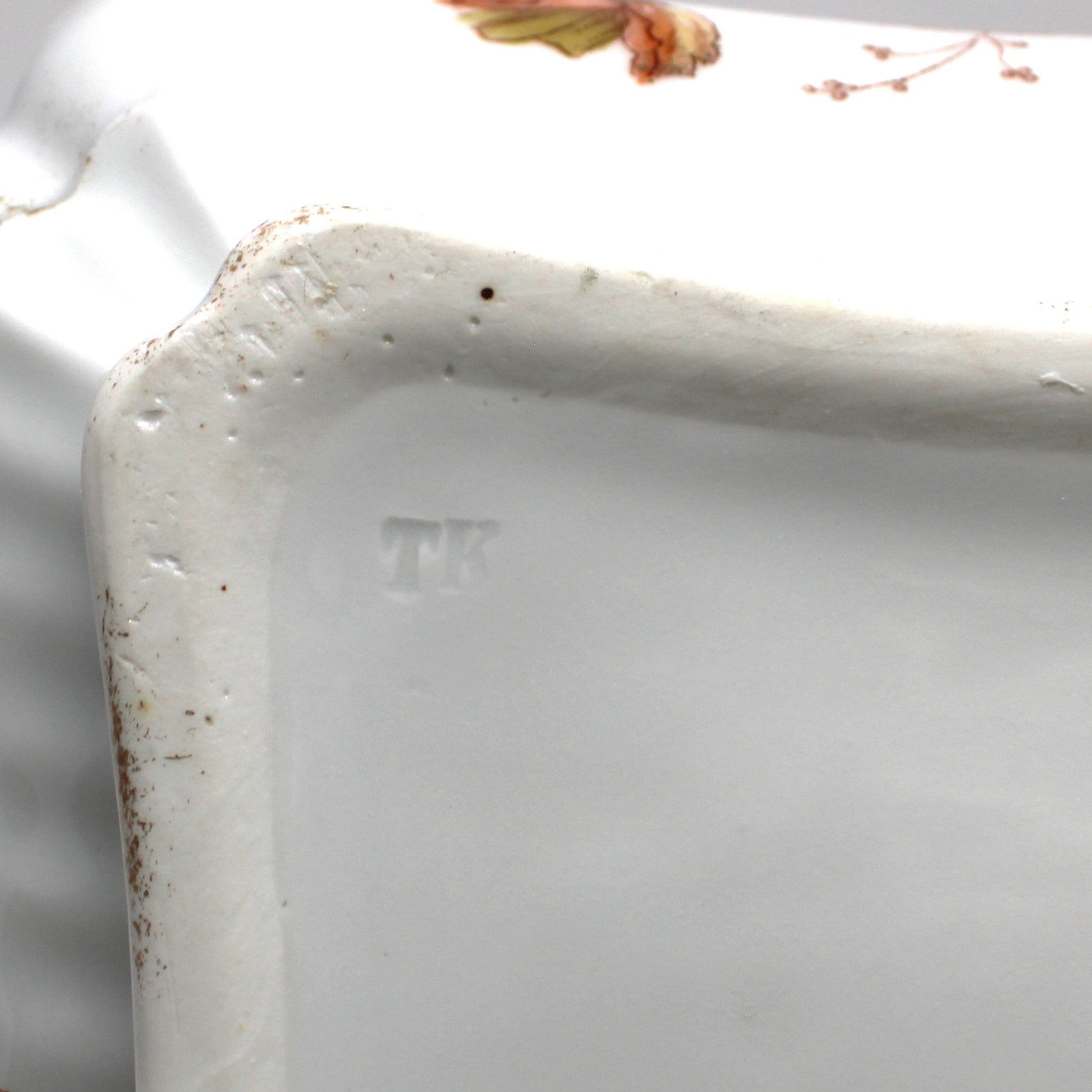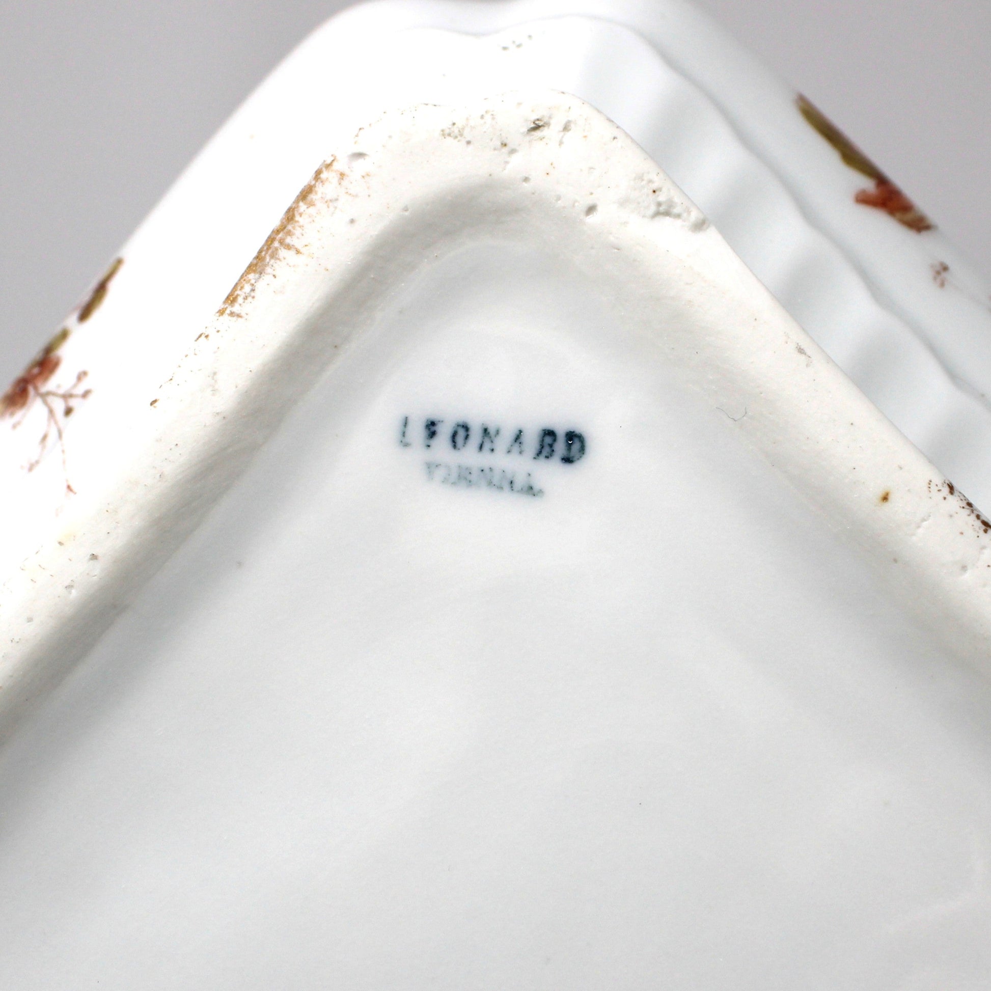 • Details:  An absolutely gorgeous decorative square bowl by the highly regarded factory Count Thun Factory / Thun Klosterle Porcelain.  The hand painted floral design has rust, bronze, beige and gold colors with raised dots (moriage) on the smaller flowers. The bowl is square with embossed shells on the corners and a scalloped design on the base.  It has an impressed TK mark, which we understand was used from approximately 1830 until 1889, although this TK mark has a number 25, possibly indicating 1825.  There's also a blue stamp for "Leonard Vienna", this belongs to "P H Leonard", an importer known to have imported items from the Count Thun Factory, (PH Leonard filed bankruptcy in 1898).  This floral pattern is listed in the replacements website as a Leonard Vienna pattern #7612. Perhaps the PH Leonard company assigned it the number.  This is a gorgeous bowl with a rich history, that has survived in this wonderful condition for possibly 200 years!  A true treasure for a collector, or someone who appreciates valuable antiques and beautiful porcelain.  This is a heavy bowl, price includes shipping.