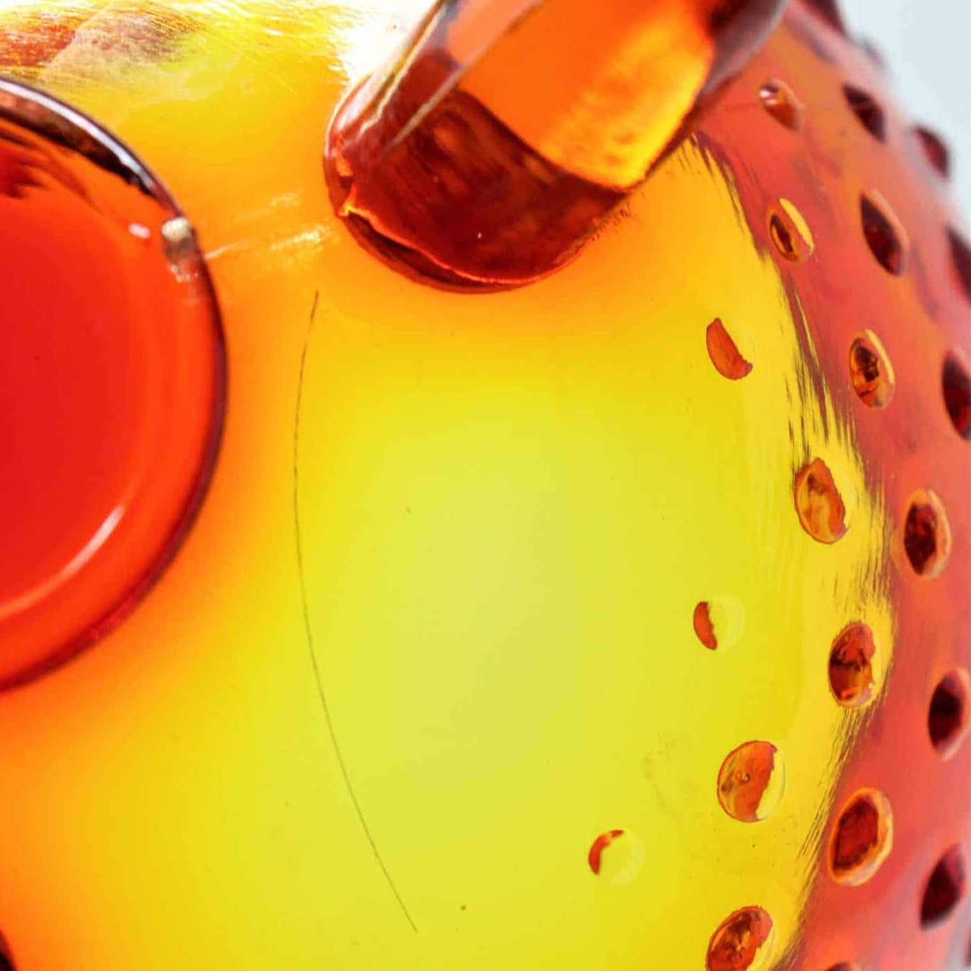 - Details: This is a beautiful Amberina (red/orange/yellow) Rose Bowl from L.E. Smith Glass Company. The piece features their Hobnail pattern with a beautiful scalloped edge and three little feet. The scalloped edge has tiny indentations where roses (or any flower) could be held in place without the use of a frog, that's why it's known as a Rose Bowl, however, a round frog would fit nicely in here if needed. The color is Amberina, which Smith Glass may have called "Flame", it is red on top and gradually lightens to yellow/orange. This bowl shape was only made for one year, so they are scarce. The bowl can still be used for roses, but it would also look lovely as a candy, nuts, trinket bowl, or vanity dish. These are not only highly collectible Amberina glass pieces, but they will brighten any area of the home you choose to display them in.
