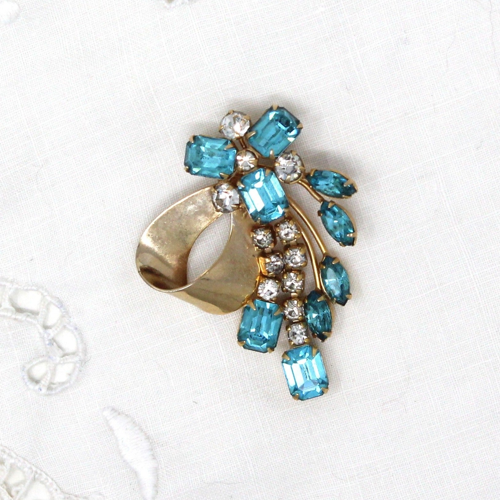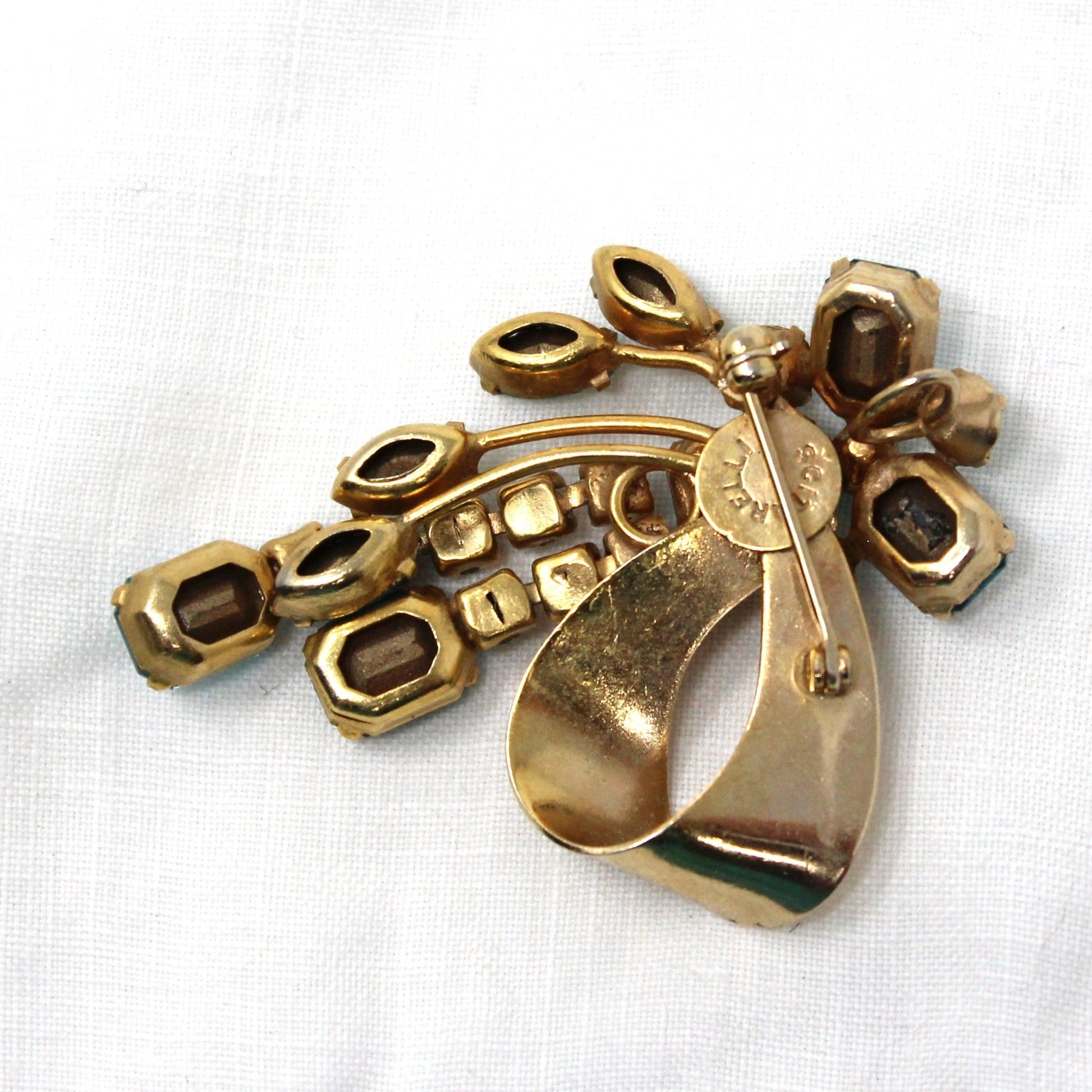 - Details: Such a wonderful demi parure set! Scarce and beautiful, the brooch has aquamarine and white rhinestones forming a flower in the center with a fancy ribbon-loop on one side and two dangles on the other. The earrings are screw back, they form a flower, coordinating with the center flower on the brooch. The brooch has many different rhinestone shapes mixed together, while the earrings are much simpler, as not to take attention away from the gorgeous brooch. These are very well made, high quality pieces, we believe these are gold filled, most of the Scitarelli branded pieces with rhinestones, were gold filled. Noteworthy, products signed with the Italian name “Scitarelli” is Rare quality costume jewelry and luxurious accessory of this brand has already moved into the category of antique in some circles, and is highly collectible. Perfect for so many outfits, a beautiful set for gift-giving. A great gift for a collector!