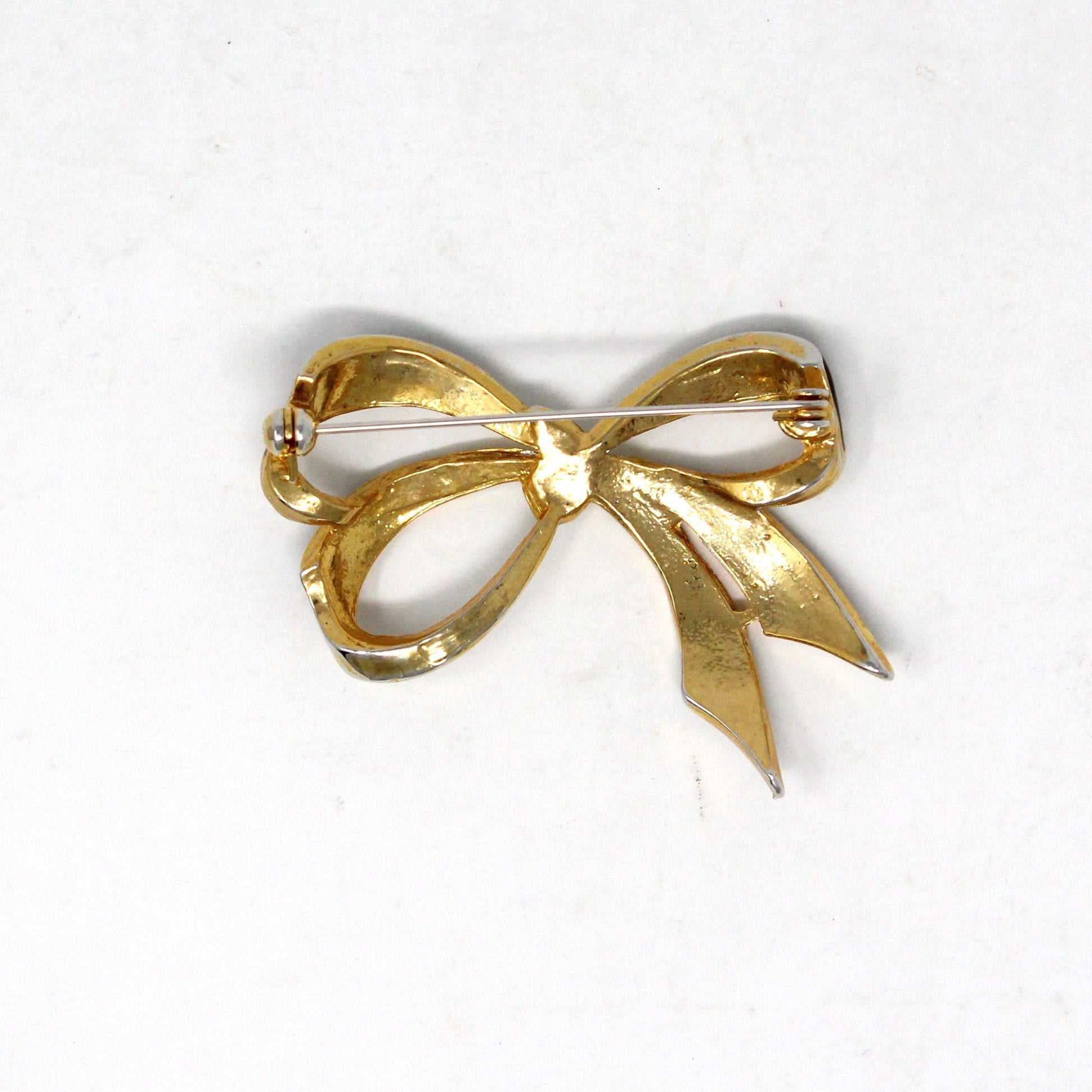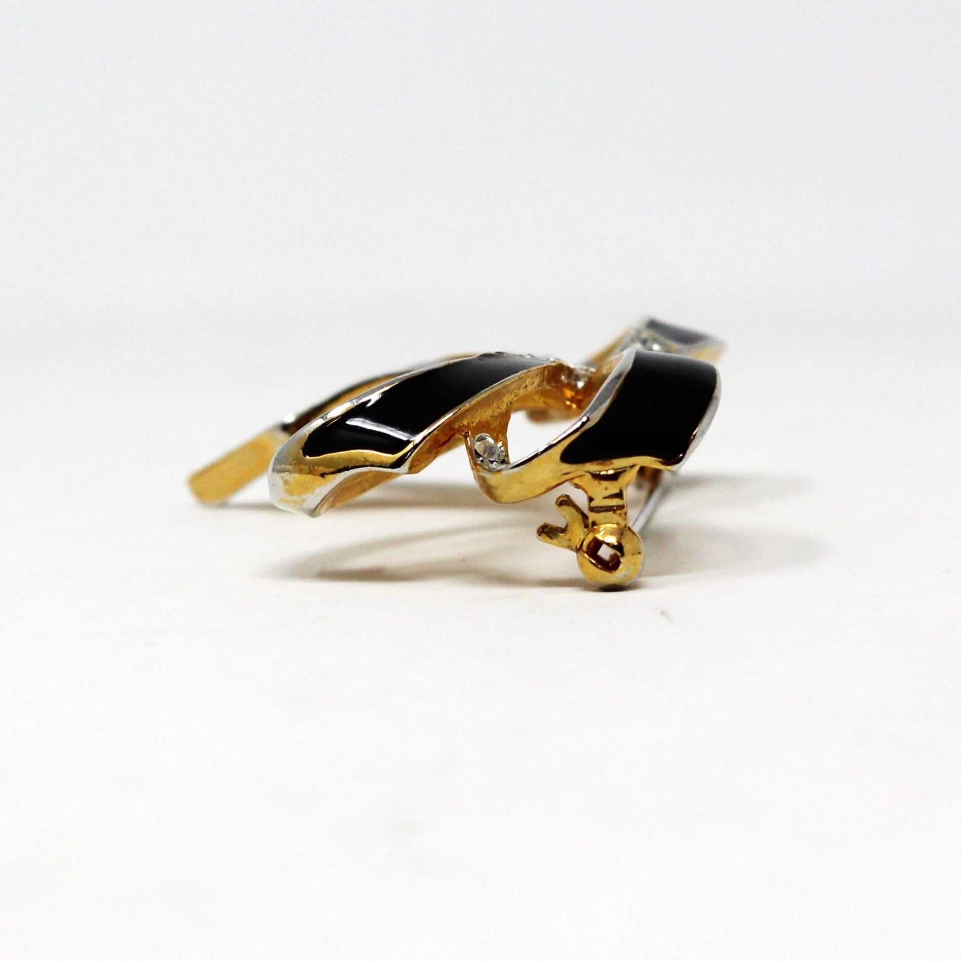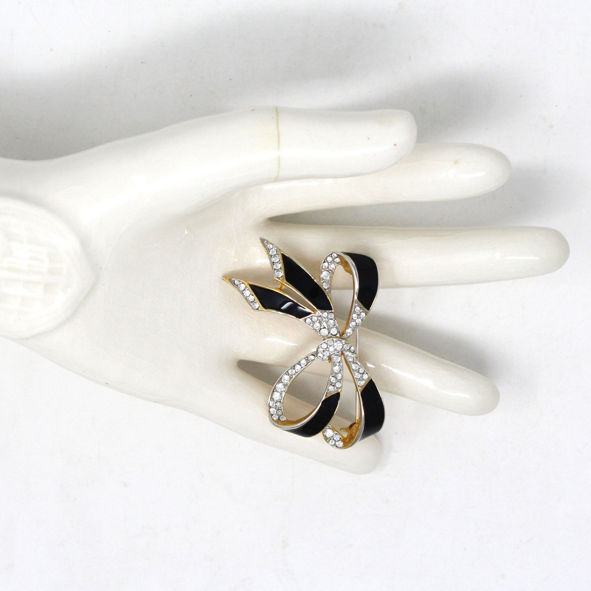 - Details: Such a feminine brooch! It is shaped like a pretty triple-loop bow in gold tone metal, black enamel and clear rhinestones. The rhinestones are pave set, very clear, no discoloration. Overall a really well made piece, lots of attention to detail. Perfect for so many outfits, very elegant!