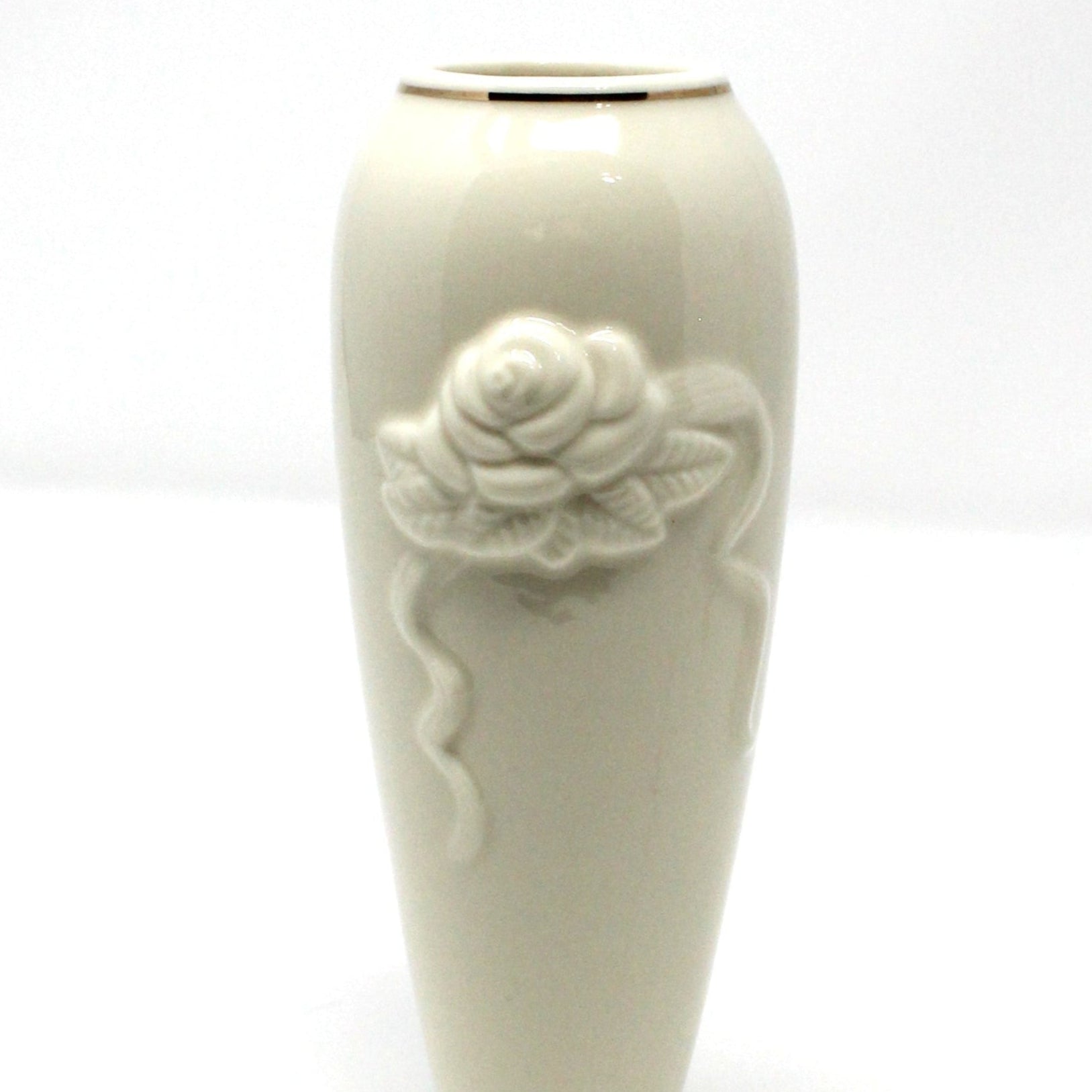 - Details: This vintage Lenox vase is part of their Rosebud porcelain collection. It is in the traditional Lenox cream colored porcelain with gold accents. It features an embossed rose with flowing ribbons on one side, and a smaller, single rose on the other side. Elevate your space with this classic and charming addition to your decor.