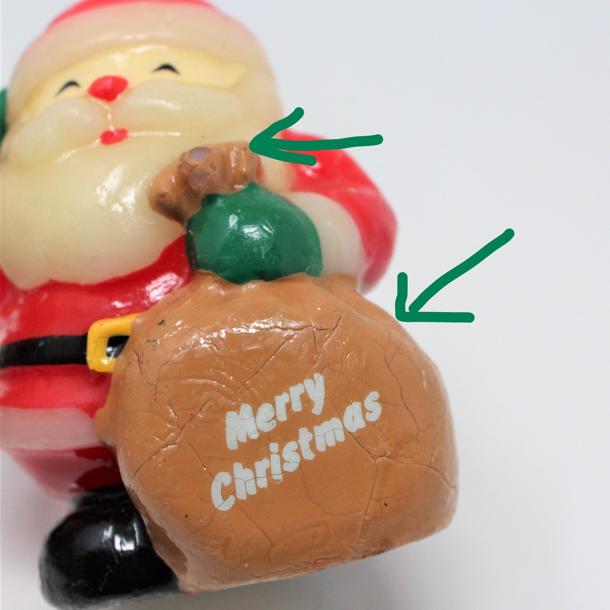 - Condition: Vintage - Used. Very Good Vintage Condition, Never Burned. There is crackling on the paint on Santa's bag and one small spot where the paint is missing on top of his bag, photographed for you. Please review all pictures and make sure you love this item before purchasing, we can't accept returns. Please remember these are ANTIQUE and VINTAGE items, they are NOT new, every effort has been made to show any scratches, wear and tear and imperfections.