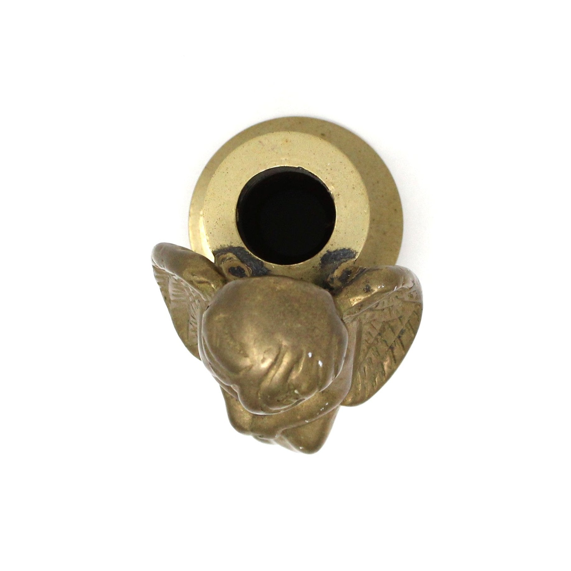 - Details: An angelic candle holder, sure to make you smile. It's a pensive Cherub Angel, sitting with his back to the candle holder. The patina on this one is just wonderful, but of course he will buff to a nice shine if cleaned. This piece is unmarked so we're unable to tell you much beyond the description. This is a short candle holder, perfect for a bookshelf, side table or any little nook and cranny you'd like to add him to. Perfect for Christmas and Valentine's Day holiday display. The candle holder will fit one taper size candle. He is very heavy for its size, please keep that in mind at check-out. Any angel collector would love this cherub!