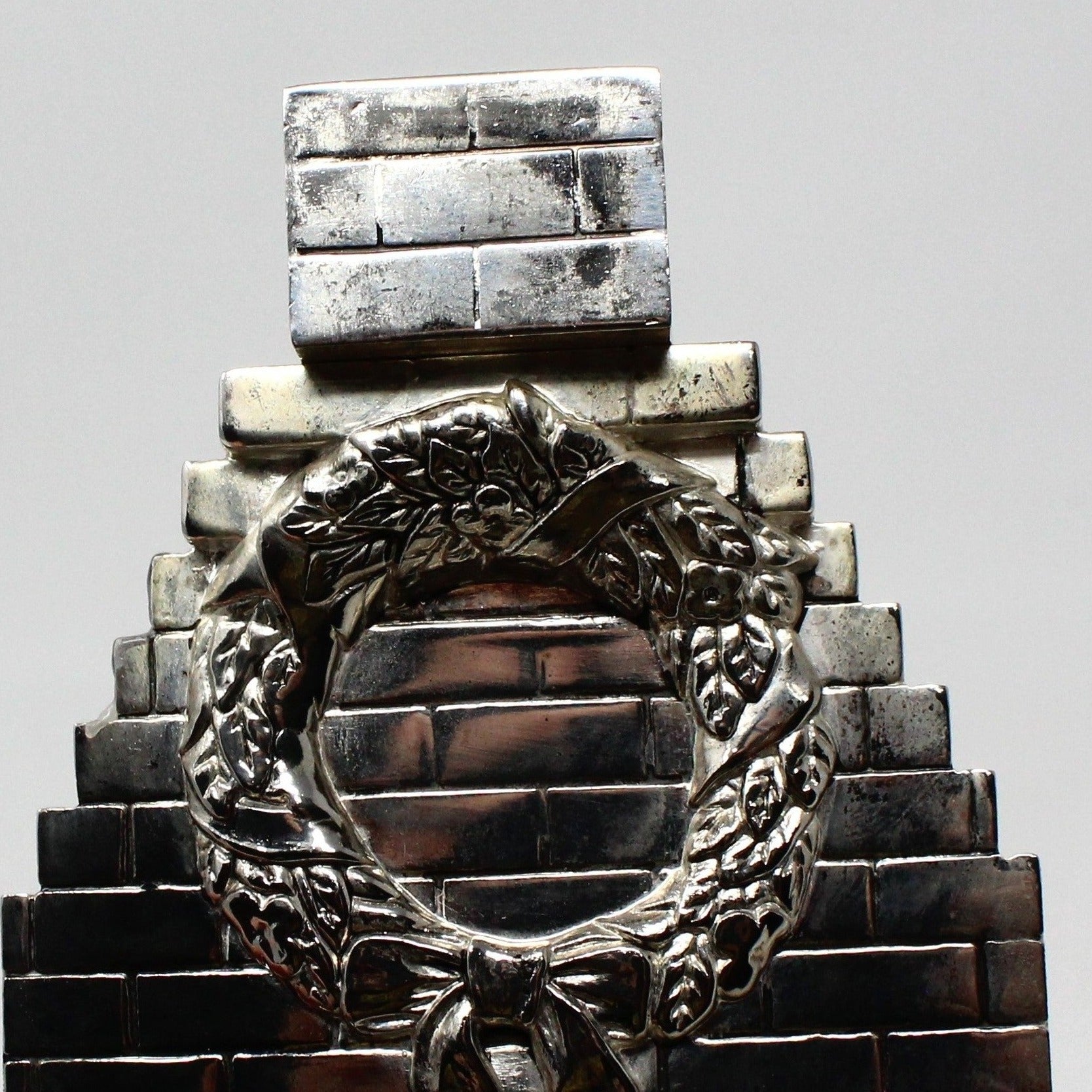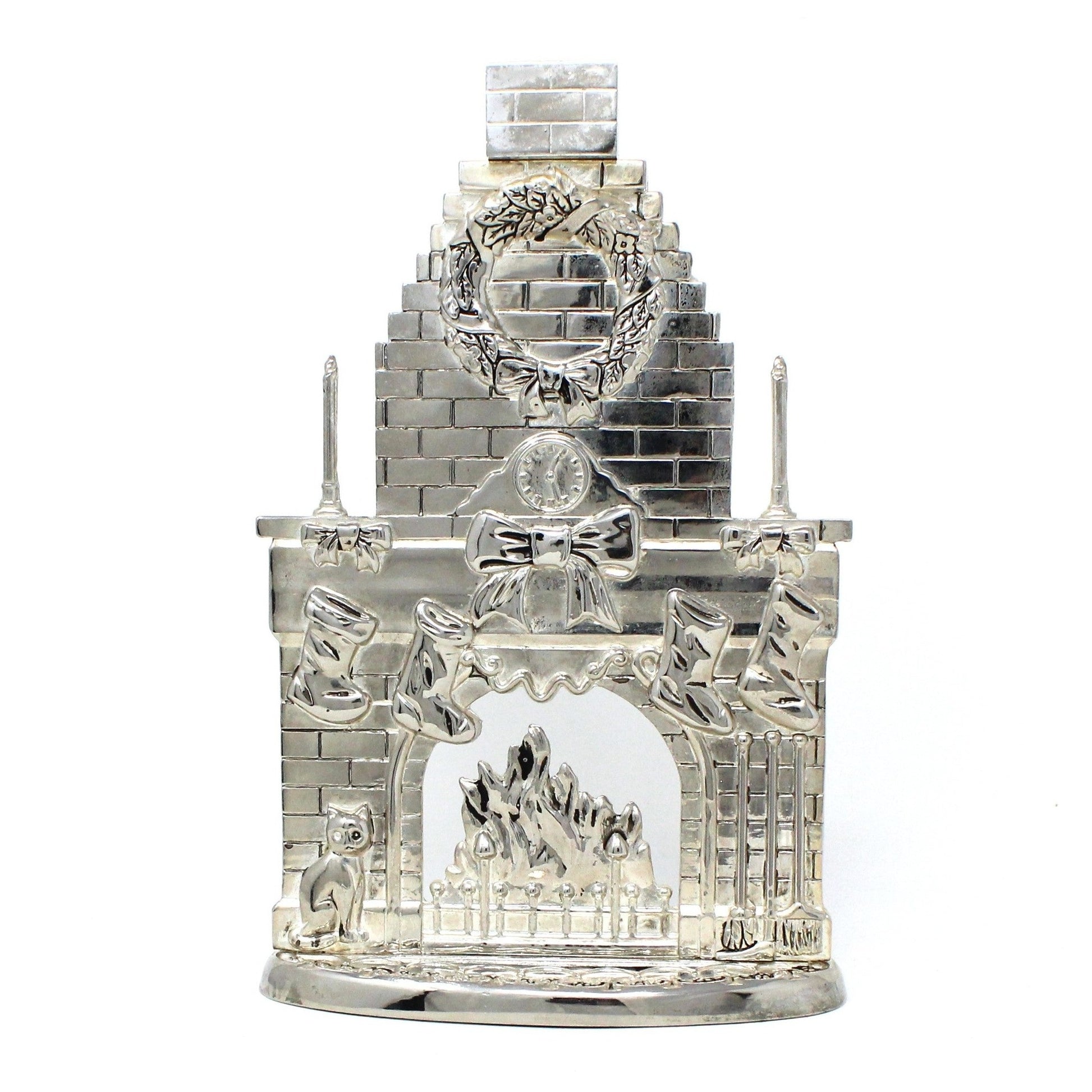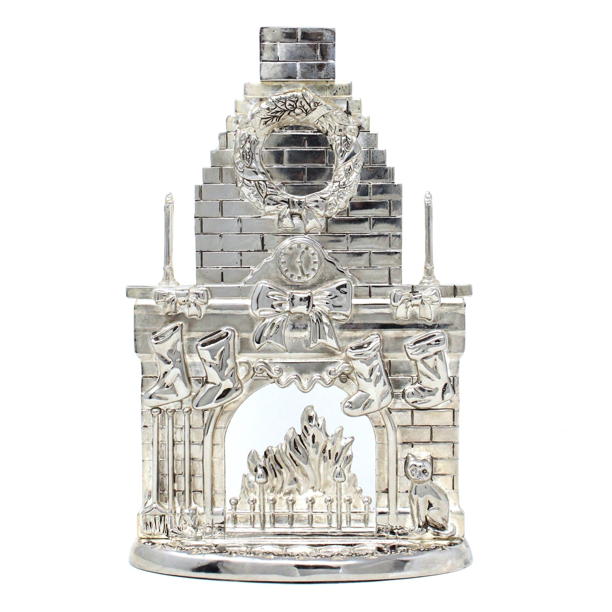 - Details: This is a very elegant silver plated candle holder with lots of traditional Christmas details. It is shaped like a brick fireplace with a mantel decorated for Christmas with stocking, candles, bows and a large wreath on top. The fire is burning and there's a kitty cat keeping warm on the side. Same design on both sides. This is a stand-out piece, silverplate, with a vintage design perfect for your holiday decor. It retains its original sticker on the bottom from GSA (Godinger Silver Art Co), plus it's embossed "Godinger" on one side. This is a heavy piece for its size, please keep that in mind at check-out. A unique piece for your home or as a beautiful Christmas gift.