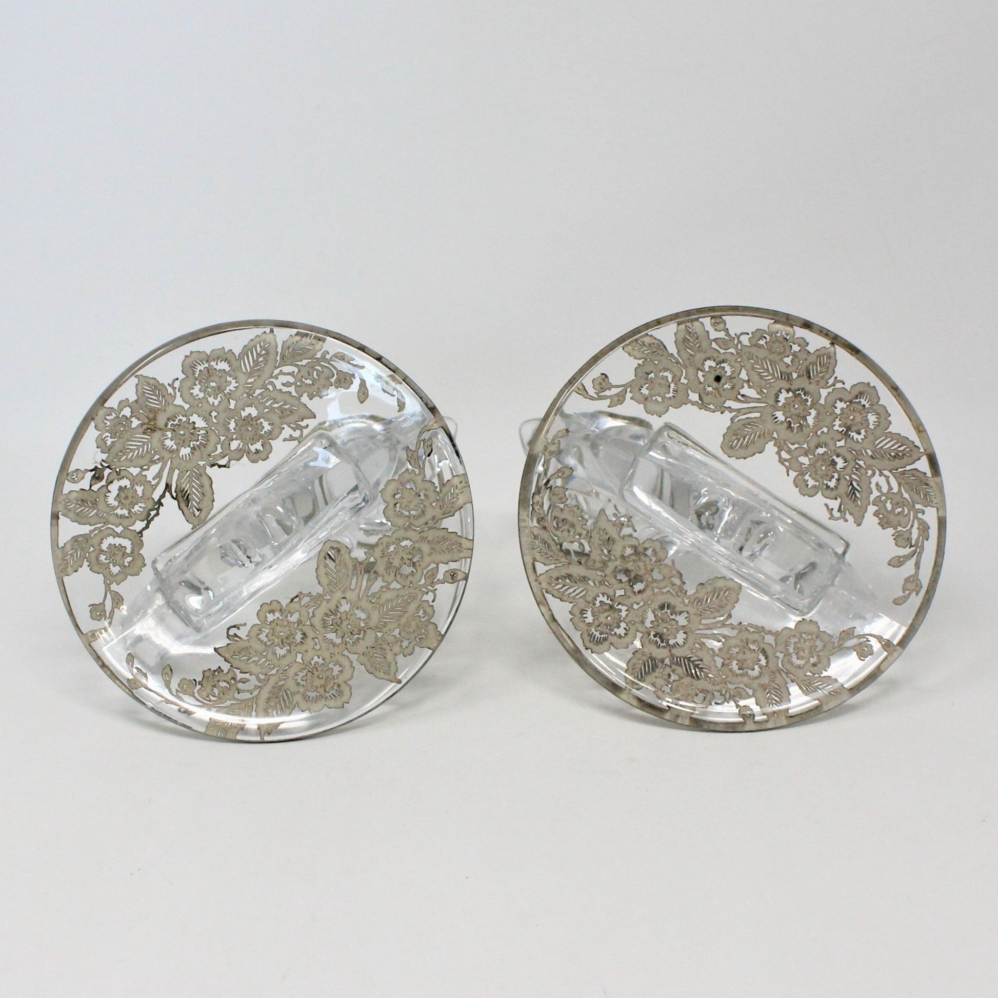 - Details: This set of Vintage Fostoria glass candle holders are perfect for adding a touch of elegance to any room. These are in the beautiful Baroque-shape that was manufactured by Fostoria from 1937 - 1965. They are crafted with a stunning silver overlay, making them truly unique. The silver-overlay was done by Silver City and the pattern is called "Blossom Time". Silver overlay was made between 1951 and 1978, which allowed us to estimate a date for this set somewhere between 1951 and 1965. This classy vintage set of two candle holders will add a bit of old-world charm and elegance to your home. Makes a great wedding or silver anniversary gift too.