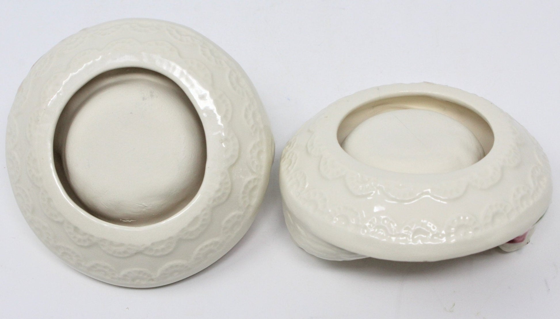 - Details: A really romantic pair of tealight holders, hand made and hand painted. They each have two white doves nestled among large pink roses. The underside has some pretty lace detail. The look is romantic, shabby chic, maybe even a little French Country, would match many different decor styles. We think they're also perfect for a romantic dinner for two, or for crafting. A pretty addition anywhere you display them. There are some Condition issues, please see Condition below.
