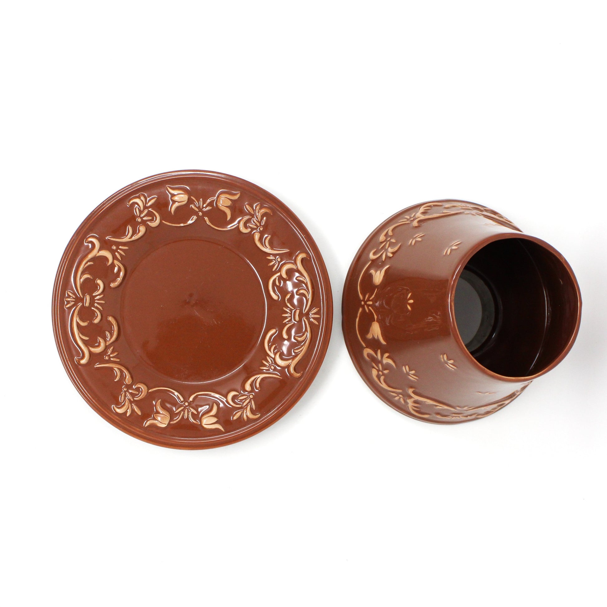 - Details: This is a set of ceramic shade and underplate for those wonderful jar candles from Yankee Candle. The pattern has a band of tulips, swirls and leaves all around the border, more leaves are scattered all around the shade. The colors of brown and tan are perfect for Fall decor. The tulips reminds us of Old World Holland and Alpine designs, so pretty!