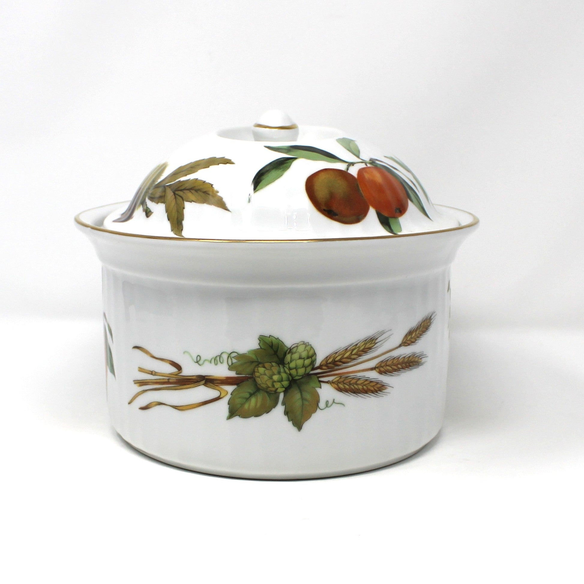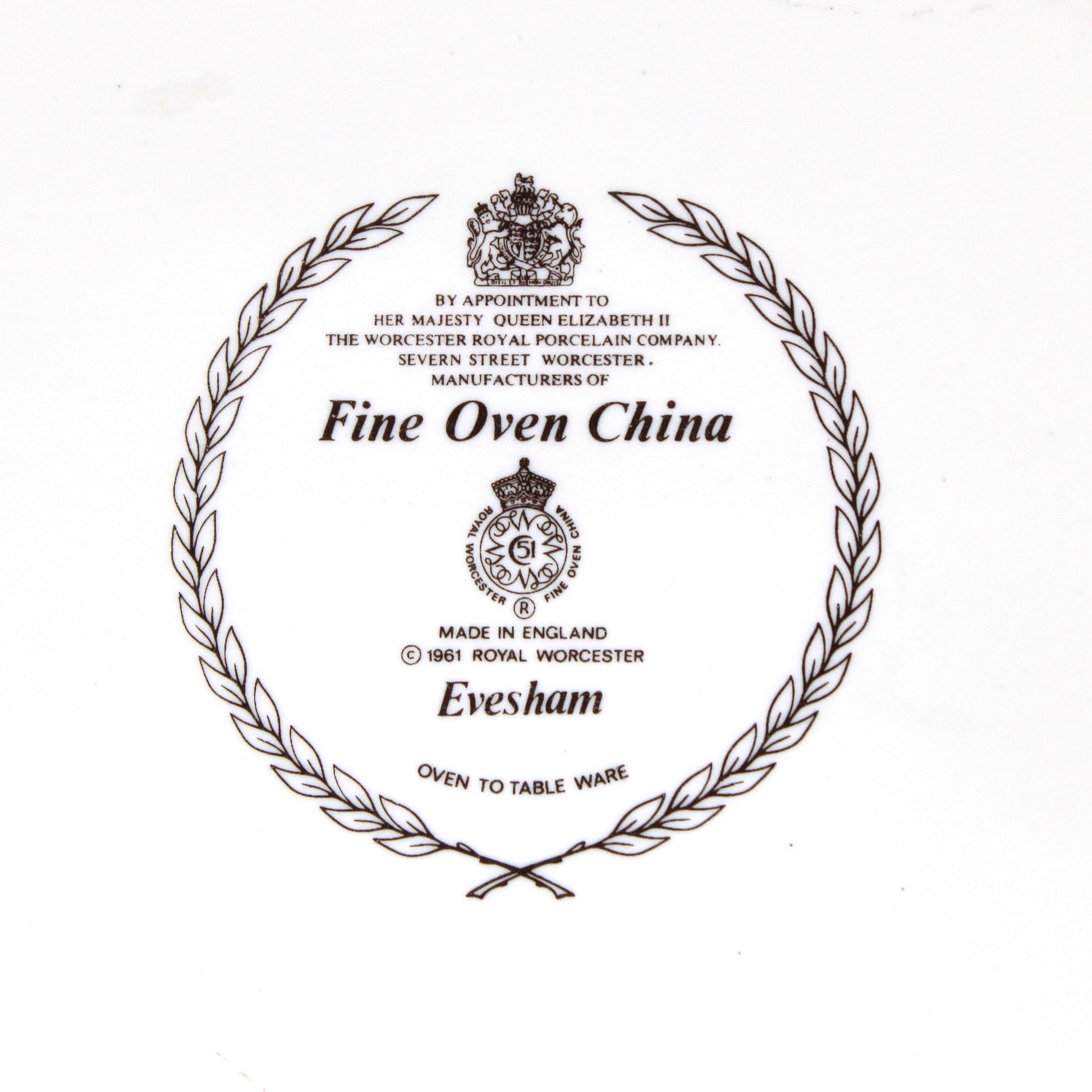 - Details: This exquisite Royal Worcester covered 2QT casserole is from the iconic Evesham Gold collection, a timeless classic. The oval design exudes elegance, making it the perfect addition to any sophisticated table. This one is ribbed, no handles and has a pointy oval finial on the lid. This is part of an entire dinnerware pattern that included not only plates, cups, etc., but also bakeware, servingware and many other items. Each piece has the same gorgeous bright white porcelain with colorful fruits and vegetables in different combinations, some have the gold rim, others do not, this one does, it is also ribbed. Hand Wash only. It is stamped on the bottom: "By appointment to Her Majesty Queen Elizabeth II, The Worcester Royal Porcelain Company, Severn Street, Worcester. Manufacturers of Fine Oven China, Made in England, 1961 Royal Worcester, Evesham, Oven to Table Ware". This is a very versatile pattern that can be "dressed up" for an elegant table or buffet, but with it's fruit & vegetables pattern, it's perfectly at home in a country, farmhouse or more casual setting. We especially love to use this beautiful pattern for Spring and Summer gatherings to delight guests and family alike. We carry other pieces in the Evesham pattern, please browse our site for Evesham.