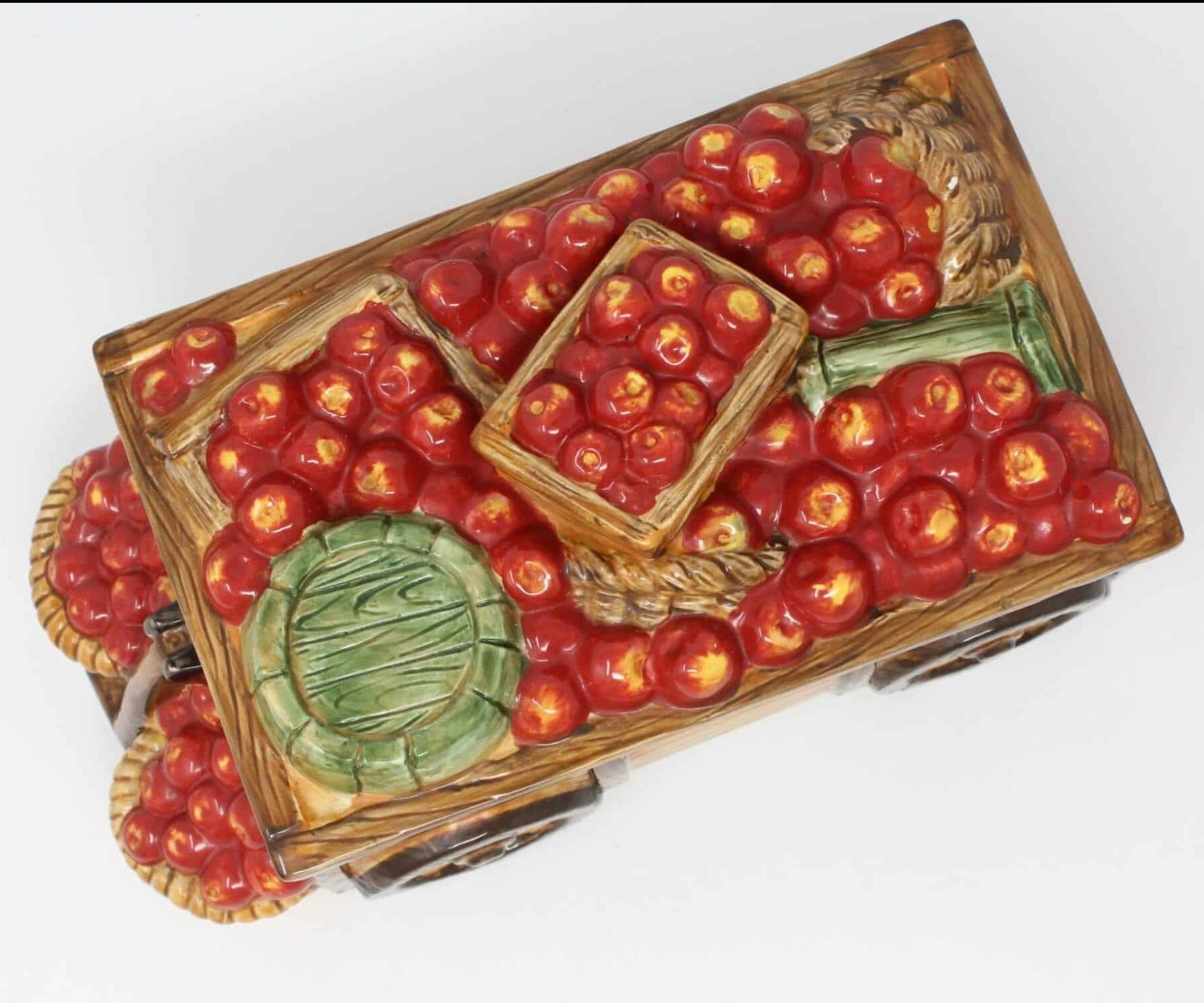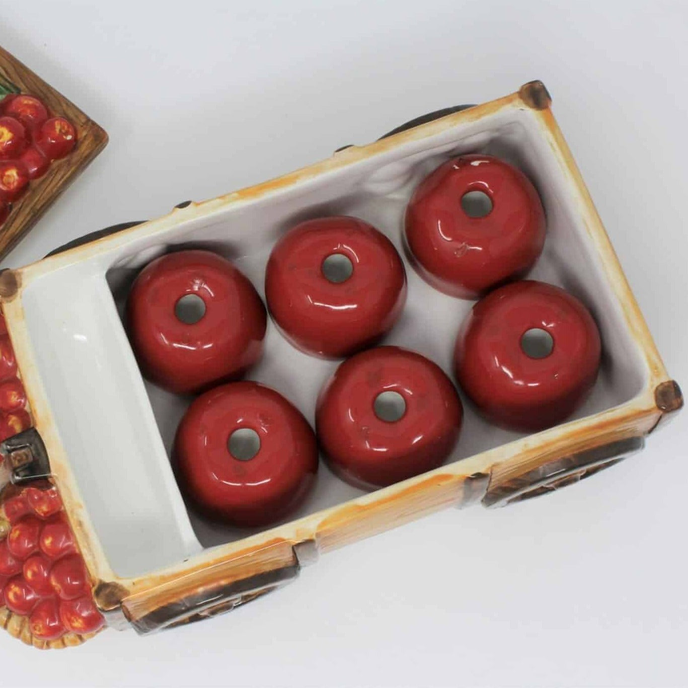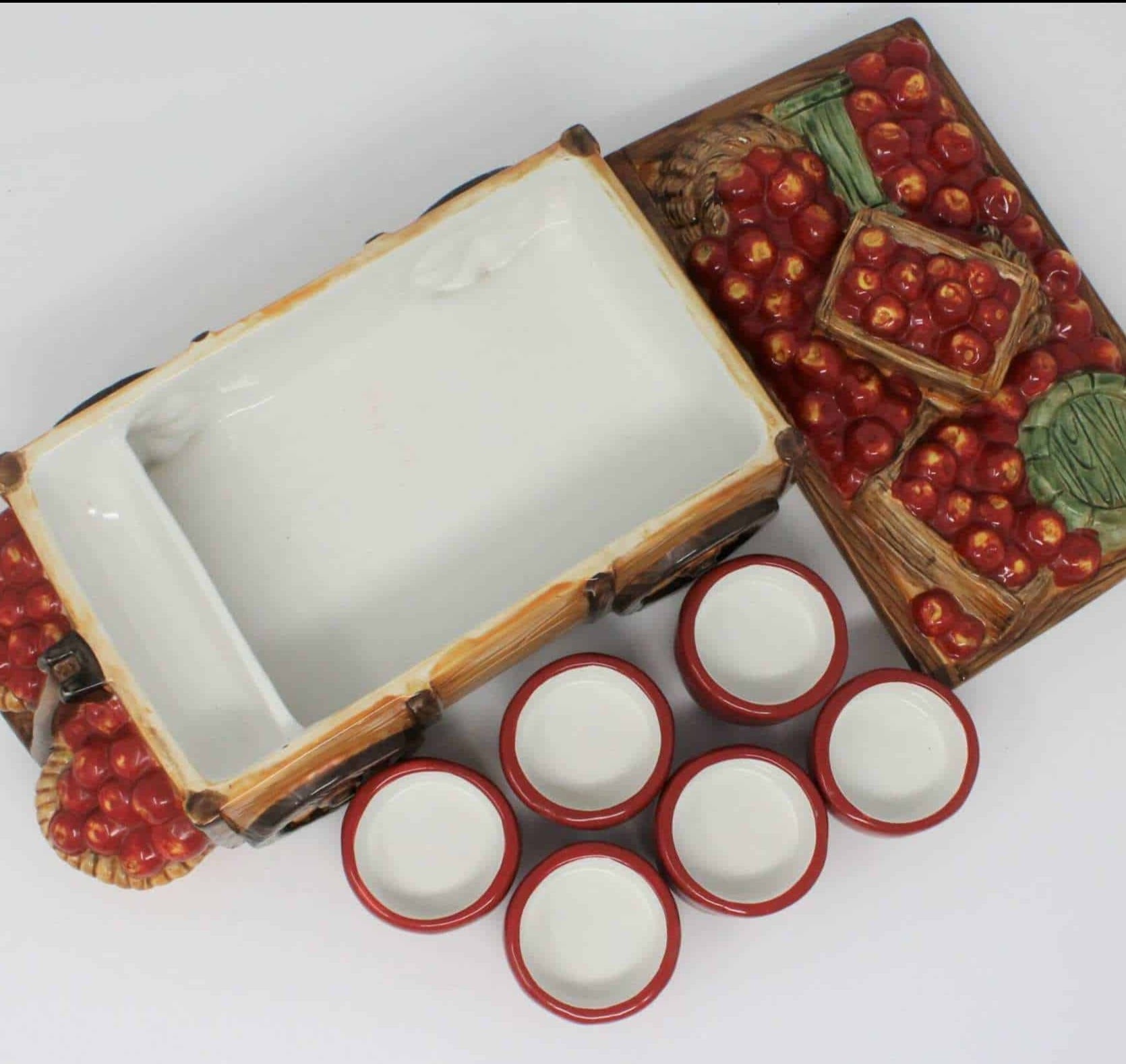 - Condition: Used. Very Good Condition. There is a chip on one of the little "apples" inside the cart, SEE PICTURES. Otherwise, there are no scratches, chips, cracks, stains, or other damage. Please review all pictures and make sure you love this item before purchasing, we can't accept returns. Please note these are USED items, they are NOT new, every effort has been made to show any scratches, wear and tear and imperfections.
