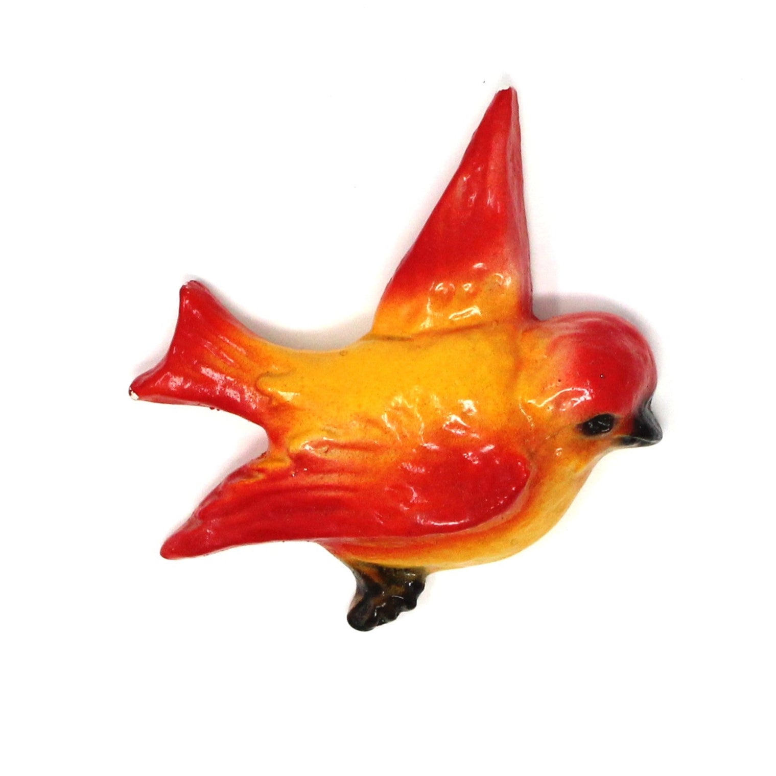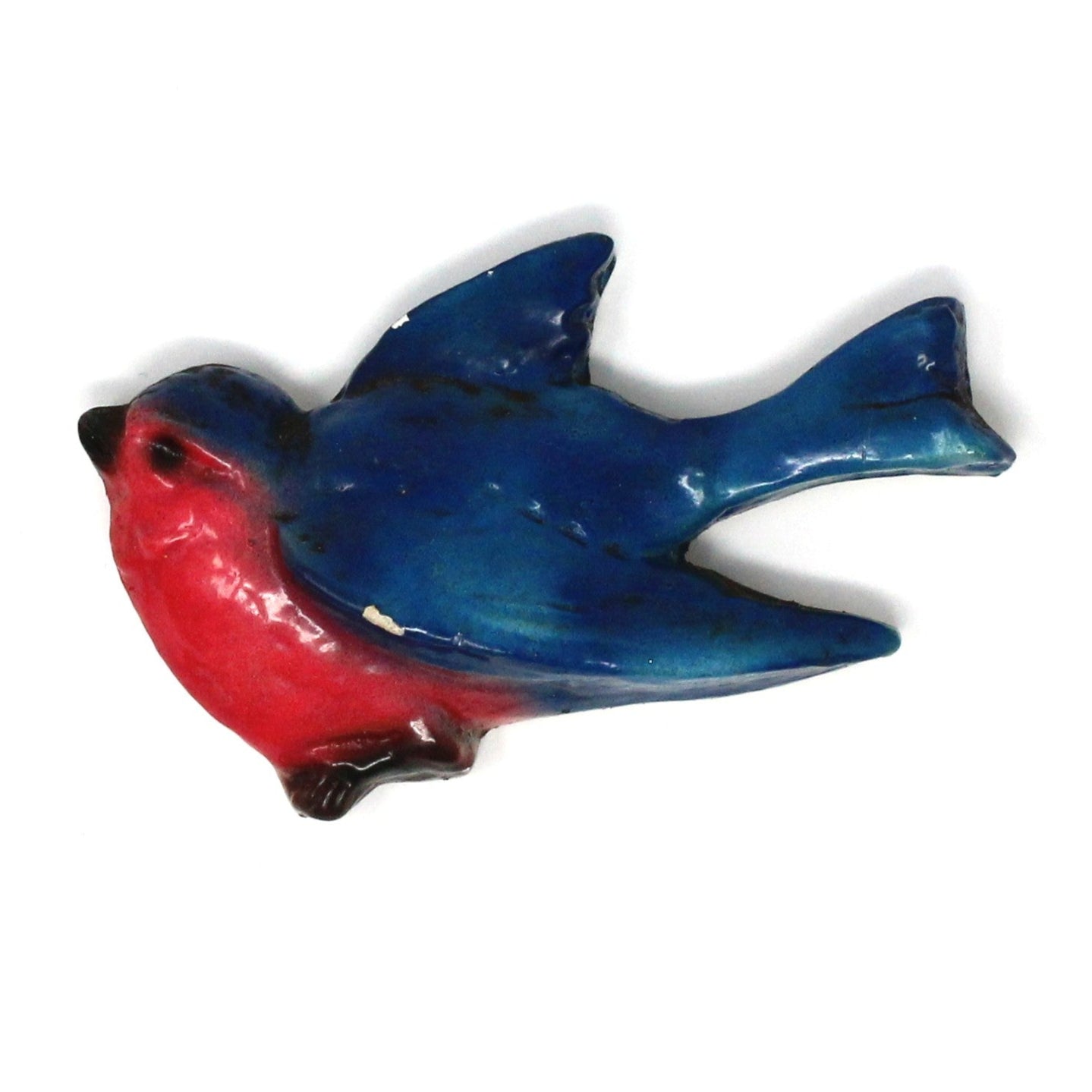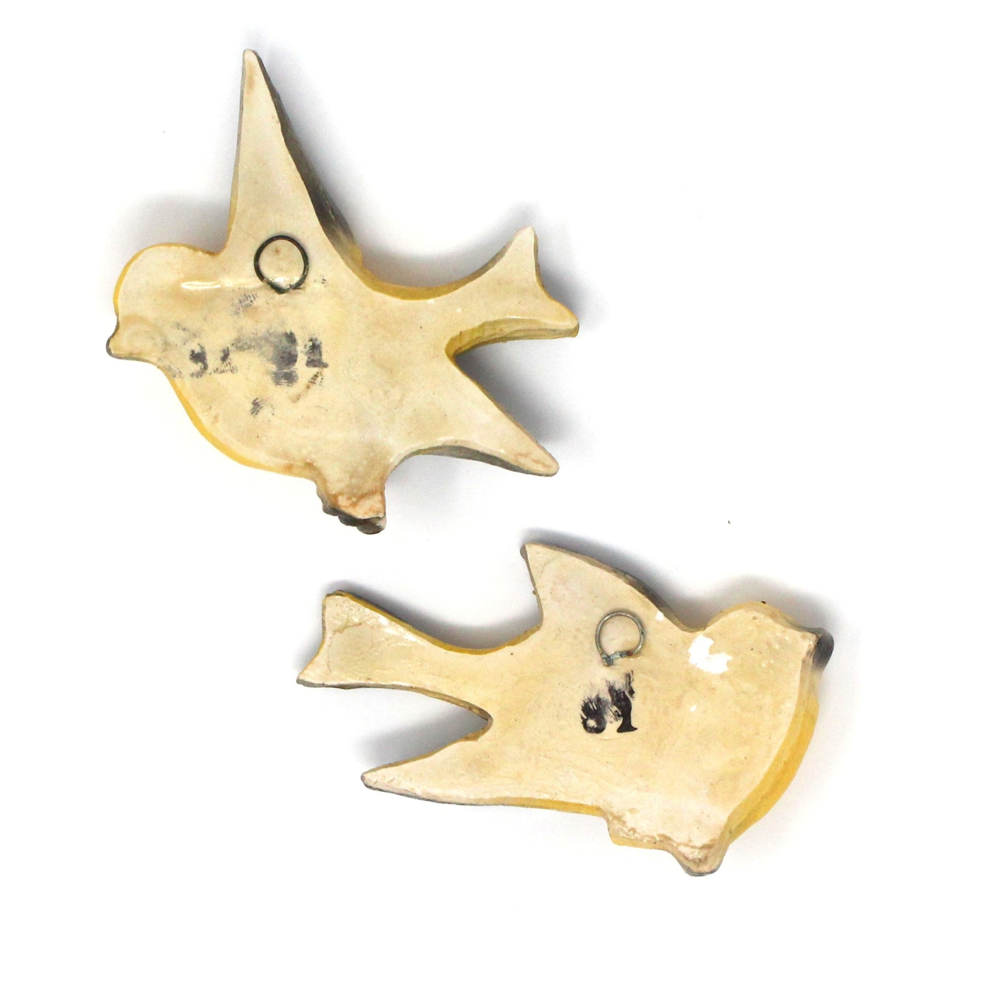 - Details: Absolutely adorable chalkware birds in flight to decorate your home! These are extremely rare, set of two birds, still retain their bright colors, and hook on back for hanging. We believe these were made in Great Britain in the 1950s and 1960s because these makers registered their wares under the Registered Designs Act of 1949. An easy way to do this was to assign the registration number on the item at the back, with a small number stamp. These are all stamped with a number, therefore, would make sense they are English, but only speculation on our part, fun to learn about these pieces. Perfect for Summer display or as a unique touch in any room. Although there are many chalkware birds for sale, these older ones are very hard to find, a great gift for a chalkware collector!