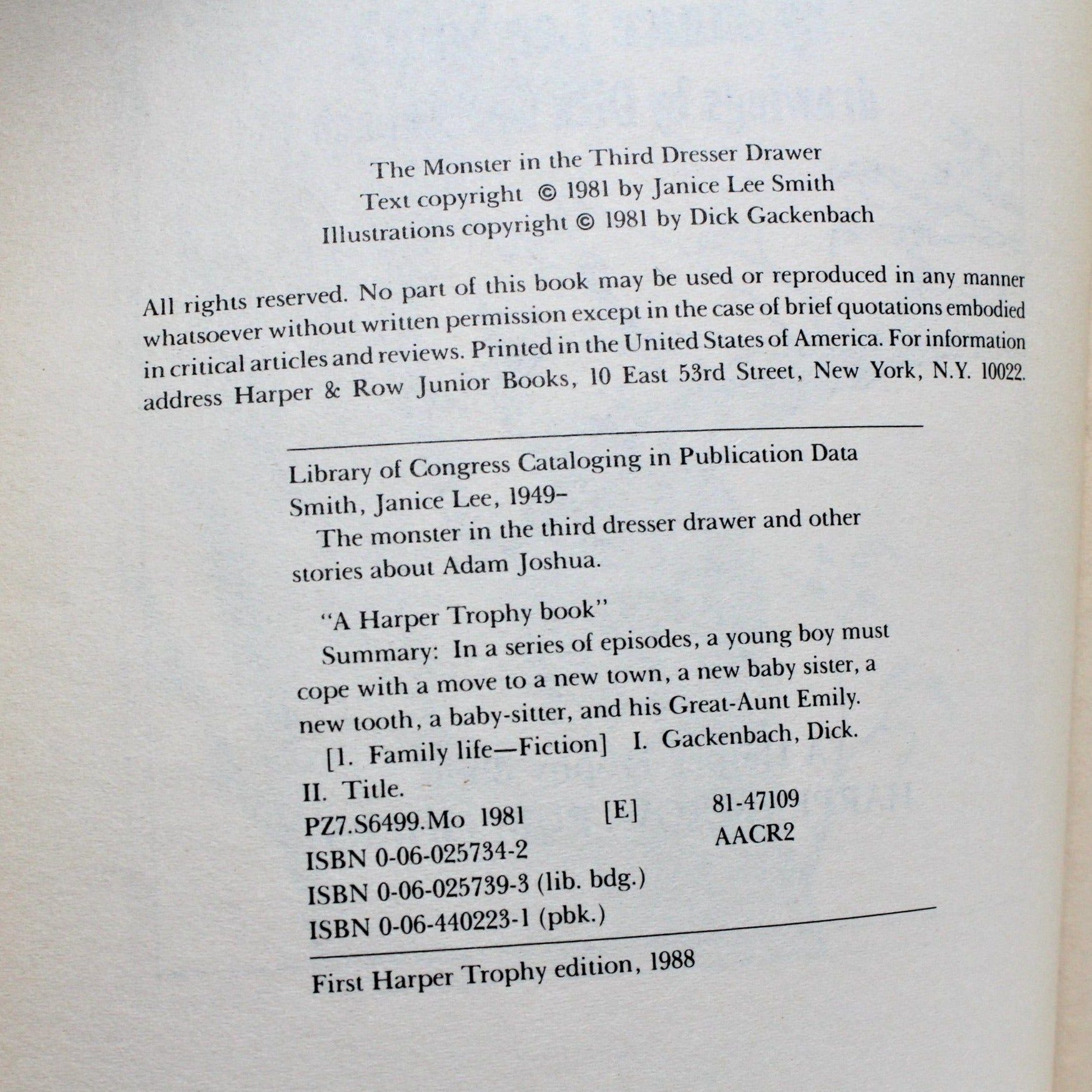 - Copyright: 1988, First Harper Trophy Edition