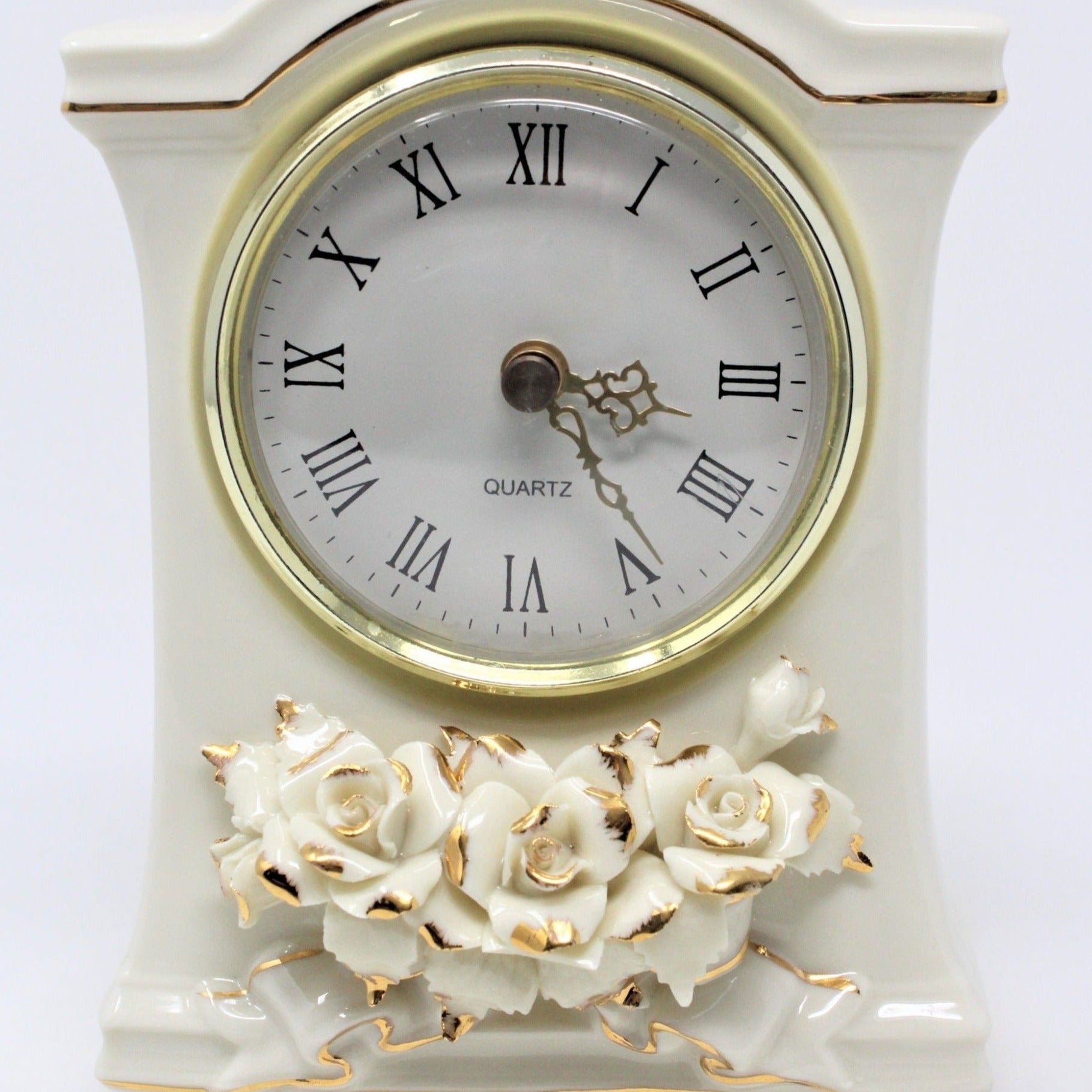 - Details: This is such a beautiful porcelain clock! It's not vintage but it is so pretty, we decided to bring it to you. The primary design is the hand applied porcelain roses in the center with the ribbon tails showing underneath, all accented in gold. But the shape of this clock adds to the beauty, it's shaped like an old antique clock with little feet and all. The clock is Quartz, has Roman Numerals and gold filigree hands. The clock piece is removable to change the battery, takes one AA battery and works perfectly. There is a condition issue, please see below for details. This piece is stamped: "Avon China, Chine Avon". This clock will look great no matter where you place it, a mantel would be great, a bedroom, girl's room, so many décor options!