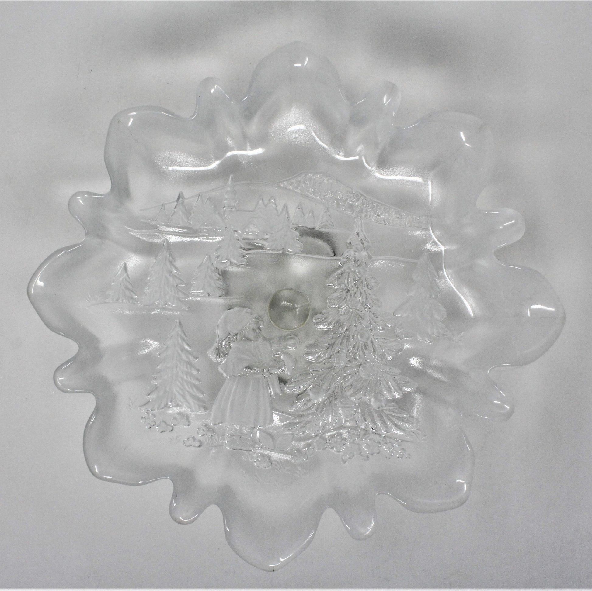 - Details: This is a very elegant footed serving dish, Mikasa calls it a Bon Bon Dish but we think there are so many uses for this beautiful piece, from the table to a buffet, even as part of your Christmas decor. It's from the Mikasa's Christmas Story collection, (aka Holiday Classic), originally issued only in clear, later in green & red and lastly only bordered in red or green. There's lots of detail in this piece, it's a winter scene with a girl standing in a pine tree forest, she has decorated a large tree with ornaments. There is a village in the background and mountains farther in the horizon. The pedestal bowl has a beautiful scalloped, frosted edge. This would make a great hostess gift with a home made dessert or cookies. A perfect addition to your Christmas table.