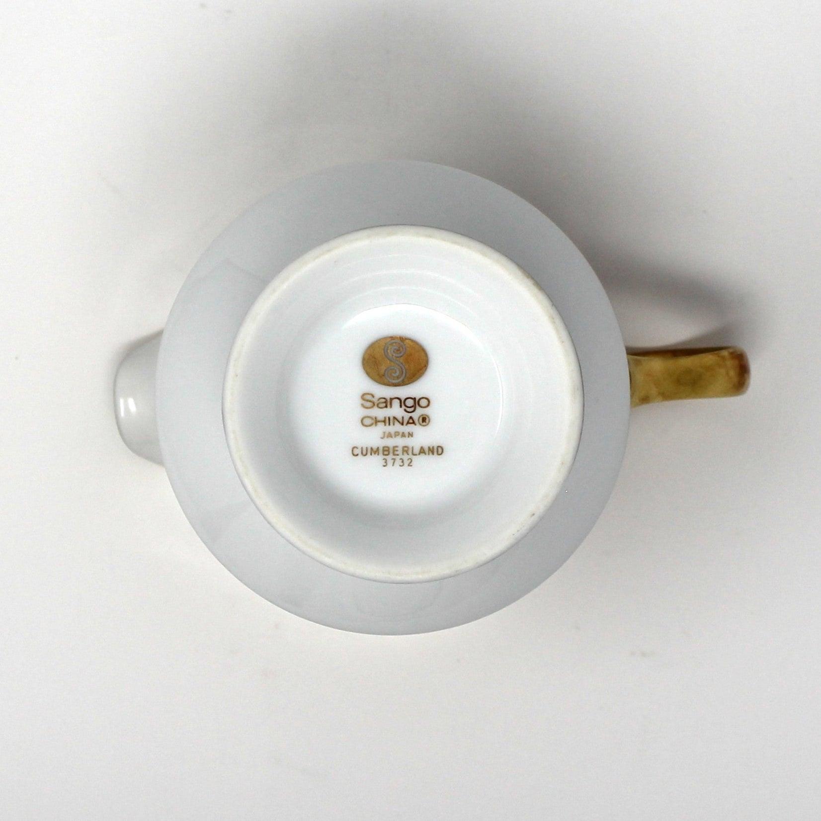 - Details: This is an absolutely gorgeous creamer! The pattern is called Cumberland, by Sango. It has large and small panels, in a rust/terracotta red and gold colors, all along the border with florals and other patterns. The smaller panels have hand painted moriage (raised) "dots". It's a very elegant pattern, reminds us of a romantic vacation in the Mediterranean, a Moroccan look. The back is stamped: "Sango China, Japan, Cumberland 3732". We know that Sango moved manufacturing to Indonesia in 1977, so this is pre-1977 and based on the logo, we believe it dates from 1960's to 1976. If you are trying to collect this pattern, or are looking for a beautiful creamer for your table or buffet, we hope this is a happy find. We carry other serving pieces in this pattern, please search our site to see all.
