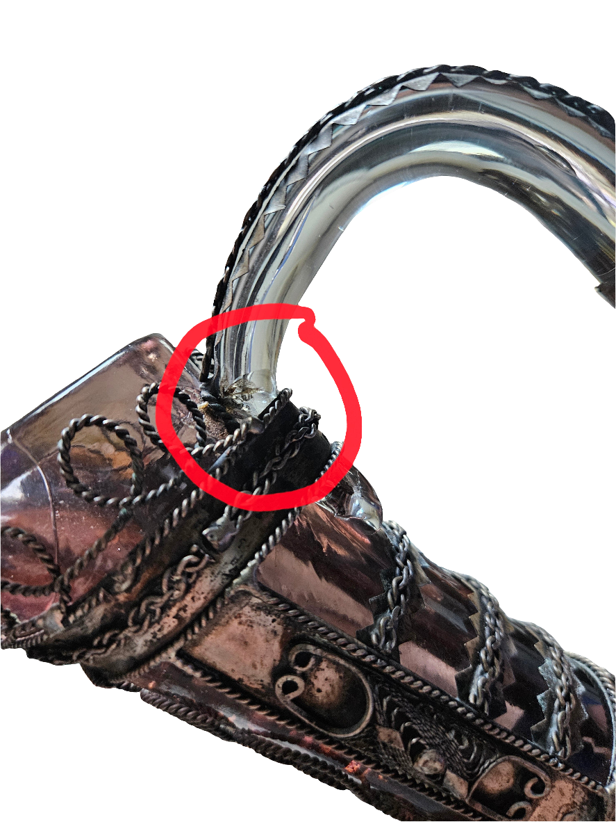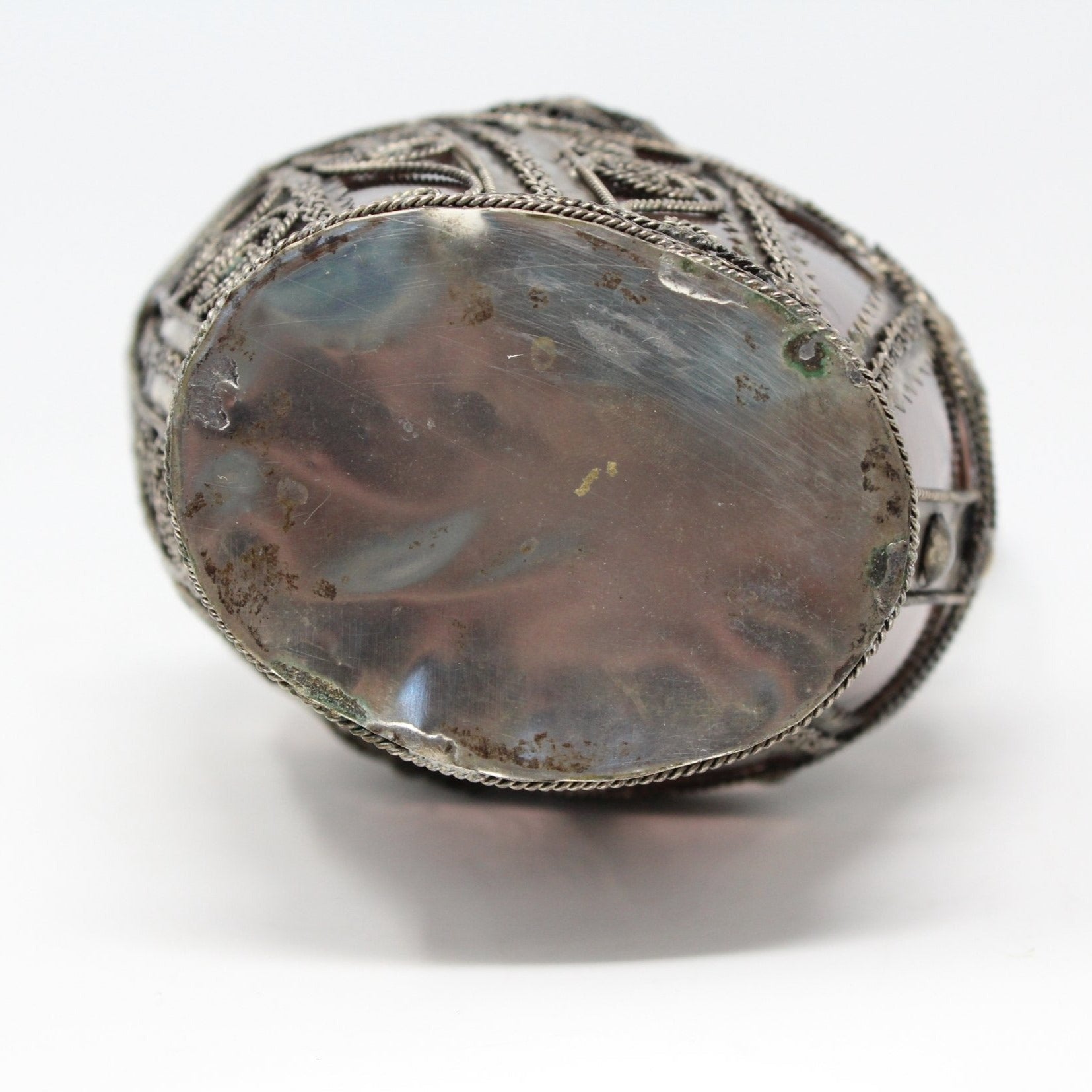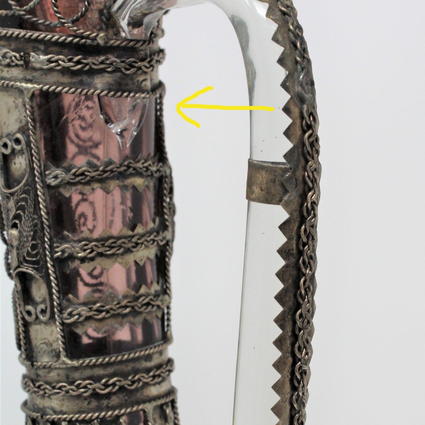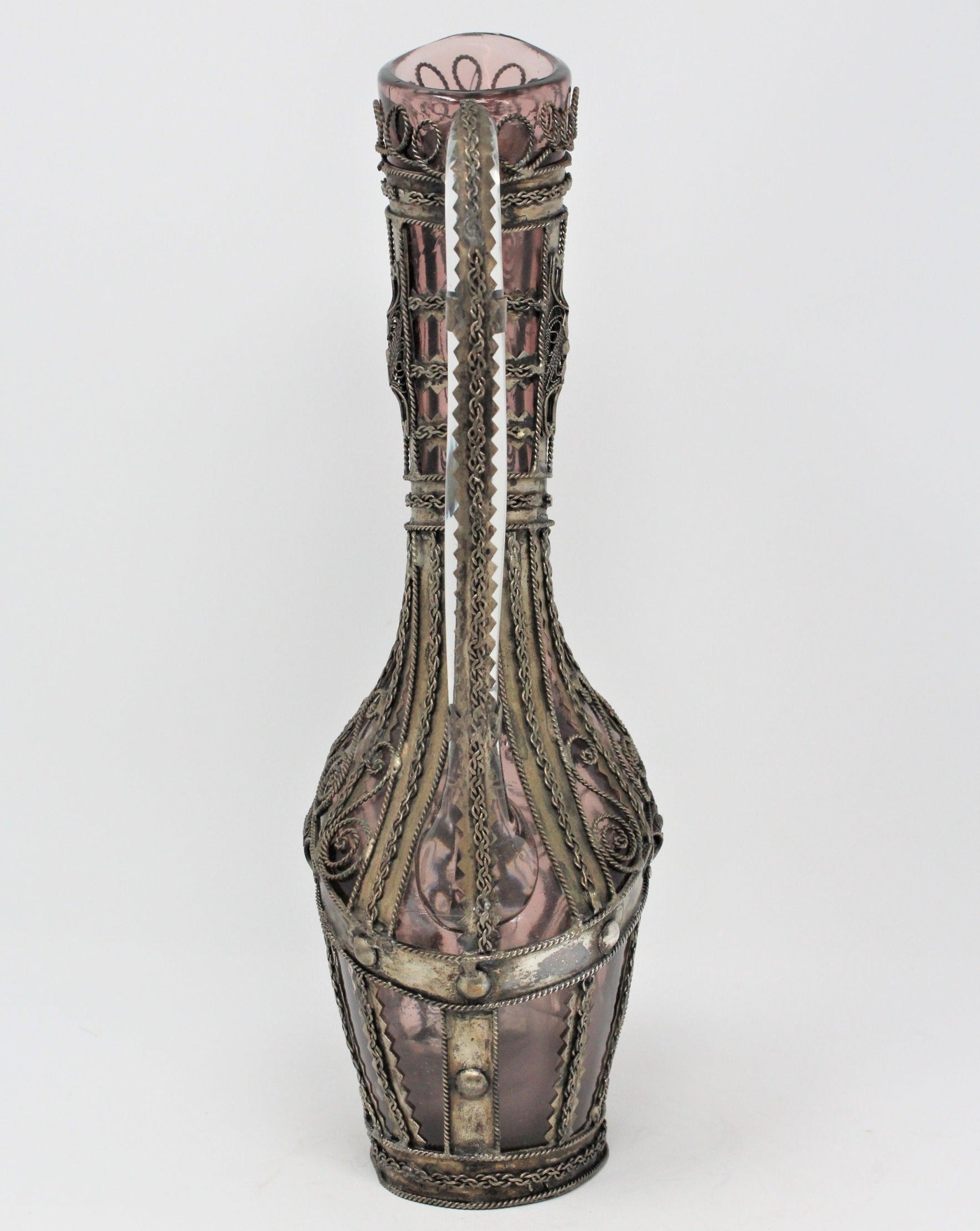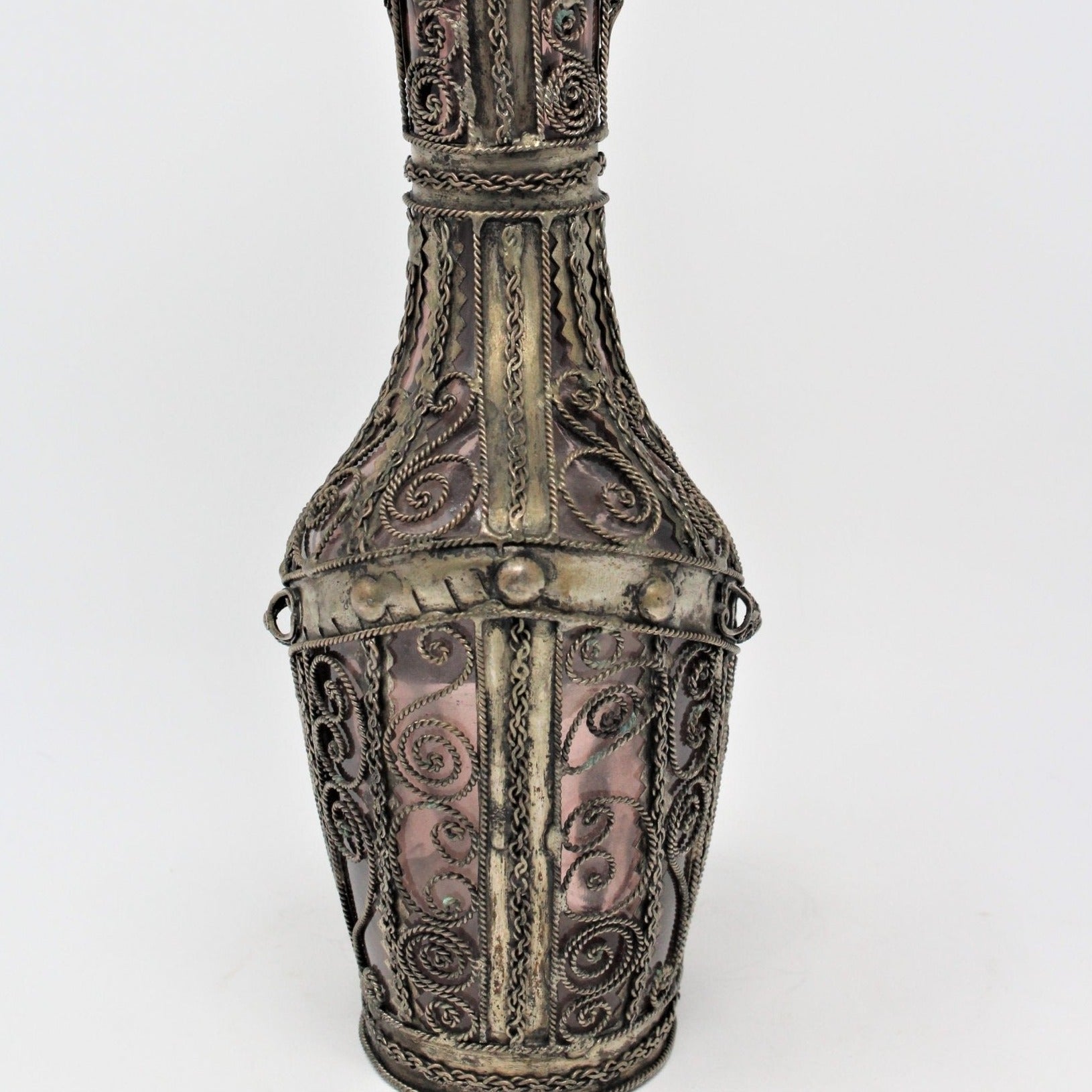 - Details: This exquisite vintage pitcher features a stunning amethyst glass vessel intricately encased in delicate filigree metalwork. The caged, some would say "wrapped", design combines artistry and function, making it a rare collectible piece that elevates any home decor. The entire piece is covered in this work, looks like it may have been soldered on, as far as we can see, the metal is not removable. Based on where we purchased it, and the owner's extensive travel habits, we believe it was purchased in Spain and brought home as a souvenir. We have other caged bottles in stock, (while supplies last), all came from the same estate, these pieces are extremely rare, hard to find. This unique craftsmanship style and rich color add a sophisticated touch to your display or collection.