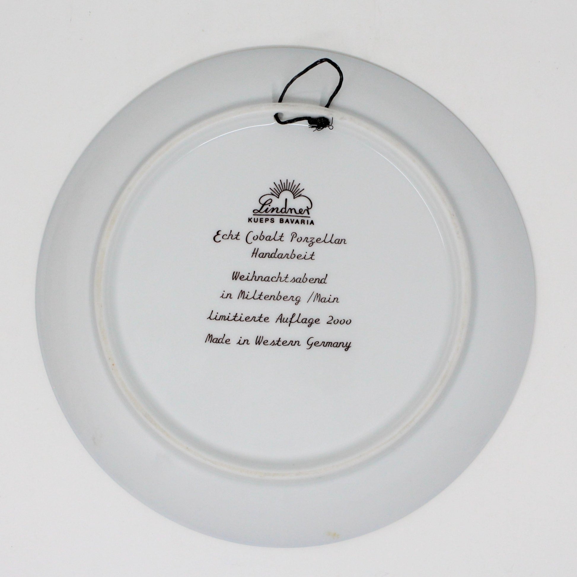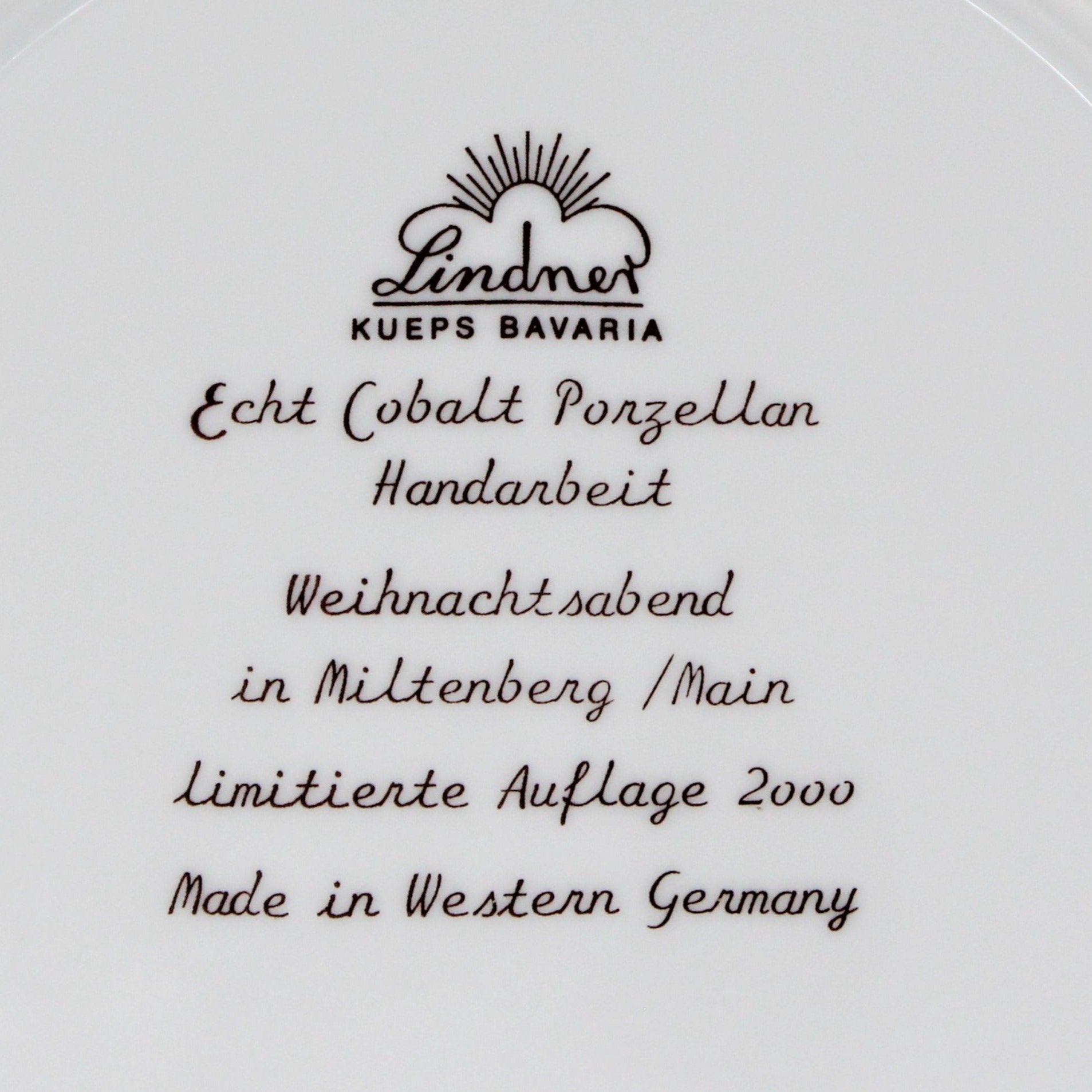 - Details: This gorgeous plate is part of the Lindner Kueps Bavaria Christmas plates collection that ran from 1972 to 1977. These are limited edition plates, this specific pattern is limited to 2000 plates, after they're issued, the mould is destroyed. These are fine porcelain collector's plates handmade in genuine Cobalt Porcelain. This is the 1975 edition which features a traditional Bavarian village (Miltenberg, a town in Germany), there's a father and child admiring the beauty of the very large, lighted Christmas tree in gold gilt. The back is written in German, but loosely translates to: "Genuine Cobalt Porcelain, Handmade, Christmas Eve in Miltenberg, (Weihnachtsabend in Miltenberg), limited edition 2000, Made in Western Germany". It has pre-drilled holes for hanging with wire, already added, we'll leave it on there for you, but feel free to exchange it for nicer looking wire. Great addition to a blue and gold Christmas decor theme. We carry several other plates, if you would like 3 or more Decorative Plates (mix and match from our entire Decorative Plates section), please Contact Us for 20% off, don't forget to let us know which 3 plates you would like.