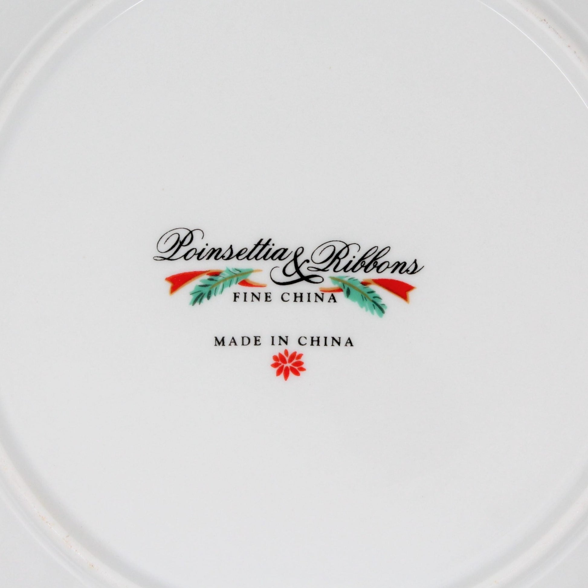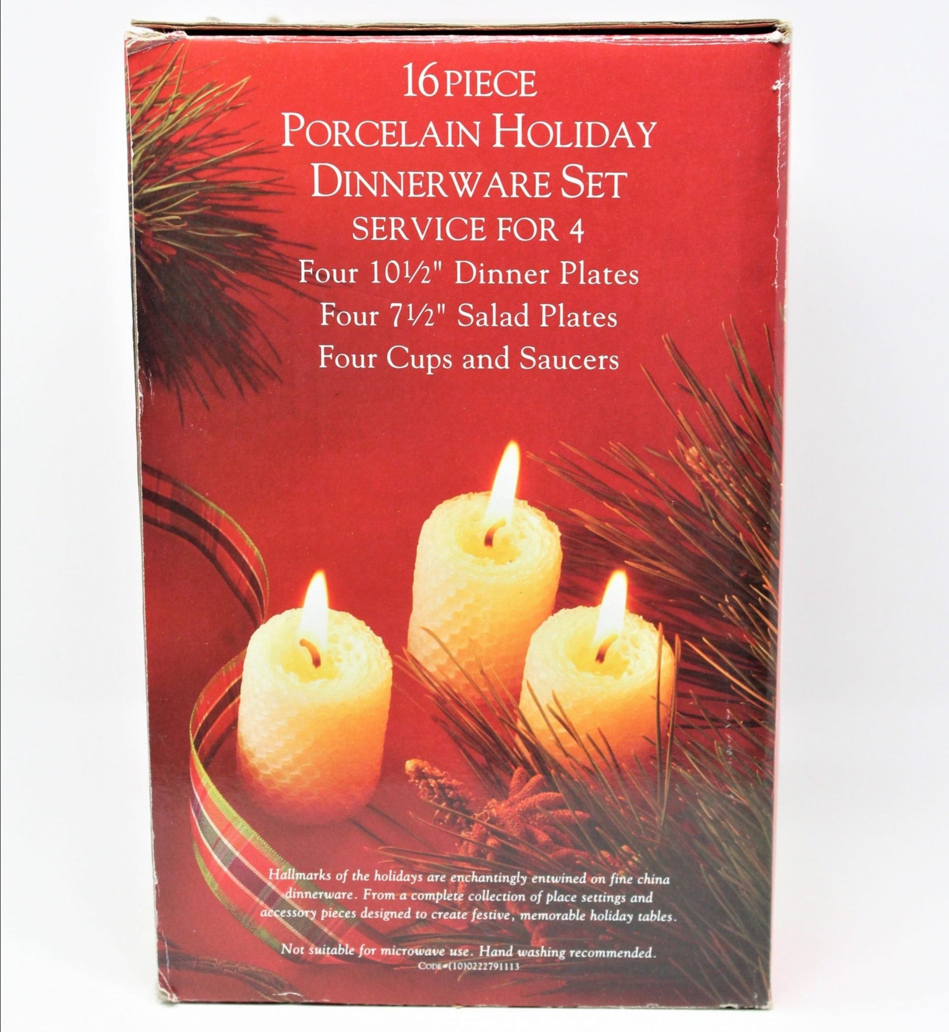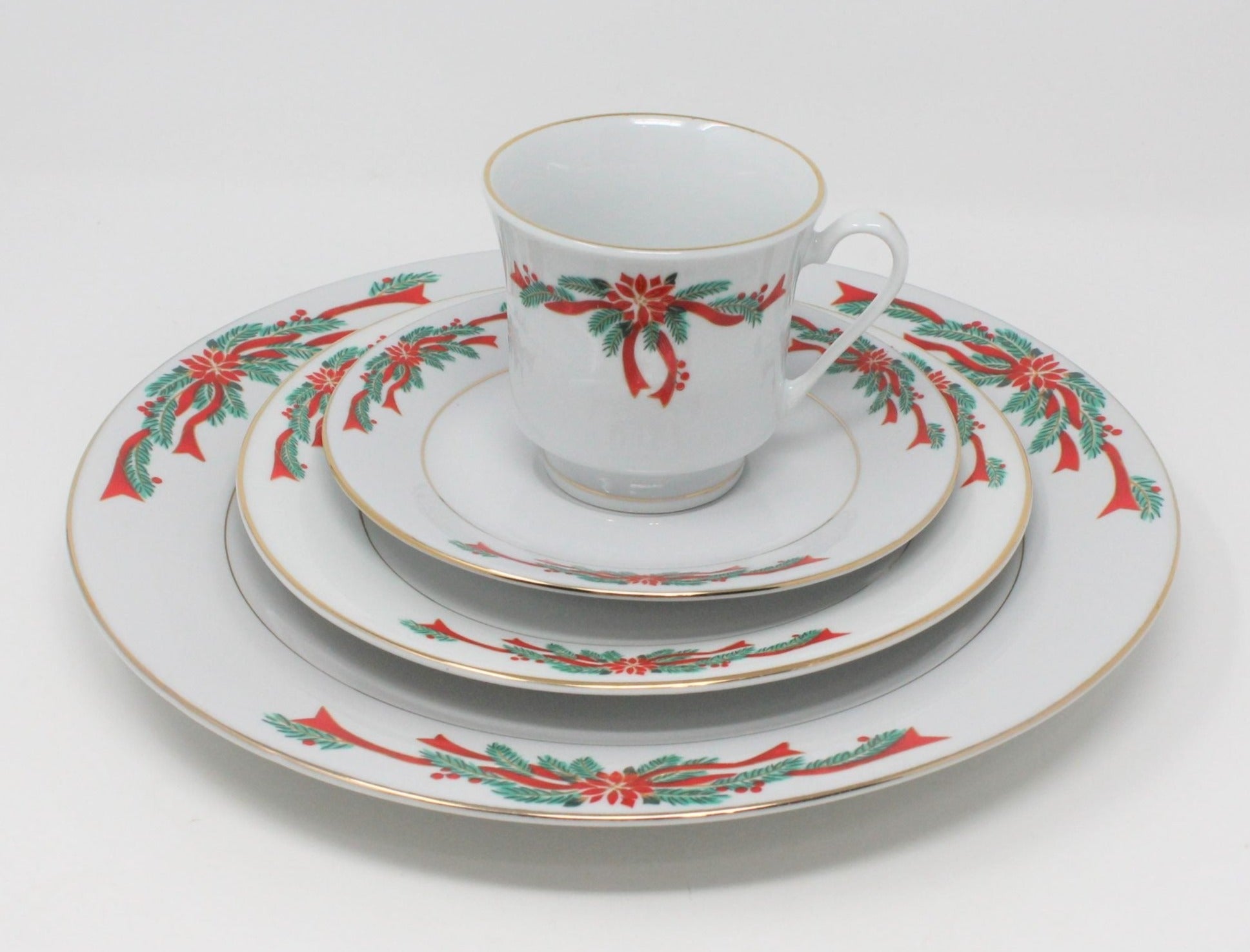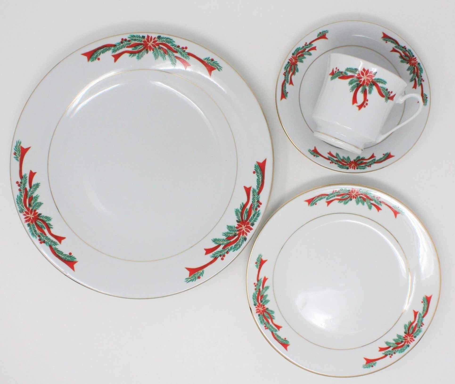 - Vintage Dinnerware Set, Poinsettia and Ribbons, Christmas Tableware, Holiday Table Setting, In Original Box, Place Setting for Four, (Discontinued)