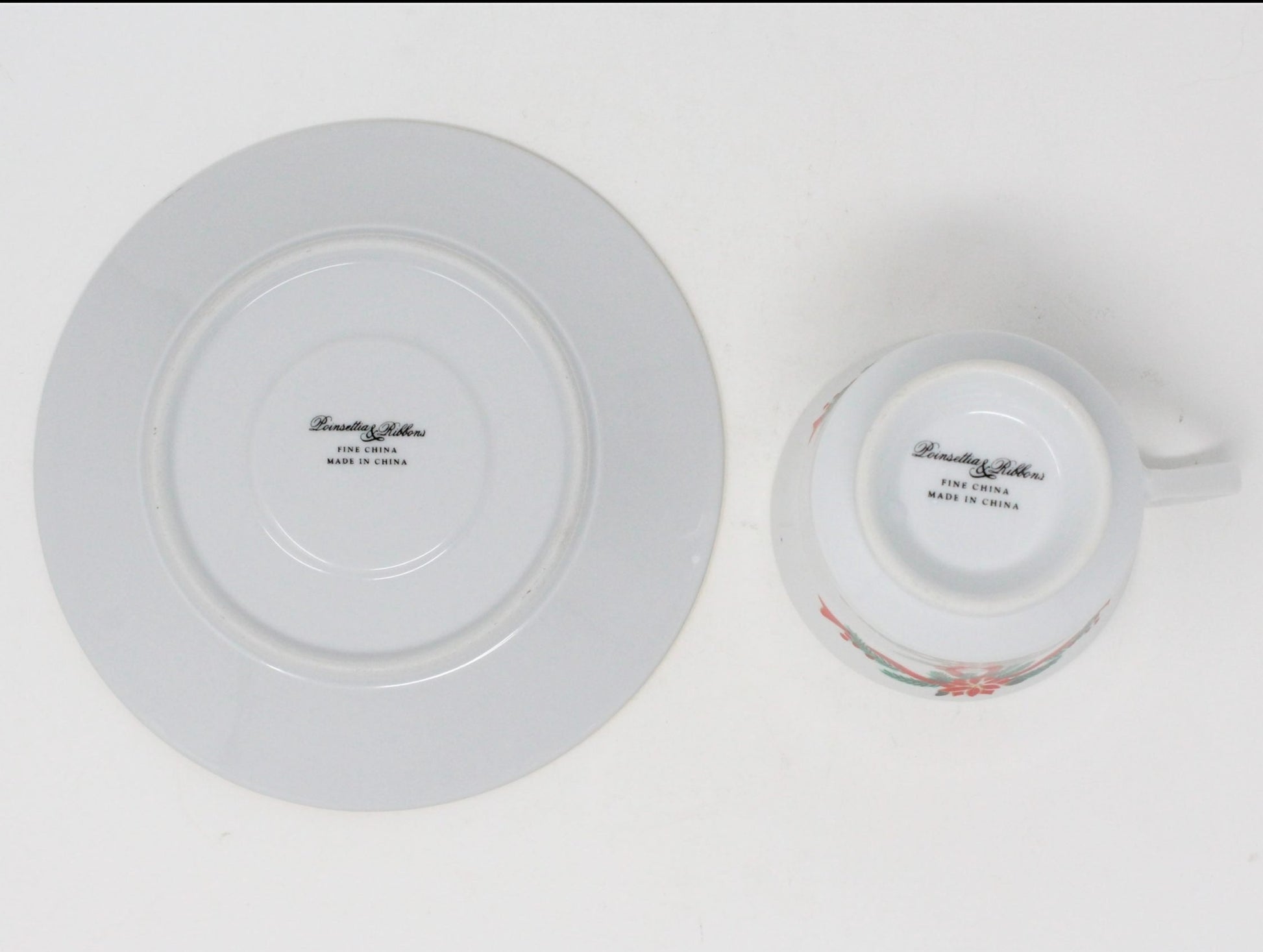 - Details: This is a wonderful dinnerware set, absolutely perfect for all your holiday gatherings! The pattern has a red Poinsettia in the center of a holly swag with red ribbons and berries all around. This set has an elegant loo, yet casual enough to use all throughout the holidays. Hand Washing is recommended to protect design. It is made by Tienshan Fairfield Fine China, all the pieces have a clean, retro shape. Each place setting consists of four pieces: 1 Dinner Plate, 1 Salad/Dessert Plate, 1 Cup and 1 Saucer and there are 4 place settings in each box. That's 16 pieces of beautiful vintage Christmas tableware! Great for mixing and matching with other pieces in solid green, red or even gold. We have two boxes (that's 8 complete place settings), if you would like to purchase both sets, please use the Contact Us, or email us at antigotrunk@gmail.com for a 20% discount code. We carry other matching pieces in this pattern: salt & pepper, creamer (Sold Out) and mug set (Sold Out).