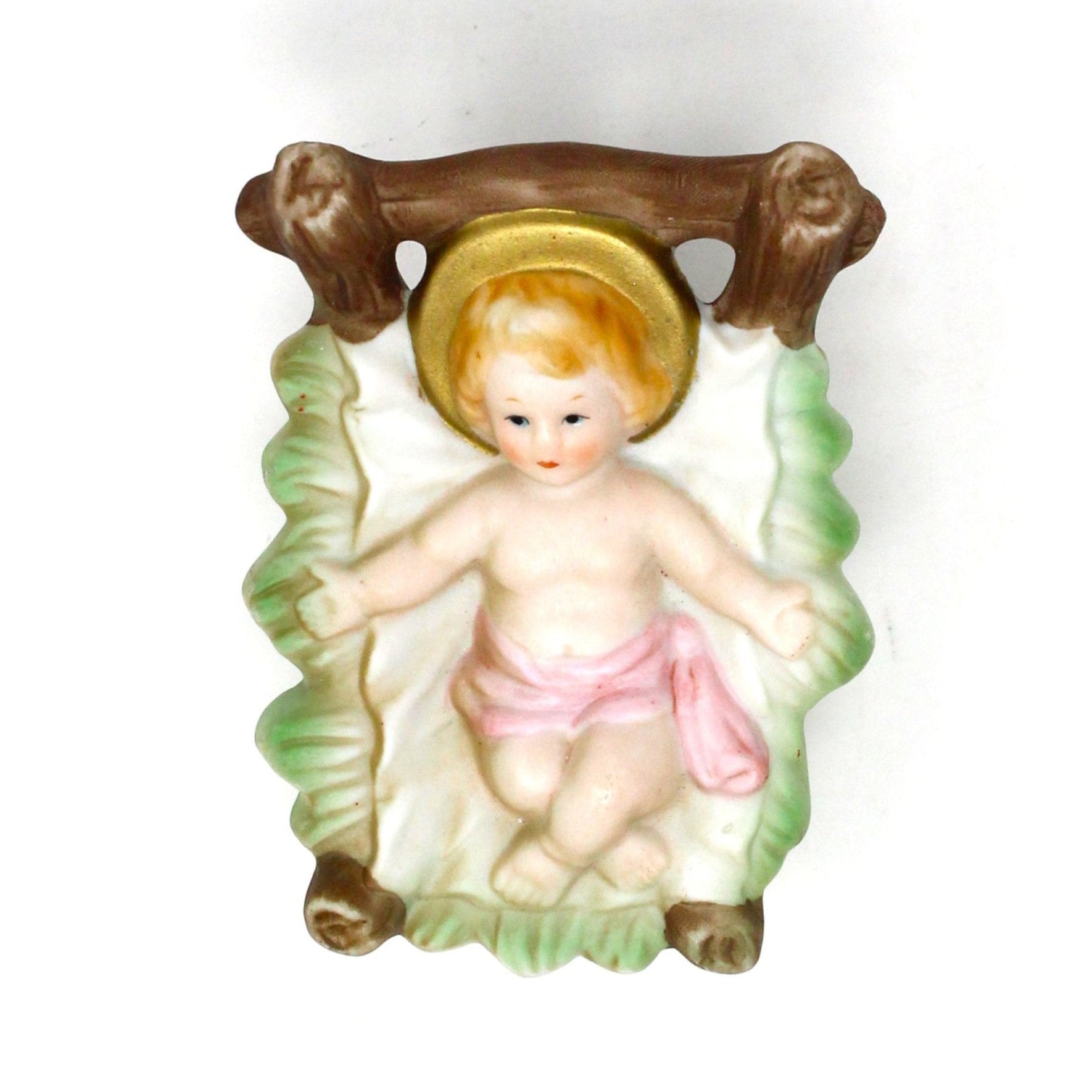 - Details: This is a hard to find vintage figurine of baby Jesus in a manger from Brinn's.  It is hand painted porcelain, with a gilded halo and the sweetest face we've seen in a long time, exceptional craftsmanship.  We only have the baby Jesus, can be used on its own, or it will make a great replacement for your nativity set.  It retains the original foil label that reads: "Brinn's PGH, Made in Japan."  Brinn's was an importer of ceramic decor like planters, vases, figurines, and tableware but most famous for their lady head vases (more below).  We were unable to date these but based on their style, we're thinking circa 1960's to 1970's  There is no better symbol of Christmas than the Baby Jesus, we hope this is a welcome addition to your Christmas holiday decor.