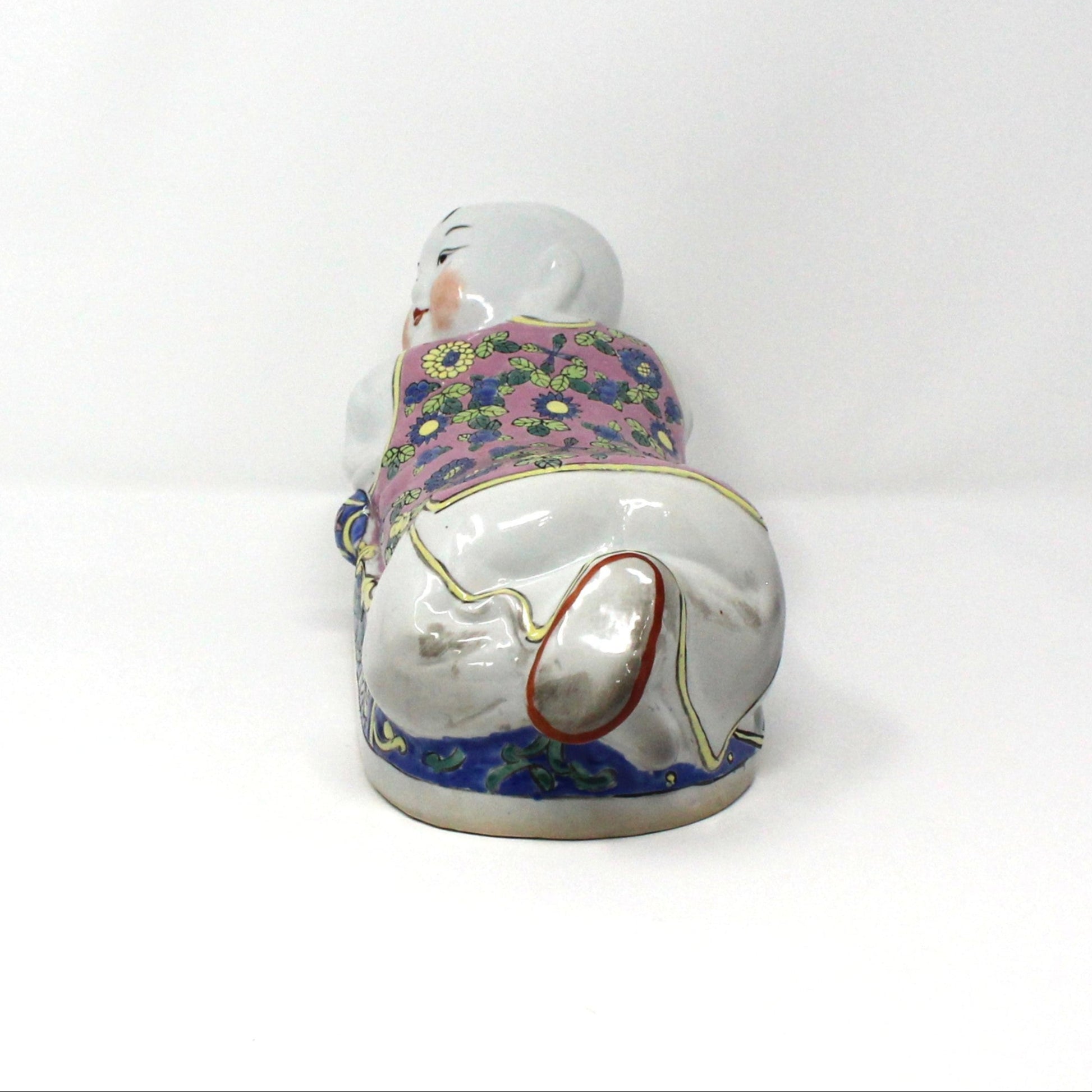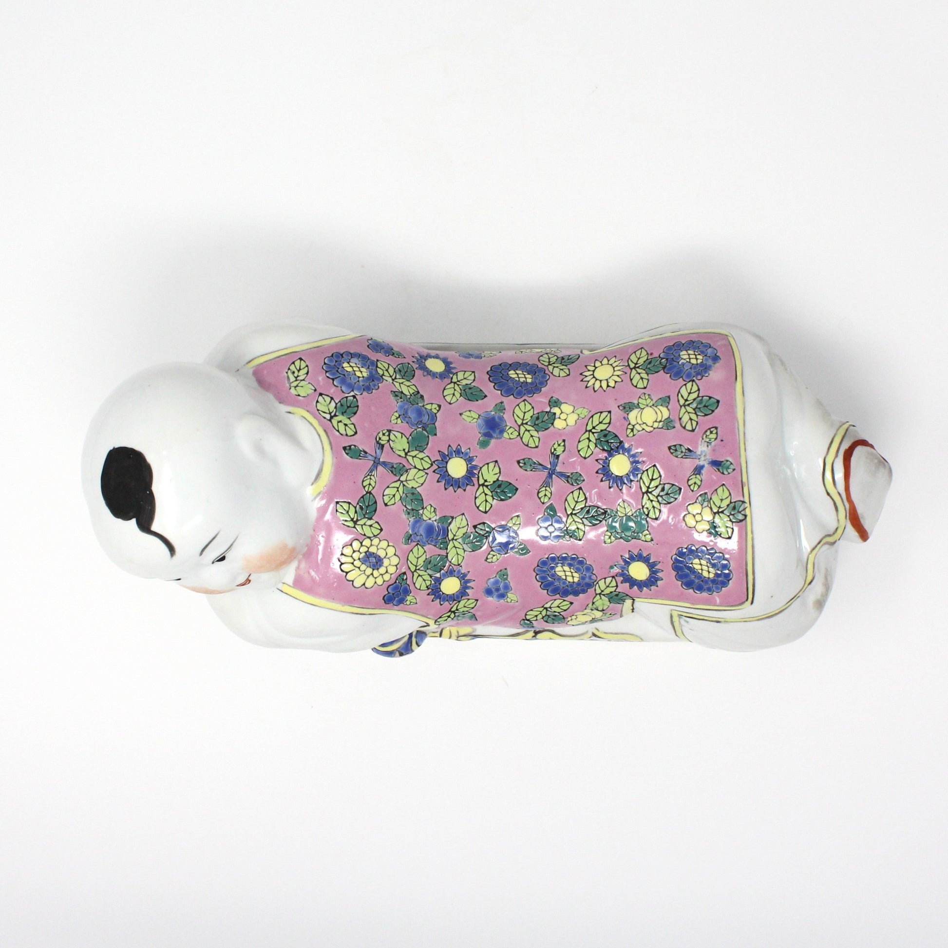 - Details: This large Chinese headrest in the form of a reclining child is a unique and charming addition to any Asian-inspired home decor. Hand-painted enamel with a happy floral pattern, in pink, blue and yellow. Known as an opium pillow or porcelain pillow, originally made from the 10th to the 14th century, and shaped like animals, plants or small children, with a curved top surface for the head, this one is not nearly as old, a 20th-century replica, and highly collectible. Made of heavy ceramic, this person-shaped figurine adds a touch of chinoiserie to any room. This one is unmarked so we're unable to tell more about its history or maker. It is large, 12" Long and very heavy, (almost 4lbs prior to packaging), will need lots of packaging to arrive safely. Please keep this in mind at check-out.