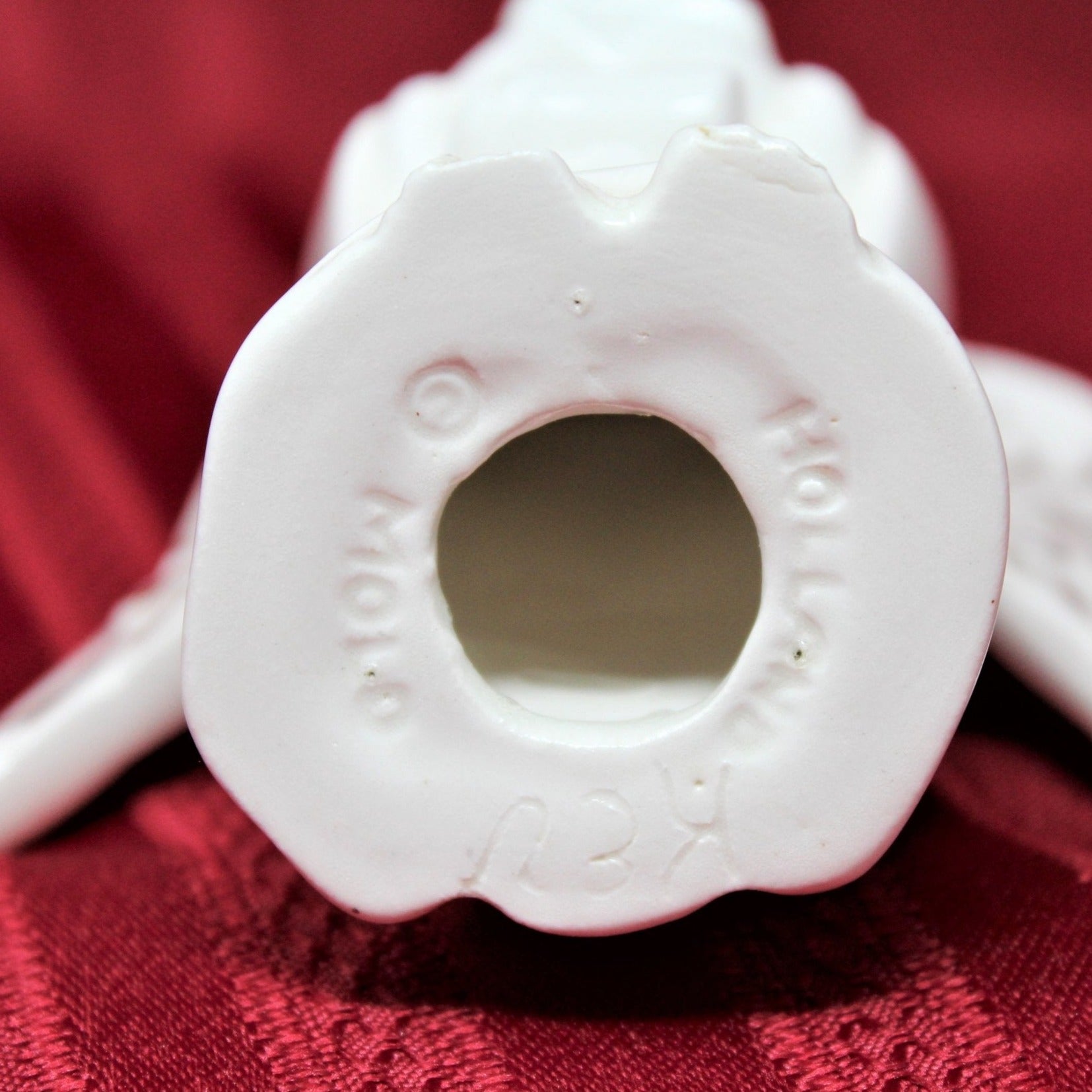 - Details: This heavenly angel is hand painted. These molds were sold as ceramic blanks for people to paint them in their choice of colors. We loved the simplicity of this one, white with a high shine glaze and a few simple gold accents on the wings. She is holding a song sheet, we're sure she's part of a heavenly choir. The bottom is embossed "Holland Mold" and looks like "Kev" painted it. She does have some condition issues, but we didn't want to leave her behind, hope you love her too. Please see Condition below.
