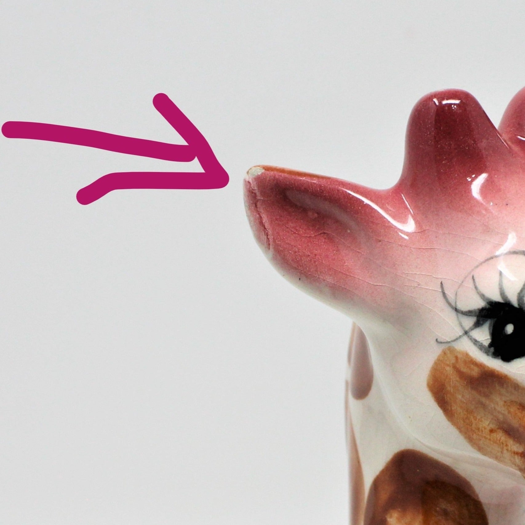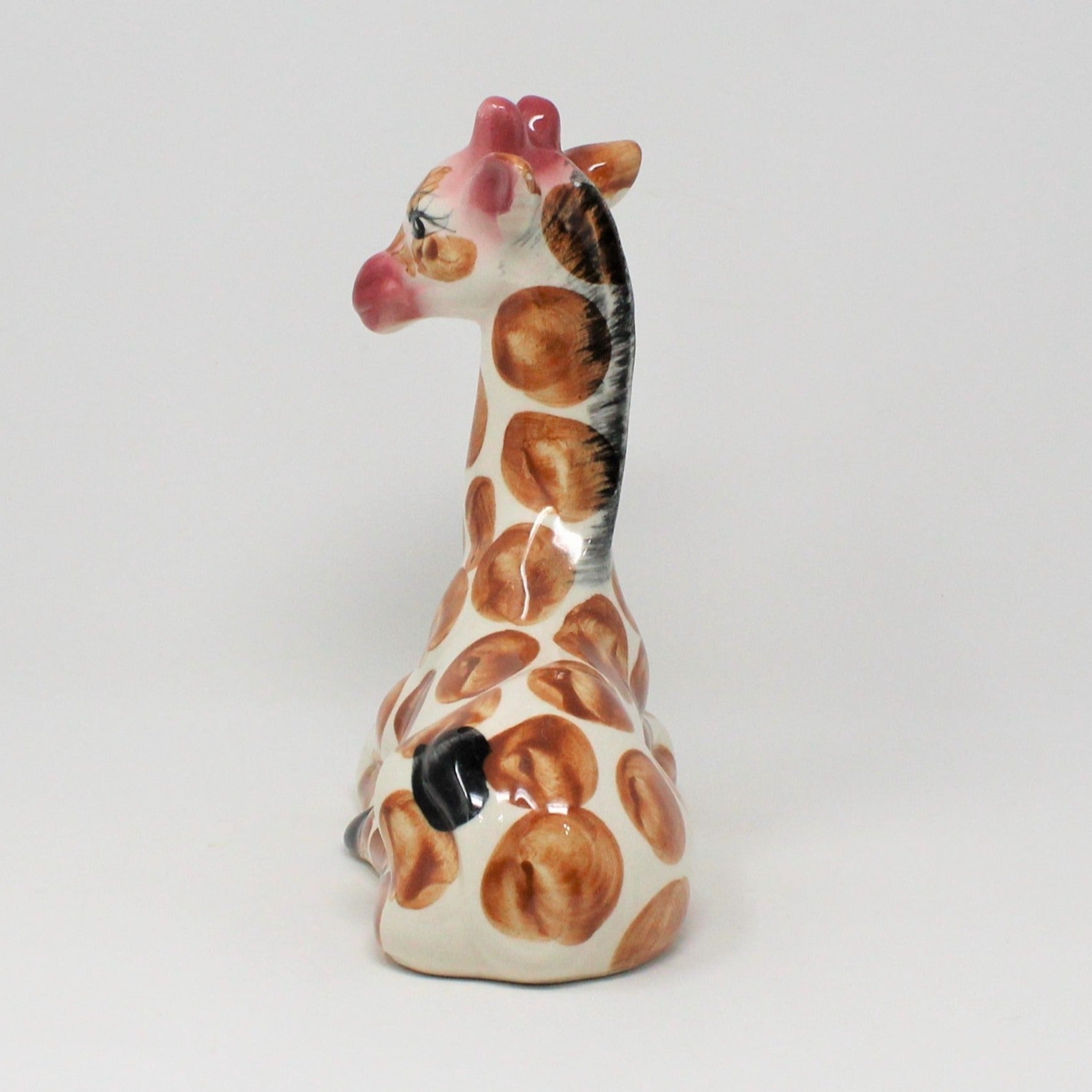 - Details: Adorable giraffe figurine, it is hand painted, and based on where we acquired it, we estimate it to be from the 1990's, perhaps earlier. It has an adorable face, sweet expression and a wonderful design. Looks to be from a mould, but there are no marks or signature. The colors are bright and cheerful, we think this is perfect for a child's room. Cute gift for a giraffe collector! There are some minor condition issues, please see below.