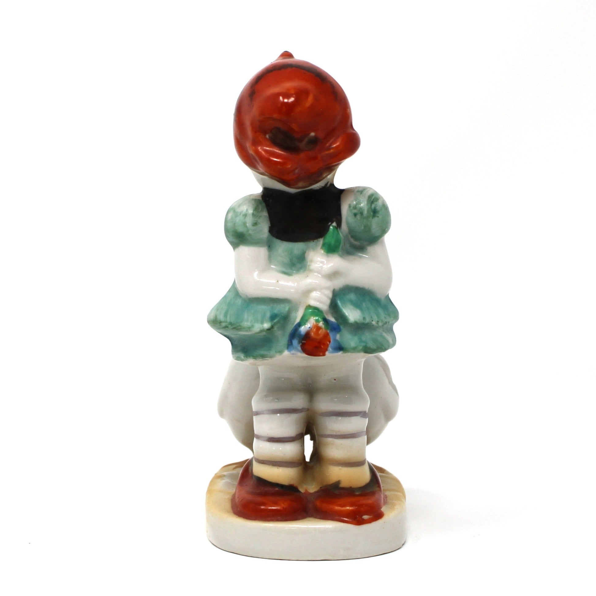 - Details: This vintage hand-painted porcelain figurine captures the charm of a Hummel-style Goose Girl, imported from Japan. Its delicate craftsmanship and detailed design make it a distinguished collectible, perfect for enhancing in little nook in your home, or adding a nostalgic touch to a girl's room. The colors on this figurine are all matte, except for the white areas which are glossy. The face is wonderfully painted with great detail. The bottom is simply stamped: "Japan". A timeless piece for enthusiasts of classic figurines and Japan porcelain imports. Perfect for a figurine collector!