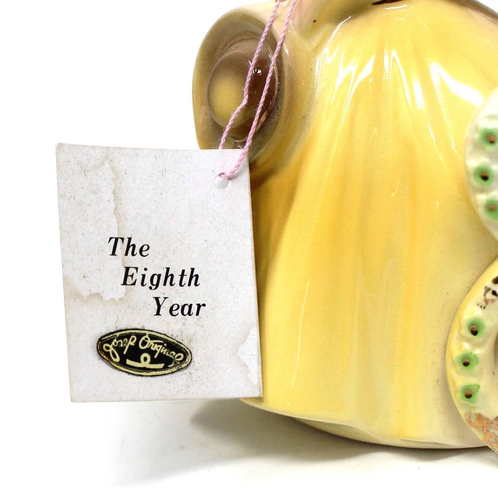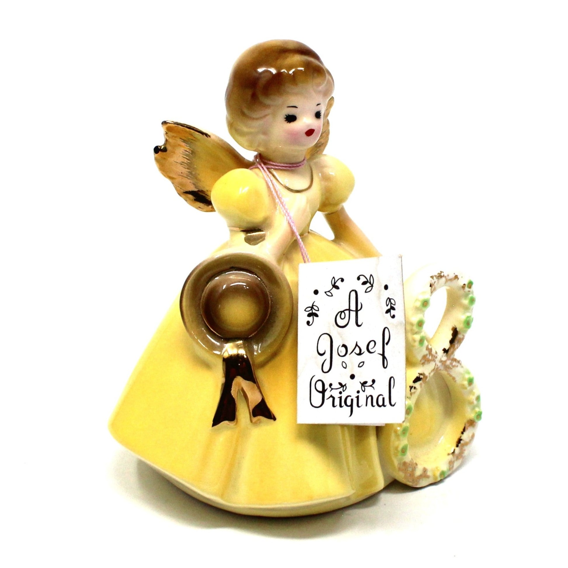 - Details: This is such a sweet figurine! It's from one of the most collected figurine series, "Birthday Angels" by Josef Originals. This sweet little girl is turning Eight and she's ready to celebrate with a pretty yellow dress and summer hat. There's gold gilding on her waist, sleeves, collar and on her beautiful wings. This is one of the earlier dolls, the ones collectors clamor for. It has the desired black eyes, the Josef Originals signature plus a "C" within a circle on the under-glazed bottom. She also retains the original black foil "Japan" sticker plus the original hang tag with "Josef Originals" black & gold foil sticker. A wonderful birthday gift for an eight year old, and a great time to start her own collection! This is the perfect gift for a collector or as a replacement for a broken figurine.