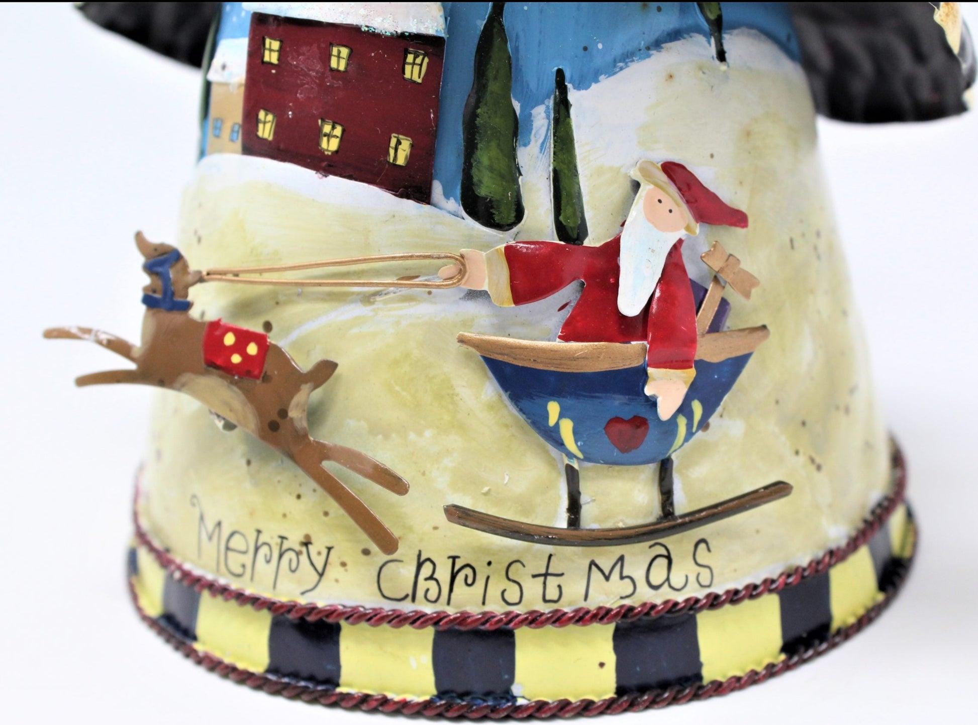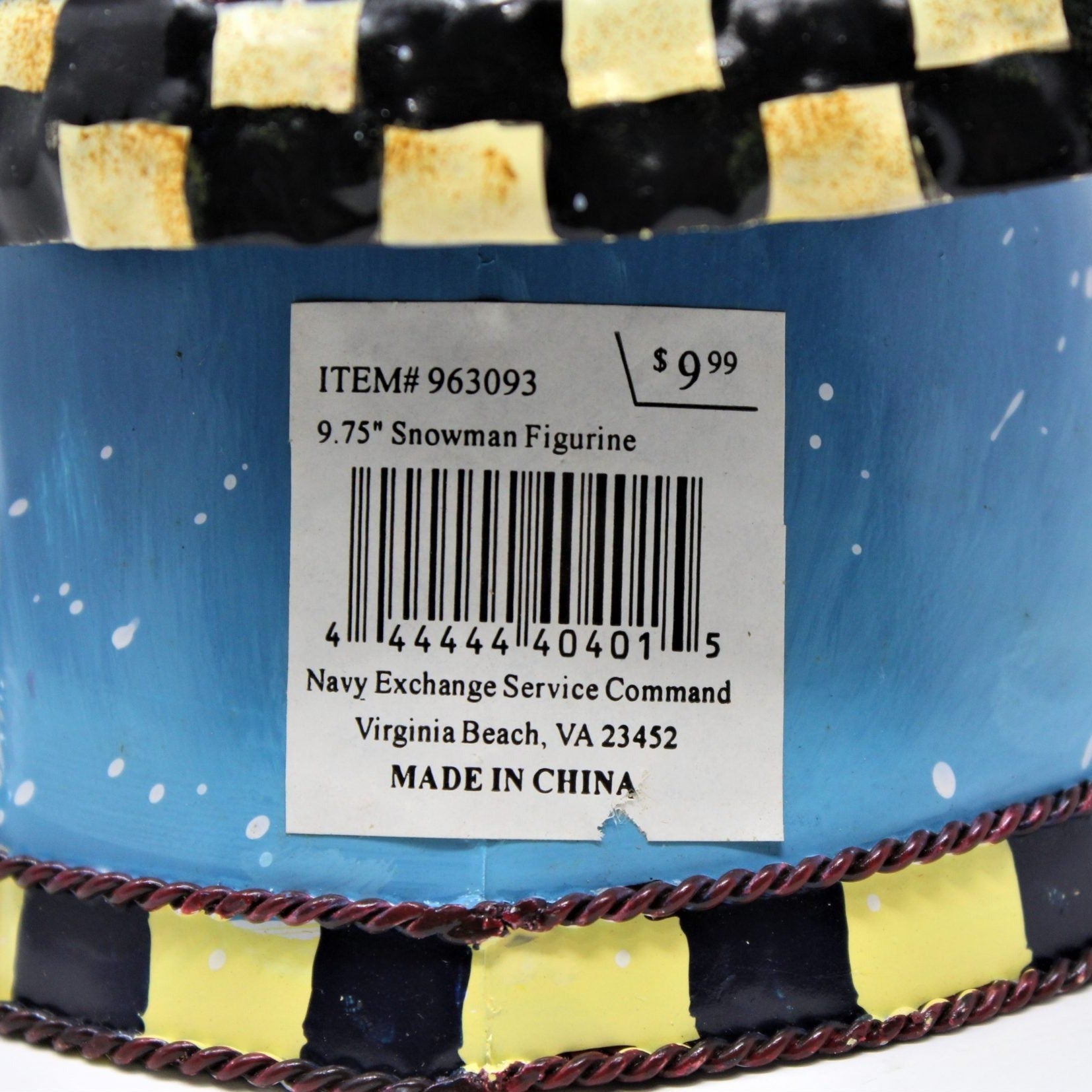 - Details: A very cute Christmas snowman dressed in his holiday best. He is cone-shaped and has a lot going on, starting with his cute face, heart shaped cheeks, top hat and scarf. His arms are sticks and there is holly and a sock hanging from them. The bottom part of the cone has a Christmas scene with in 3-D with Santa in his sleigh, being pulled by what we swear is a dog, but could be a reindeer and some houses and trees in the background. He retains his original sticker that reads in part: "Snowman Figurine Navy Exchange Service Command, Virginia Beach, VA 23452, Made in China". This could be used outdoors, best in covered space. The absolute perfect piece for a country primitive style Christmas!