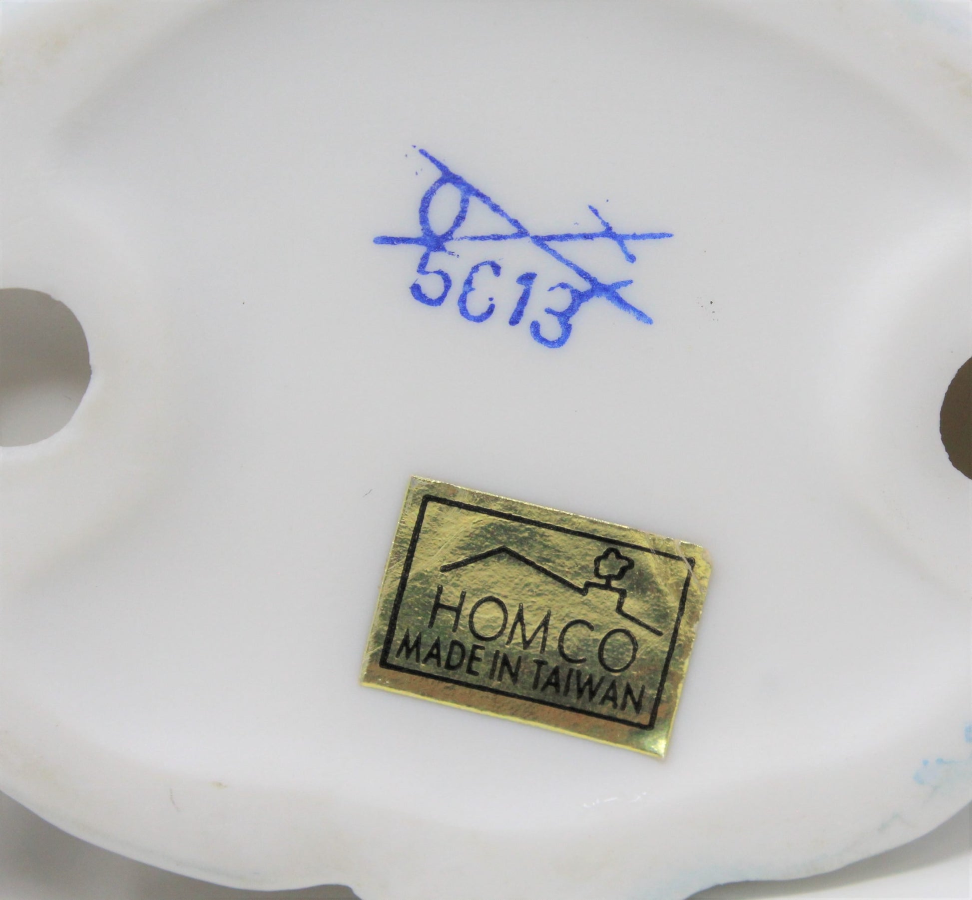 - Details: How adorable are these kids playing in the snow with their little winter outfits and ready for Christmas?!! There are 3 figurines, one carrying a present, one carrying a sack (with a little puppy sneaking out), and the third has a decorated Christmas tree. These are made of bisque porcelain, have soft, pastel colors: Blue Pink and Green. Two retain the original HomCo foil stickers, all are stamped with the HomCo logo and collection #5613. Perfect as part of your Christmas decorations, or as gifts. They are in perfect gift-giving condition.