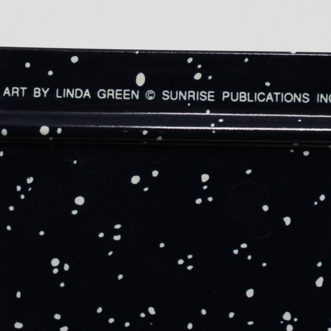 - Details: A beautiful Christmas tin! It is all about the true meaning of Christmas, based on a Linda Green painting, we believe called "Celestial Tidings", an angel dressed in a lovely gown and coat hovers over the Nativity Scene below. The tin is dark blue which shows off all the stars in the sky and of course the big bright Star of Bethlehem in the distance. The tin reads: "Original Art by Linda Green, Sunrise Publications Inc., Reproduced under license with Sunrise Licensing, 1994 for Wang's International, Made in China". A really special tin to re-use for gifting food items, for collecting or as Christmas decor.