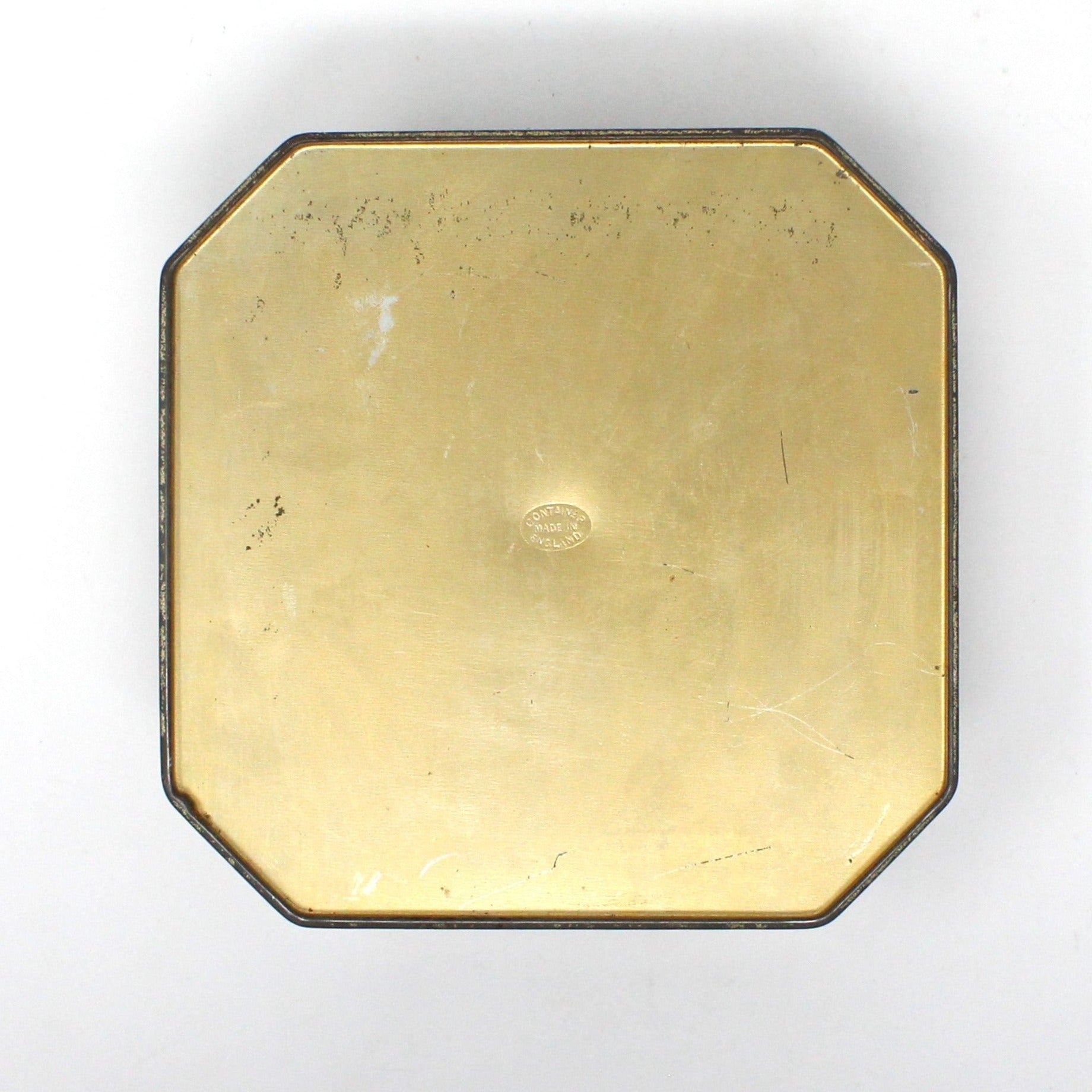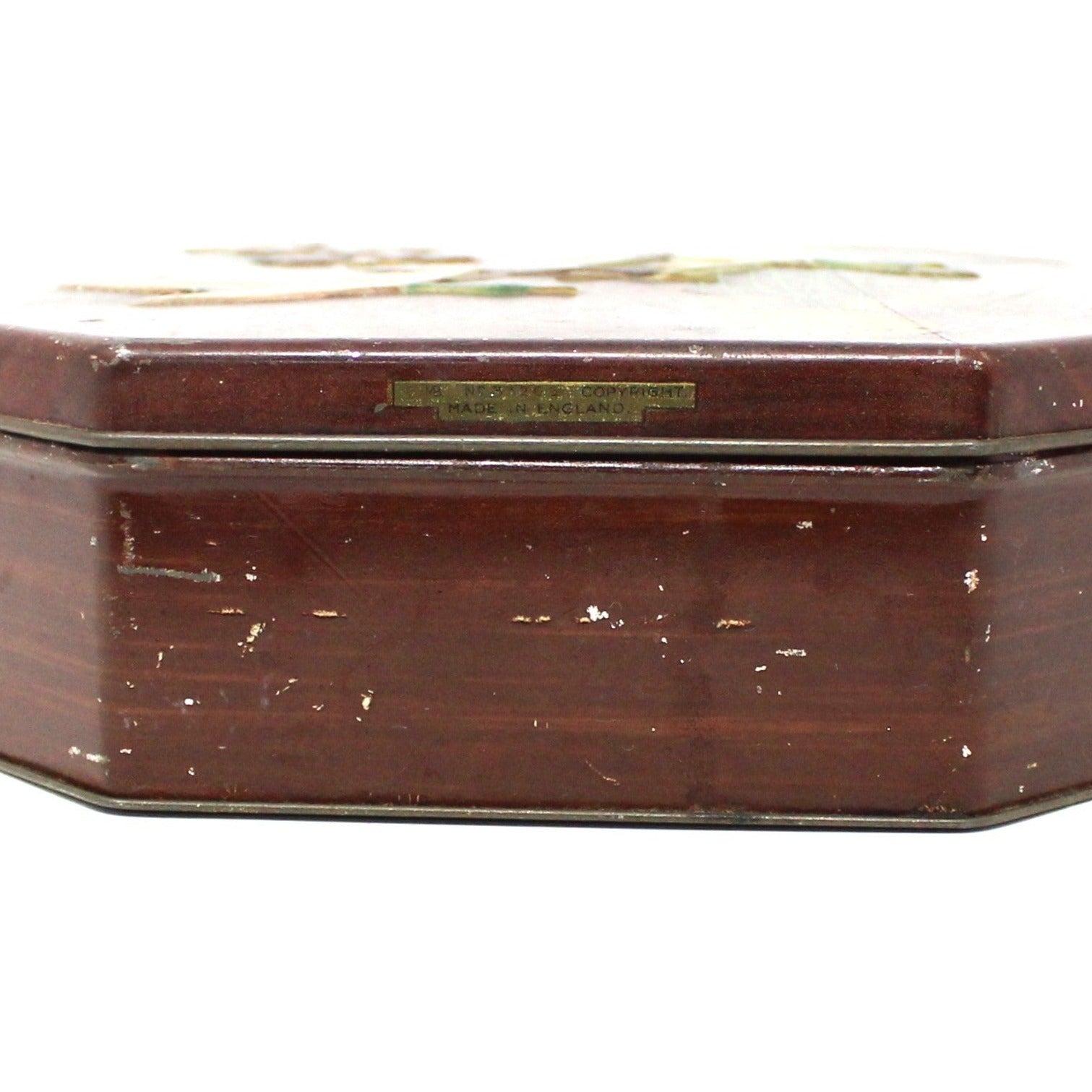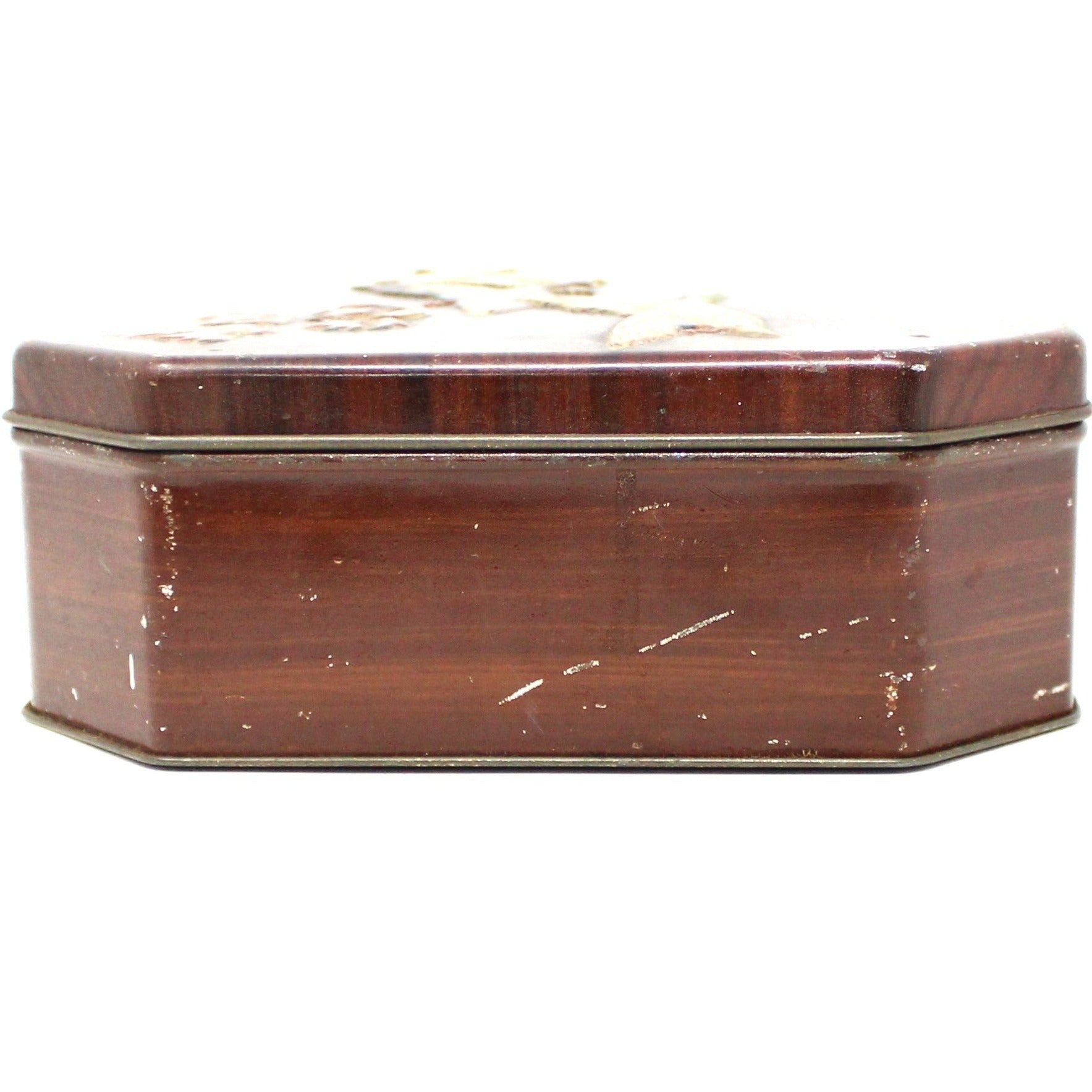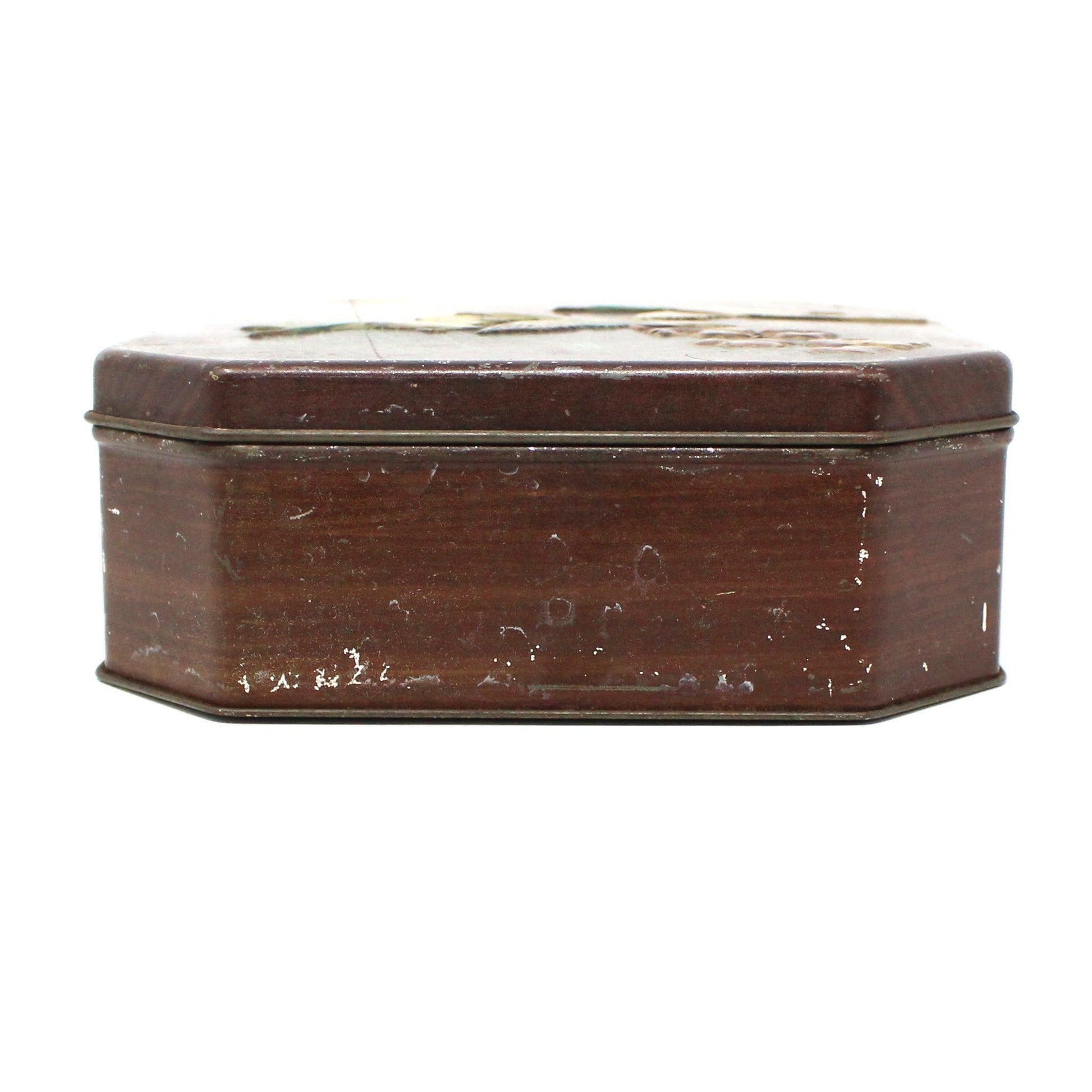 - Details: This is such a wonderful tin, it is a rare octagonal shape, with a faux woodgrain finish and embossed ducks in flight. The look is very masculine, dark muted colors, perfect for Autumn. The interior is surprisingly clean and shiny with minor wear. Mark on the bottom reads: "Container made in England". One side of lid is marked: "MB No 33265 copyright Made in England", which is how these tins were marked by The Metal Box Company in the 40's to the early 60's. This would make a great gift for a tin collector. A great addition to a Fall vignette or to store your treasures.