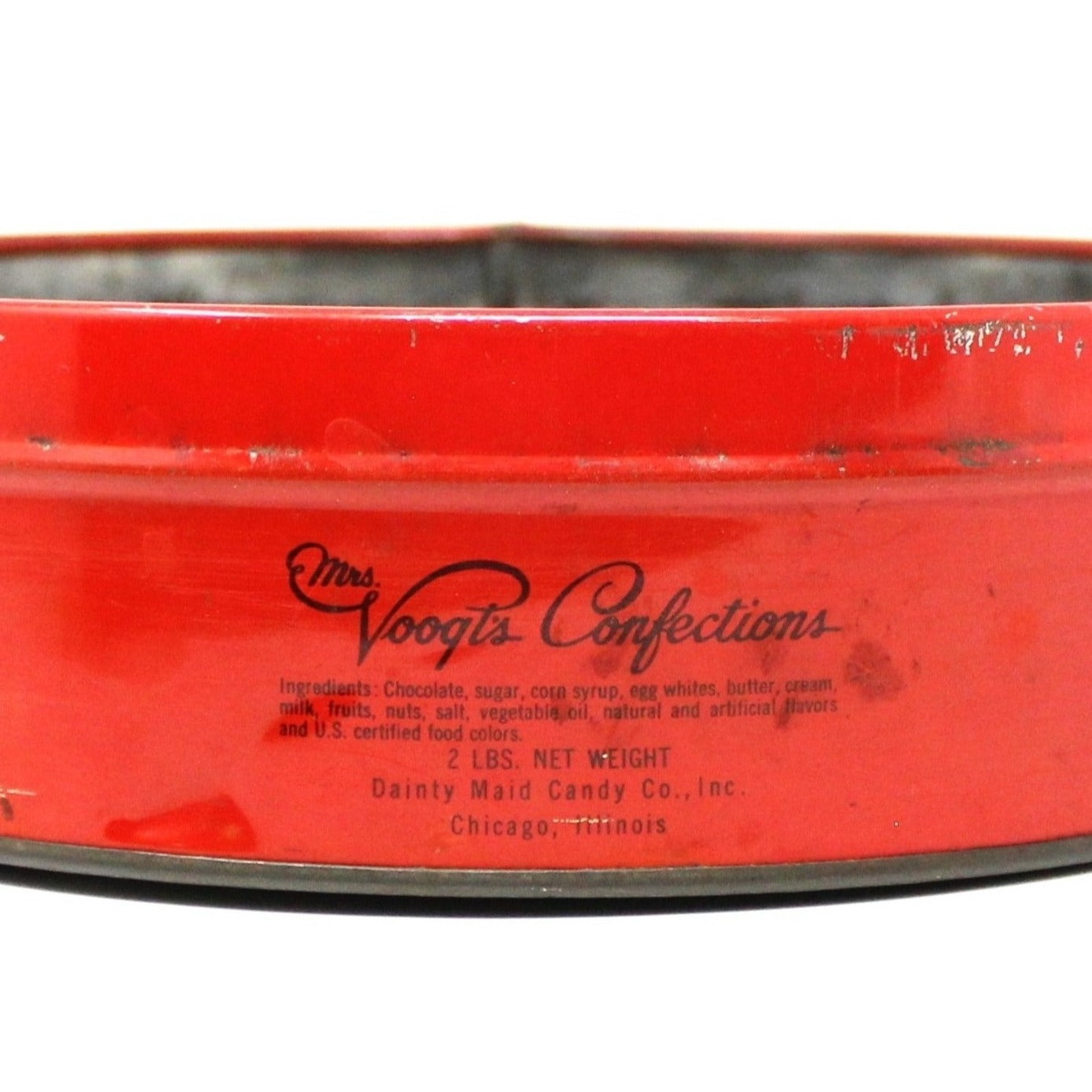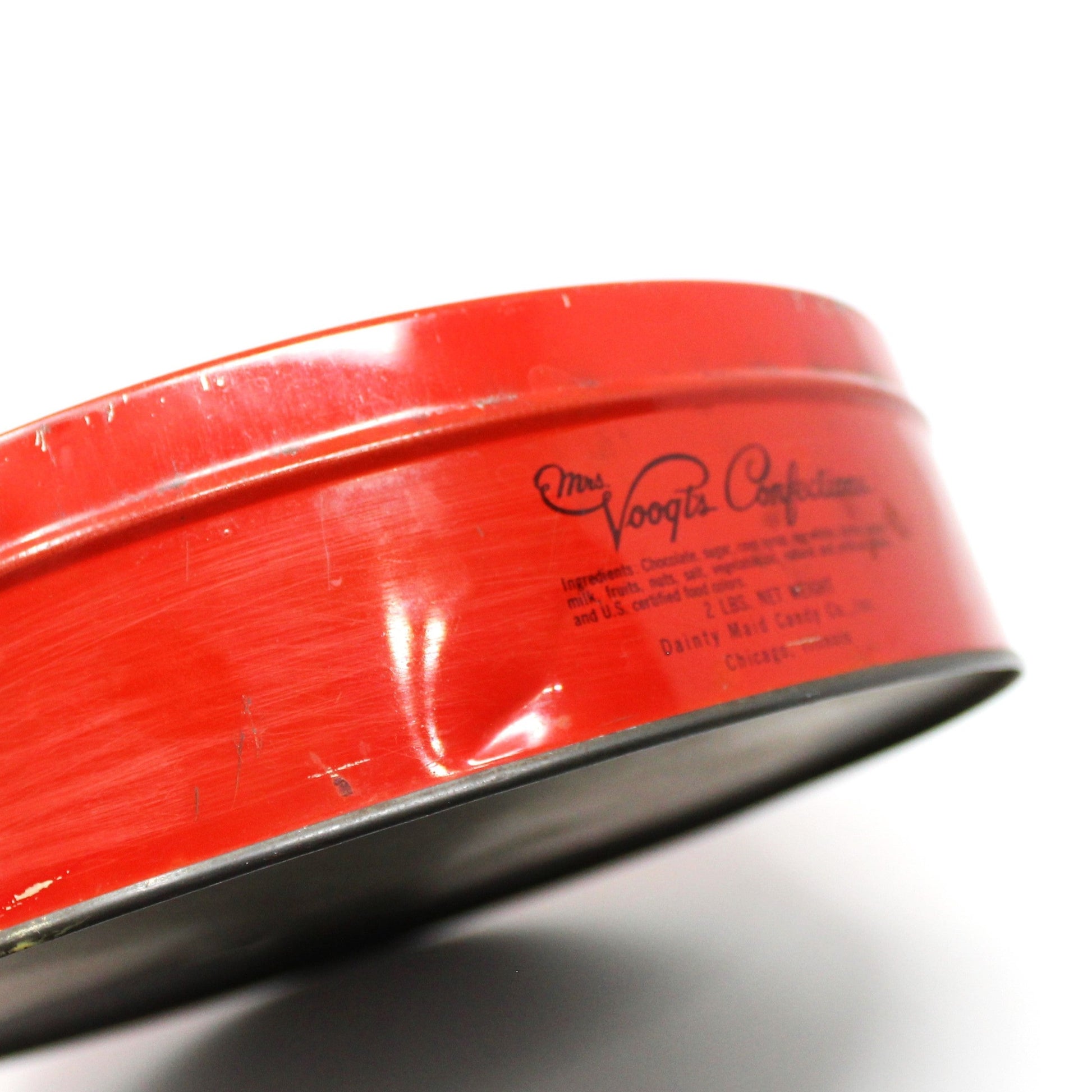 - Details: This is such a classic cookie tin from Olive Can Co! Perfect for Christmas holidays or simply winter decor. It has an outdoor winter scene, a horse drawn sleigh riding through a snowy, wooded country road. In the background a church and homes with smoke coming from their chimneys on this cold day. The scene is on the lid, the rest of the tin is bright red. One side has a label from Mrs Voogt's Confections in Chicago, IL, when researching this business we found they sold to The Illinois Candy Company in 1924, so this is a very old can. The bottom is embossed: "Olive Can Chicago". This tin is empty. Great as part of a Christmas decor vignette, perfect for old tin collectors! If you like the look of older, worn antique tins with lots of patina and pedigree, this one's for you! If not, we also carry this same tin, newer, in better condition for food use but no pedigree nor patina like this one has.