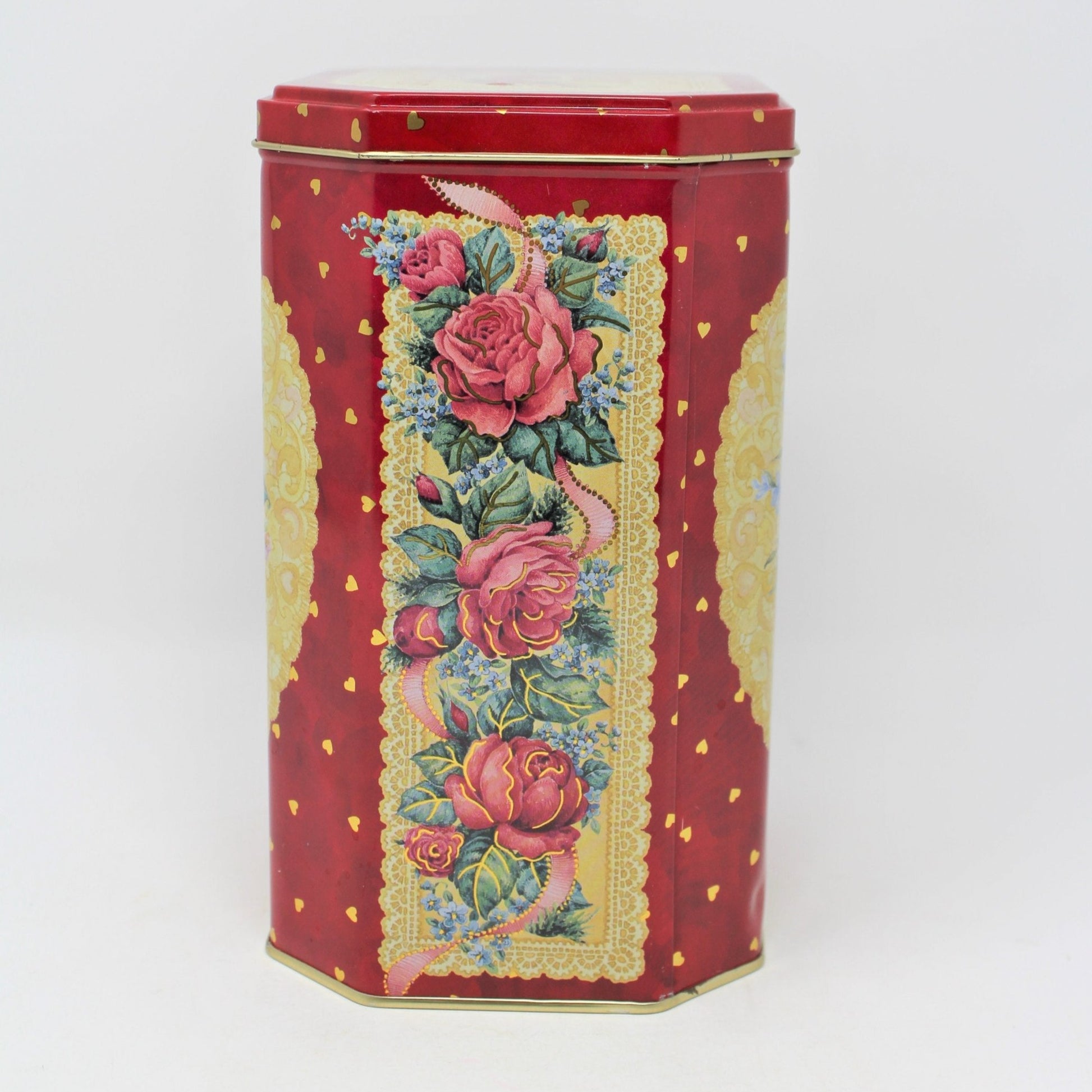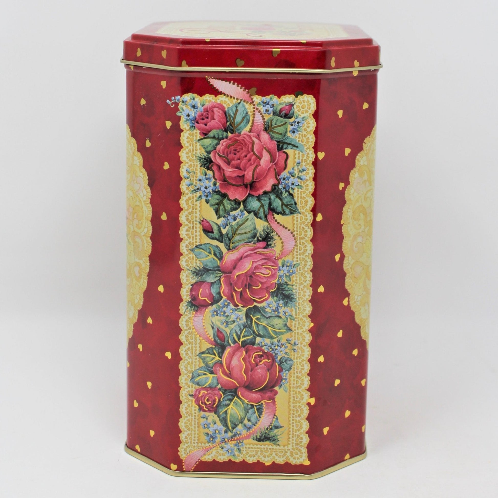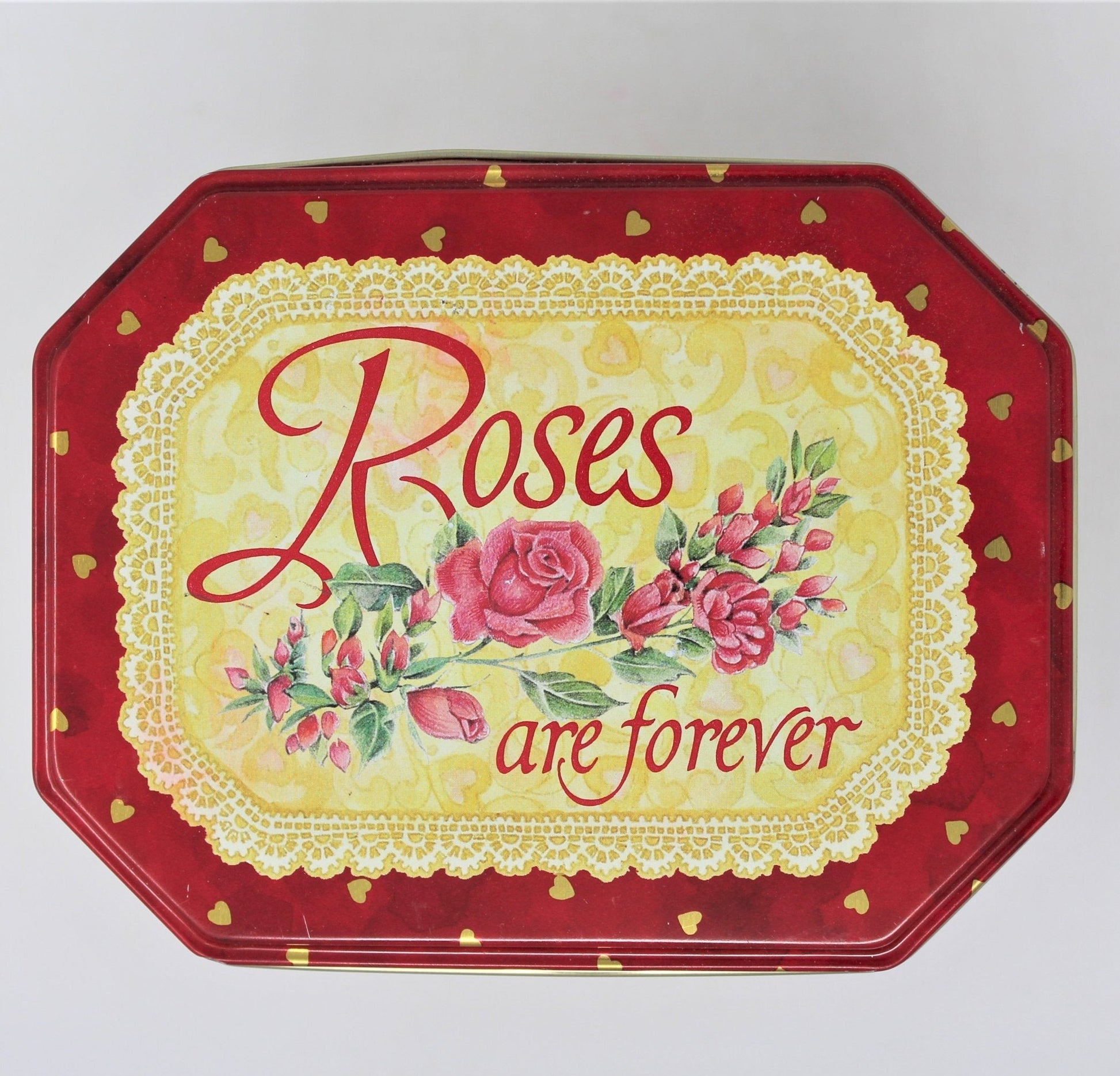 - Vintage Collectible Tin, Roses and Hearts, Roses are Forever, Valentine's Day Decor, Gift Tin, English Biscuit Tins, Decorative Tin, Romantic Theme, Pink Rose, Red with Gold Hearts, Storage Container, (Discontinued)
