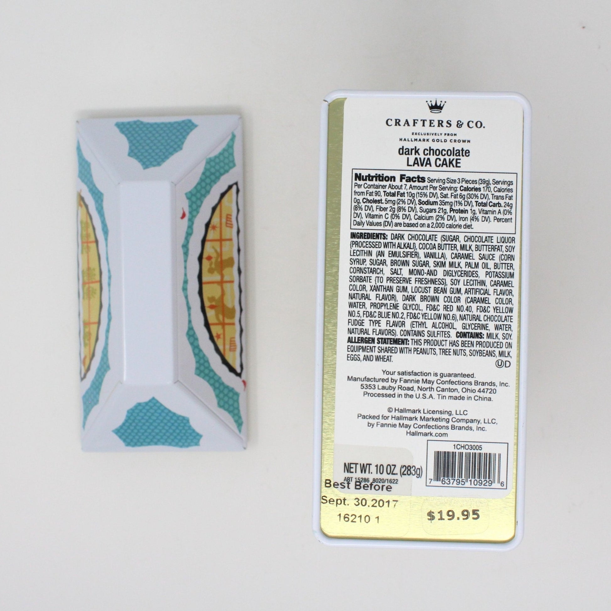 - Details: This is such an adorable cookie tin! It is part of the Hallmark Village Tin Collection. This one is shaped like a red brick apartment building with a Bakery Shop on the bottom floor. There are decorations on all the windows in the front and people going about their lives in the back windows. Really cute couple dancing on the attic apartment. Lots of snow everywhere, makes it the perfect gift tin for the holidays. There is a sticker on the bottom that reads in part: "Crafters & Co exclusively for Hallmark Crown, Dark Chocolate Lava Cake". This tin is empty. These Hallmark tins are collectibles, if you're missing the bakery, hope this find brings you joy. Great gift for a tin collector.