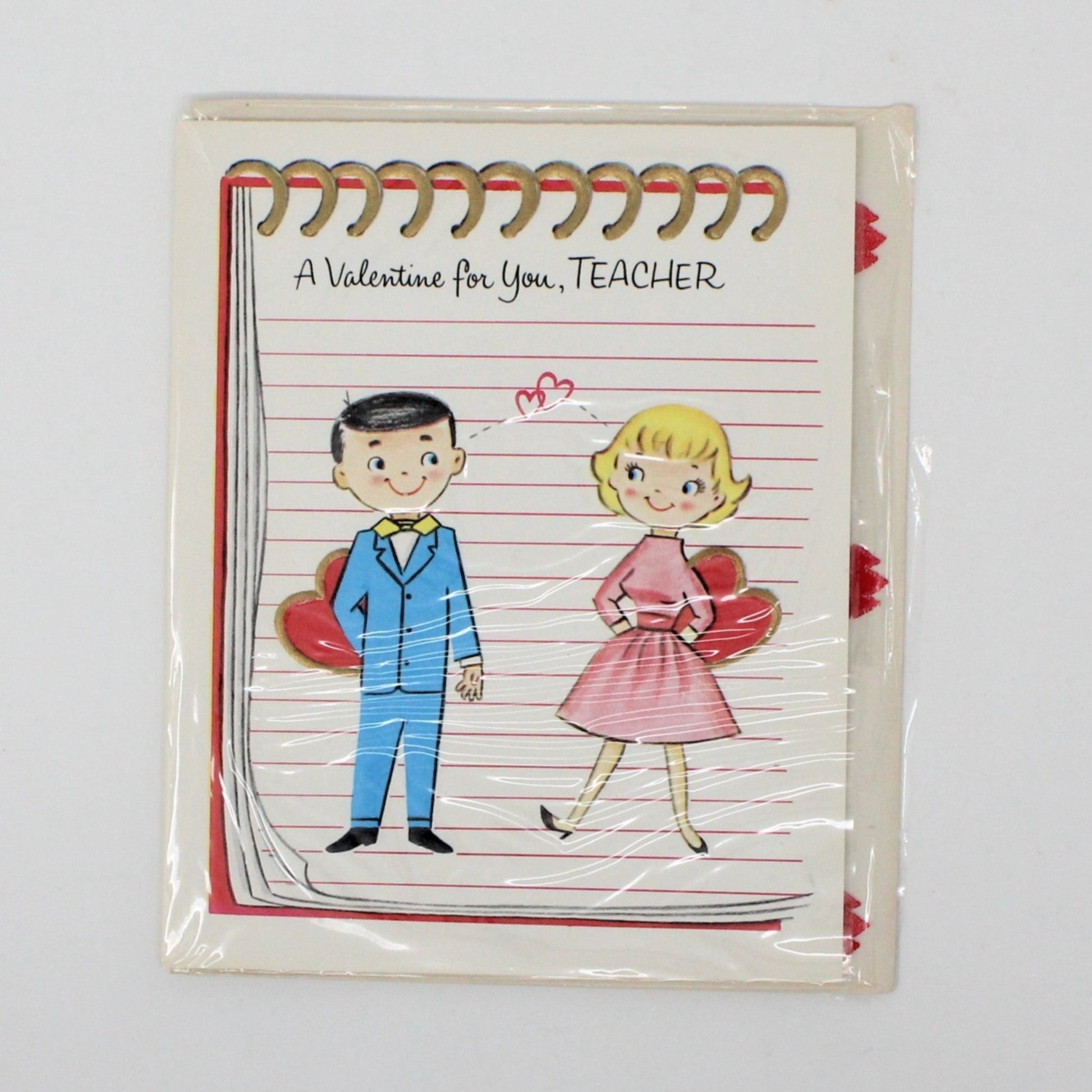 - Vintage Valentine's Day Card, For Teacher, Couple with Hearts, Gilded w/envelope, NOS Unused, Ephemera, Vintage Greeting Card Collectors, (Discontinued)