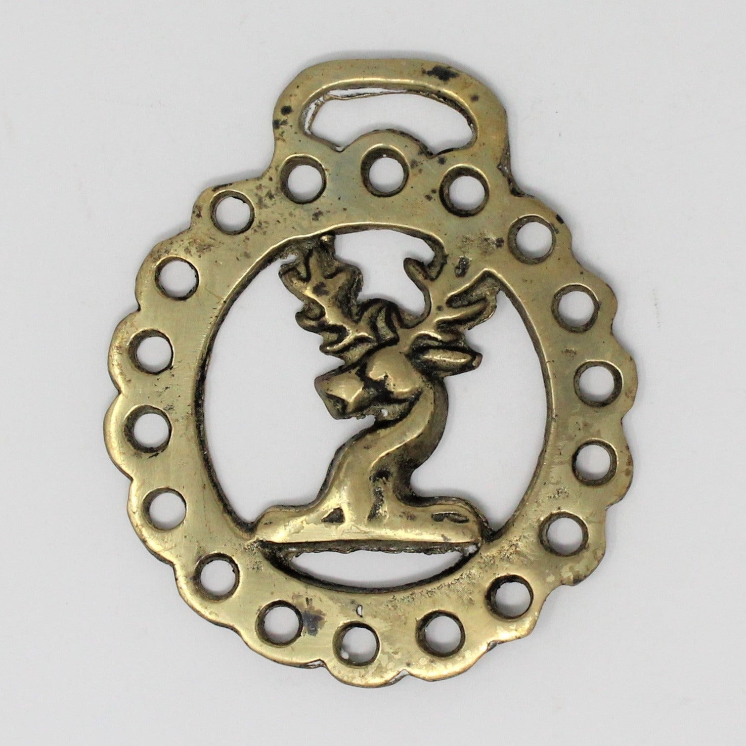 - Details: These horse brass bridle medallions are highly collectible! They have been collected and displayed for hundreds of years. Today they are also used as home decor in many creative ways: tied with ribbon on vases, ginger jars, lamp bases, on gift wrap as accents, on Christmas wreaths, as Christmas Tree ornaments, we've even seen them given as mementos at Kentucky Derby parties and other equestrian events! This Stag Head medallion is made of brass with wonderful markings and patina. There is no manufacturer's mark so we're unable to tell you much beyond the description, but we know most of these are English or Scottish. There is still some shine to it, most like the old patina but it can be polished for a higher shine if using as decor or other purposes where a brighter look is preferred.