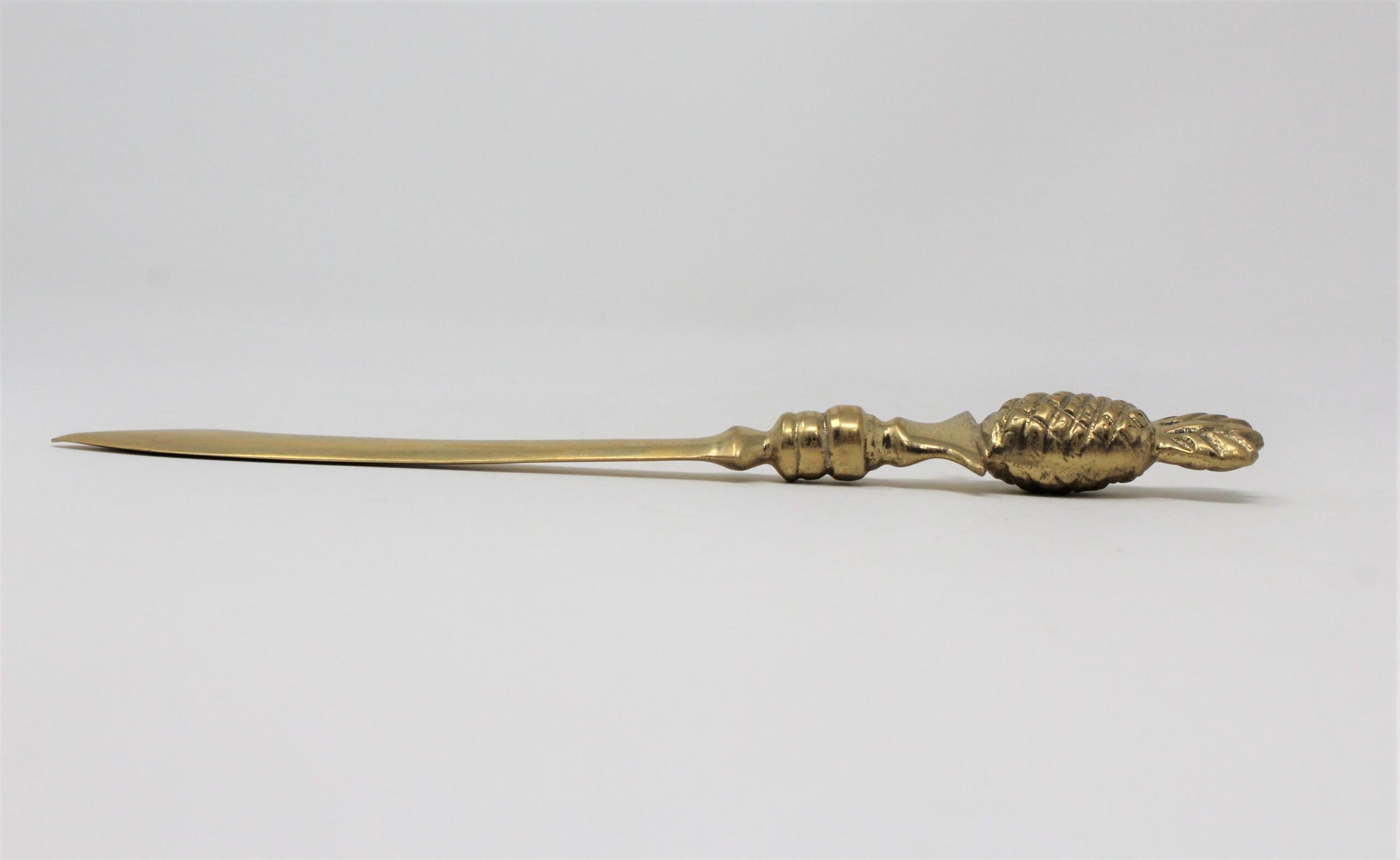 - Details: Bring in a touch of the South to your home of office with this pretty letter opener! The pineapple is a well known sign of hospitality in the south and this letter opener will add the perfect "Welcome" touch in your home. It is solid brass, not plated, with a wonderful sword shape and a very detailed pineapple on top. This is not the newer "flat" pineapple letter openers, this is very heavy, solid brass and the pineapple is rounded with lots of nice details. The wear on the brass gives it a really nice vintage look you can't get from a new piece. Great accent in the office, the kitchen, anywhere you open mail. Very nice gift for Mother's Day when paired with pretty stationary.