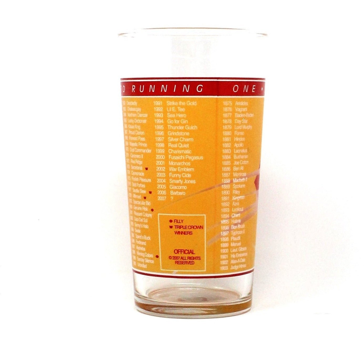 - Details: This is the official Mint Julep glass from the 133rd Kentucky Derby race at Churchill Downs. These glasses are issued every year and are highly collectible. This one has very bright orange and red colors and an abstract horse head design cut to clear. The back has all the past winners since 1904 and 2007 is left blank with a "?". This glass retains the original Churchill Downs official sticker, probably never been used. A classic yearly horse race, the Kentucky Derby is enjoyed by a multitude of people, from all walks of life. This glass is a "must-have" for any horse racing fan or memorabilia collector. Perfect for your next horse racing watch-party.