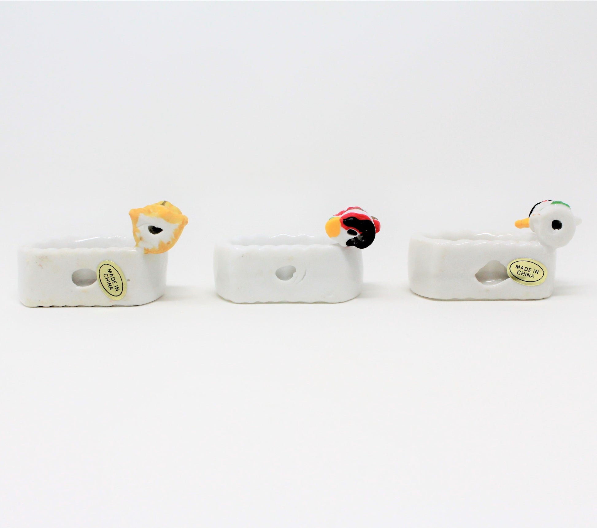 - Details: This is a very cute set of napkin rings, perfect for your holiday table. We believe these came in sets of four, we only have the three: Santa, Snowman and Teddy Bear. We're always looking for more napkin rings because we rarely have only 4 people at the table, hopefully these will help add more pieces to your existing set. These are hand painted, in an arched design so they lay flat on the table. They retain their original foil sticker that reads: "Made in China". Cute accent for your Christmas table and actually perfect for the children's table.