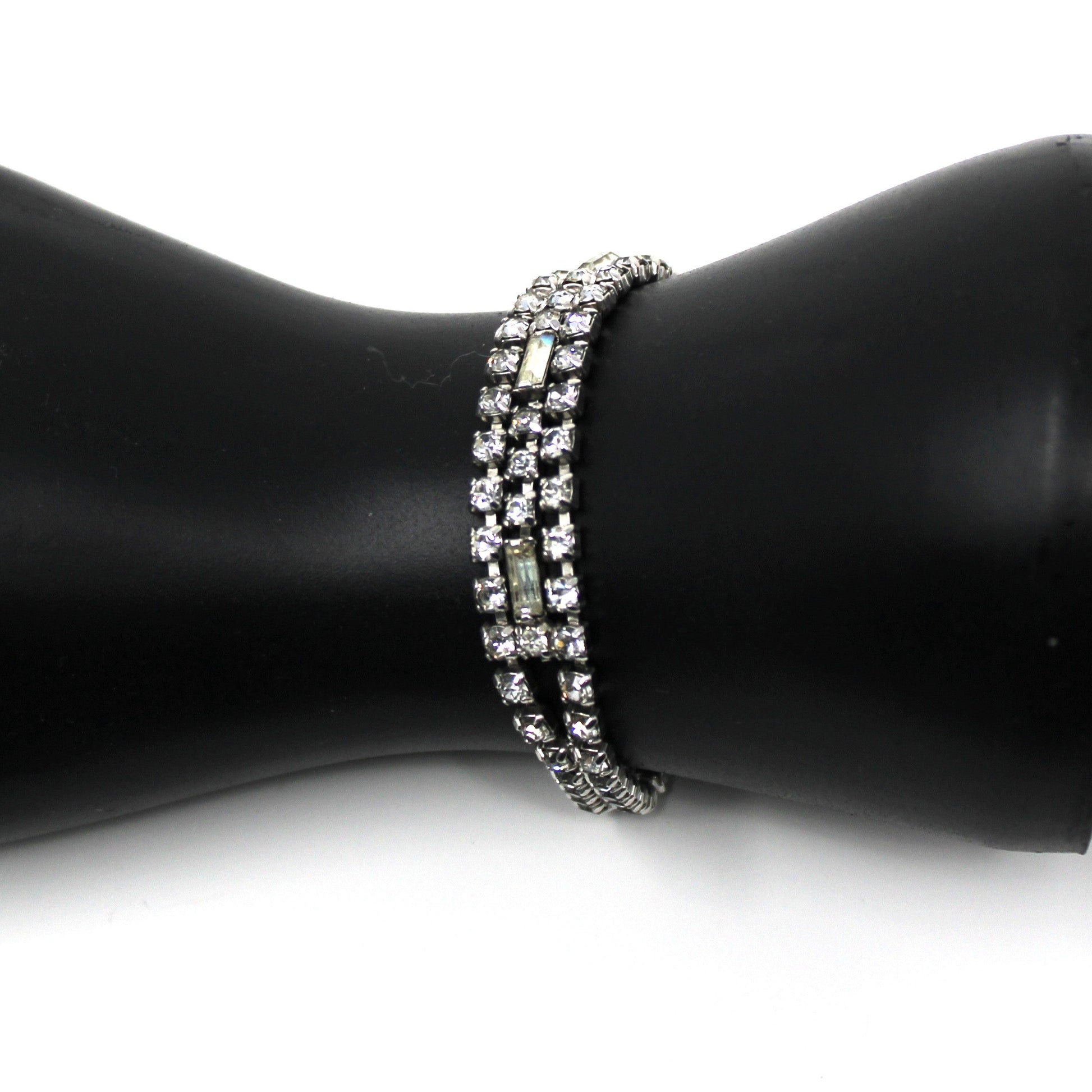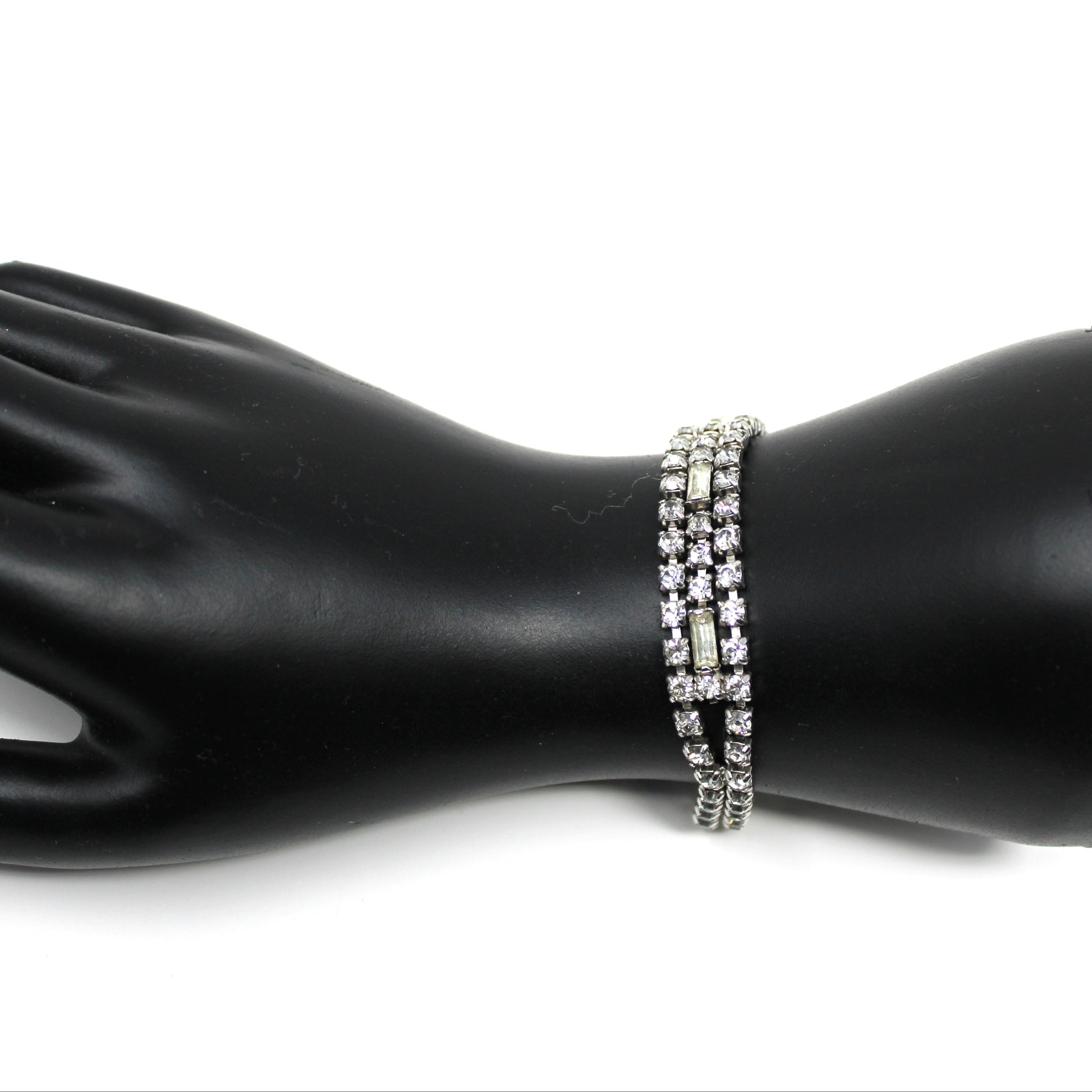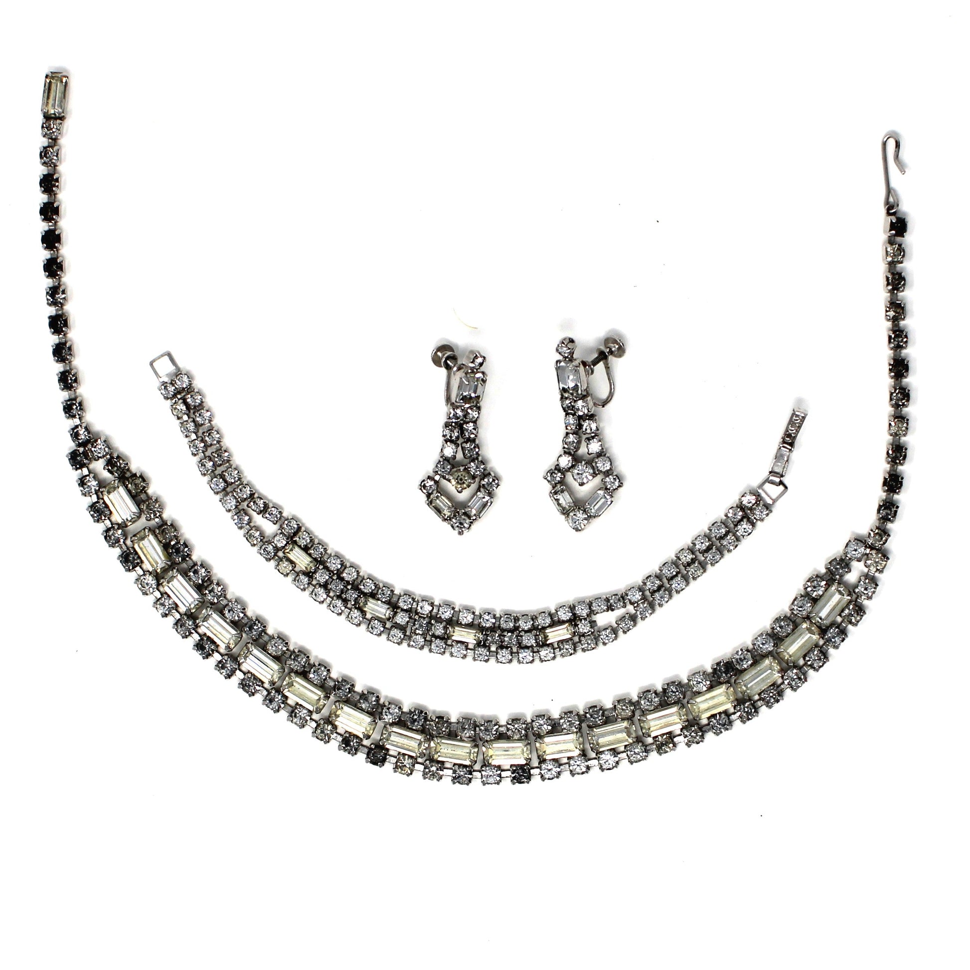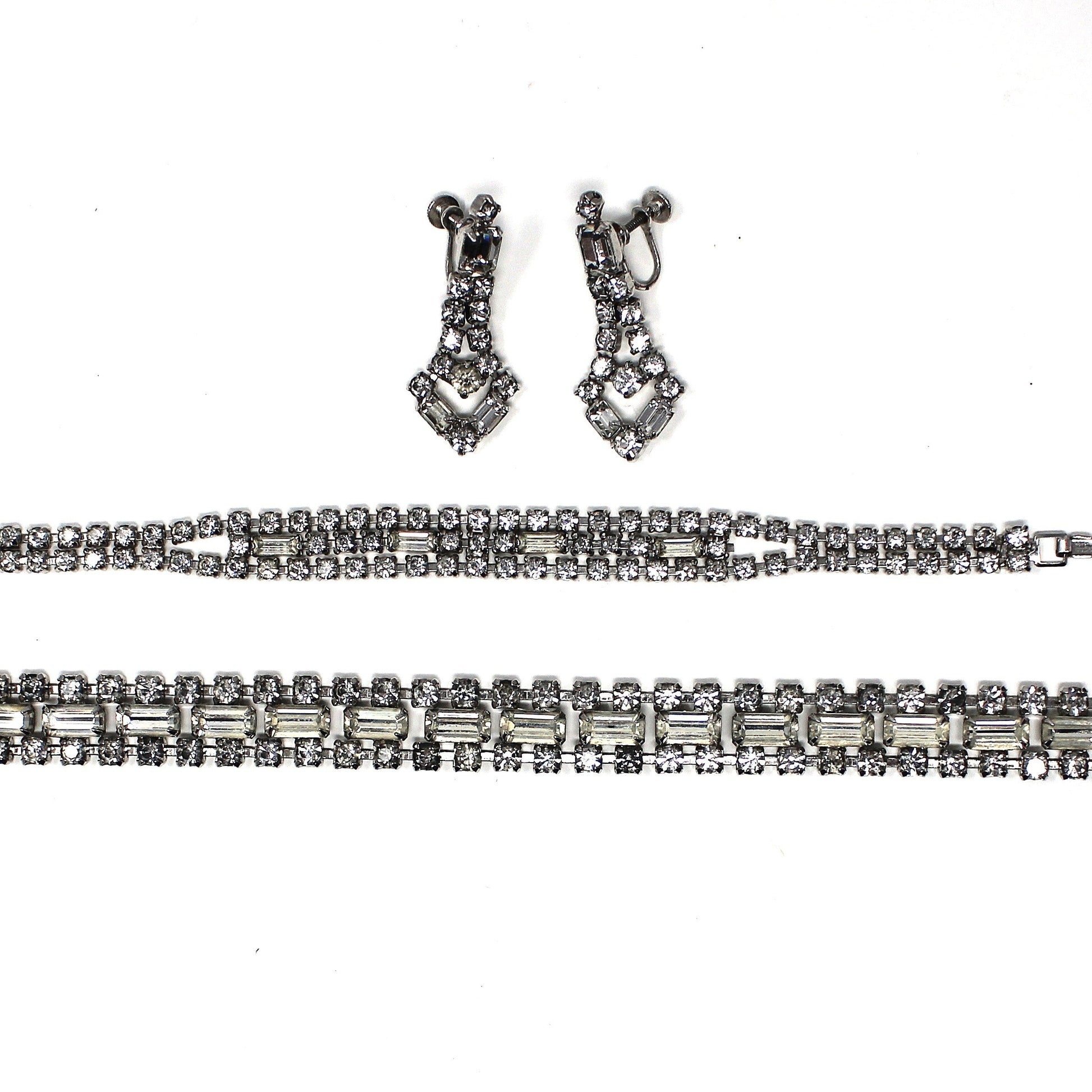 - Details: We can't say enough about this absolutely beautiful parure set. There are three matching pieces: a necklace, bracelet, and earrings, each adorned with clear crystal rhinestones in baguette and square cuts, artfully prong set. The necklace is collar style, has three rows of rhinestones, two rows with square prong set stones and one center row with large baguette cut stones, it has a hook clasp. The bracelet has the same three rows, with smaller size crystals. Lastly the earrings, they are chandelier style, with screw backs. A large Emerald cut rhinestone is set at the top, with smaller, square cut rhinestones dangling towards the bottom, ending with two baguette cut stones and a larger square rhinestone. We have described these pieces to you as best we know how, but just one look at them, you know these are special! This is an elegant and timeless set, that stands the test of time and style. Originating from the 1950s, this mid-century collectible jewelry set exudes timeless elegance and refined craftsmanship, perfect for adding a sophisticated sparkle to that special ensemble.