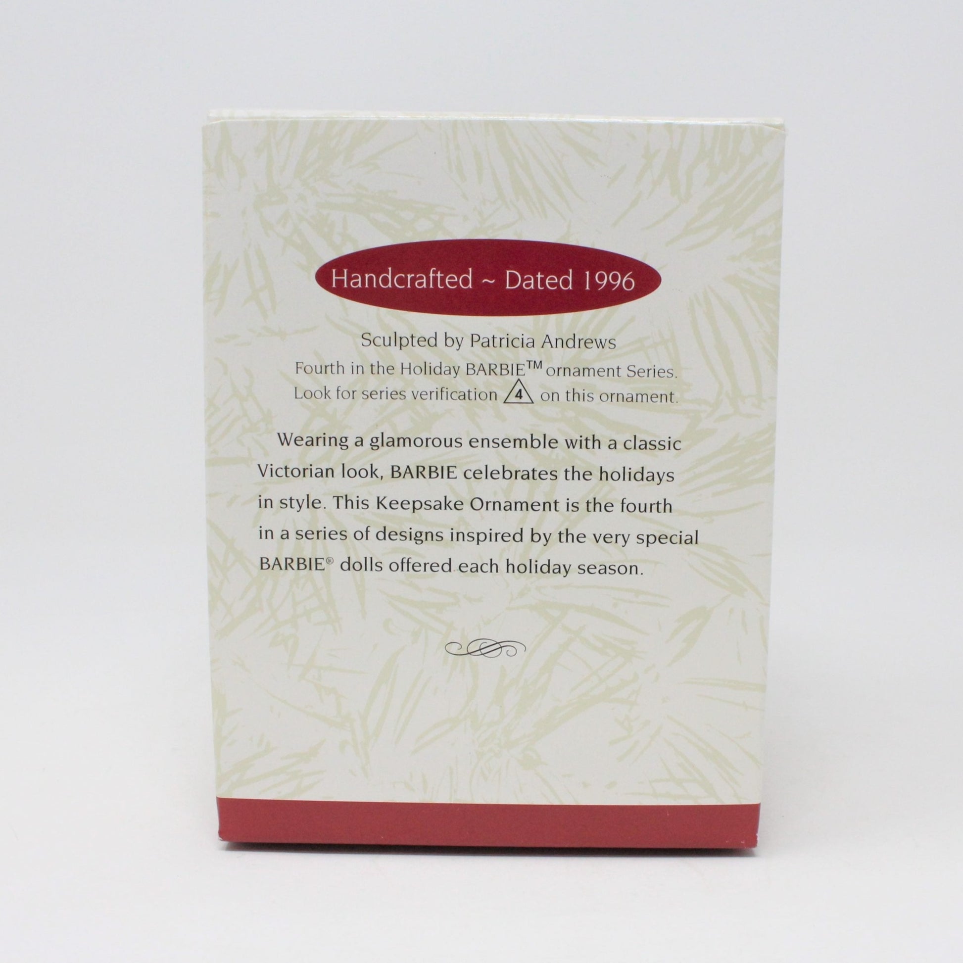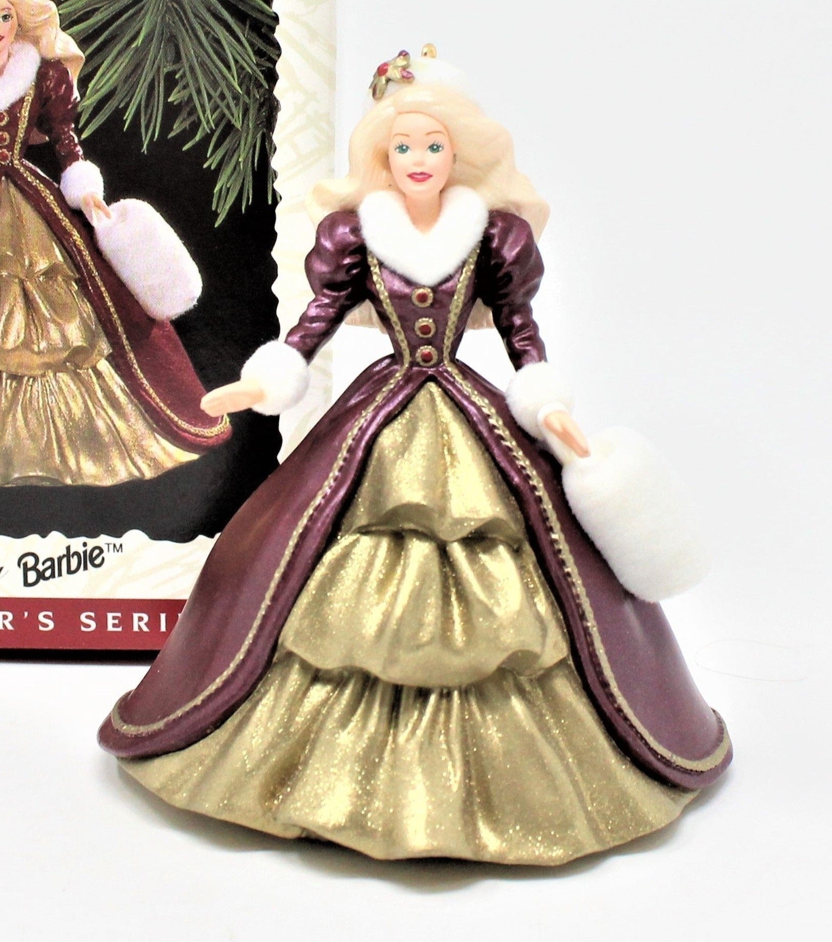 - Details: A beautiful Barbie ornament is from the Hallmark Keepsake Holiday Barbie Series. This one is from 1996, 4th in the series, created by Patricia Andrews and only available on the secondary market. This is a blond Barbie, wearing a gorgeous sparkling gold gown and burgundy coat with a white fur collar and cuffs. She has a matching white fur Russian Cossack hat and muff (hand warmer). In it's original box and packaging. She will make a great addition to your own collection, a great gift for a Barbie collector or a sweet little girl. Great stocking stuffer! We offer 20% off on the purchase of 3 or more ornaments. Please Contact Us, let us know which ornaments you're interested in to receive discount.