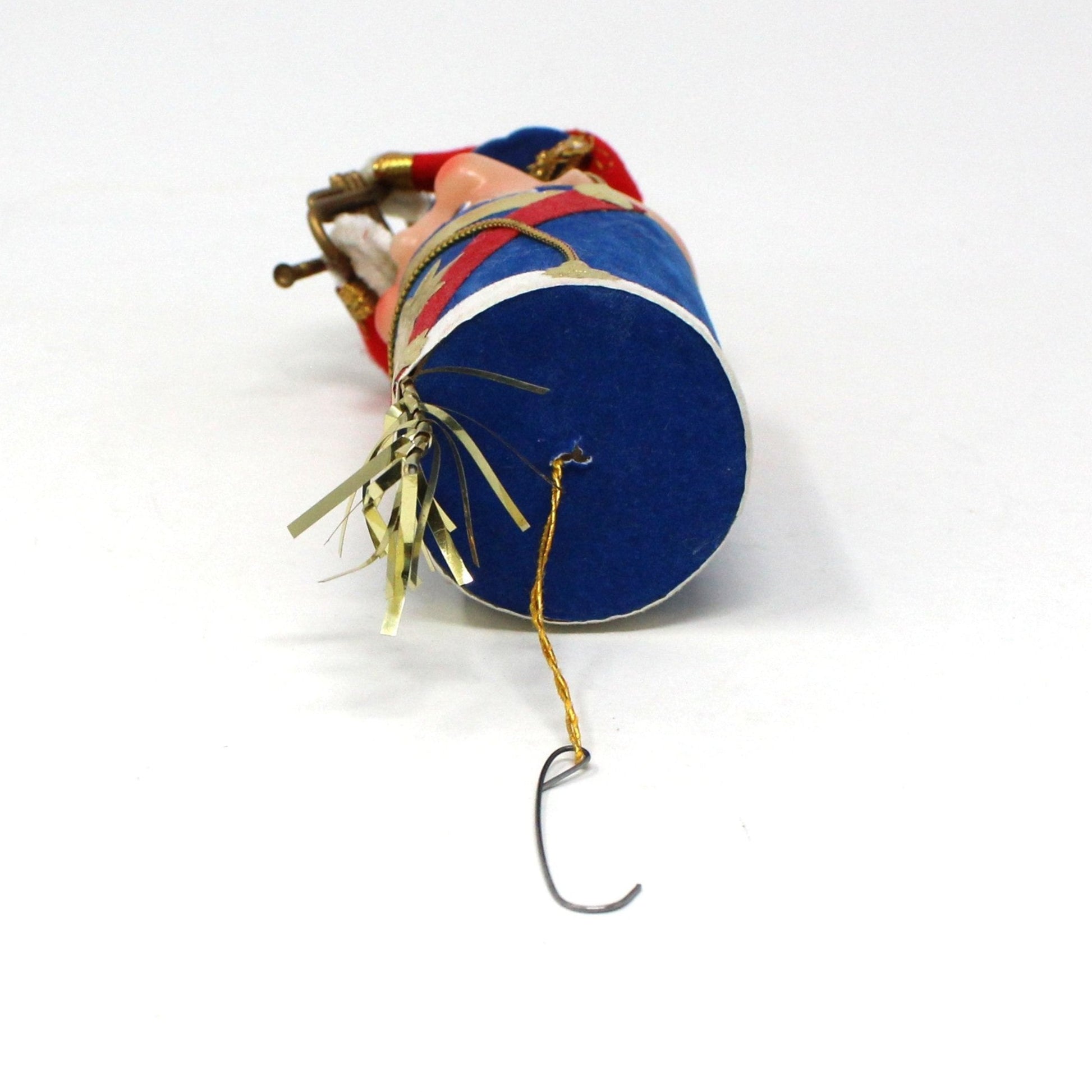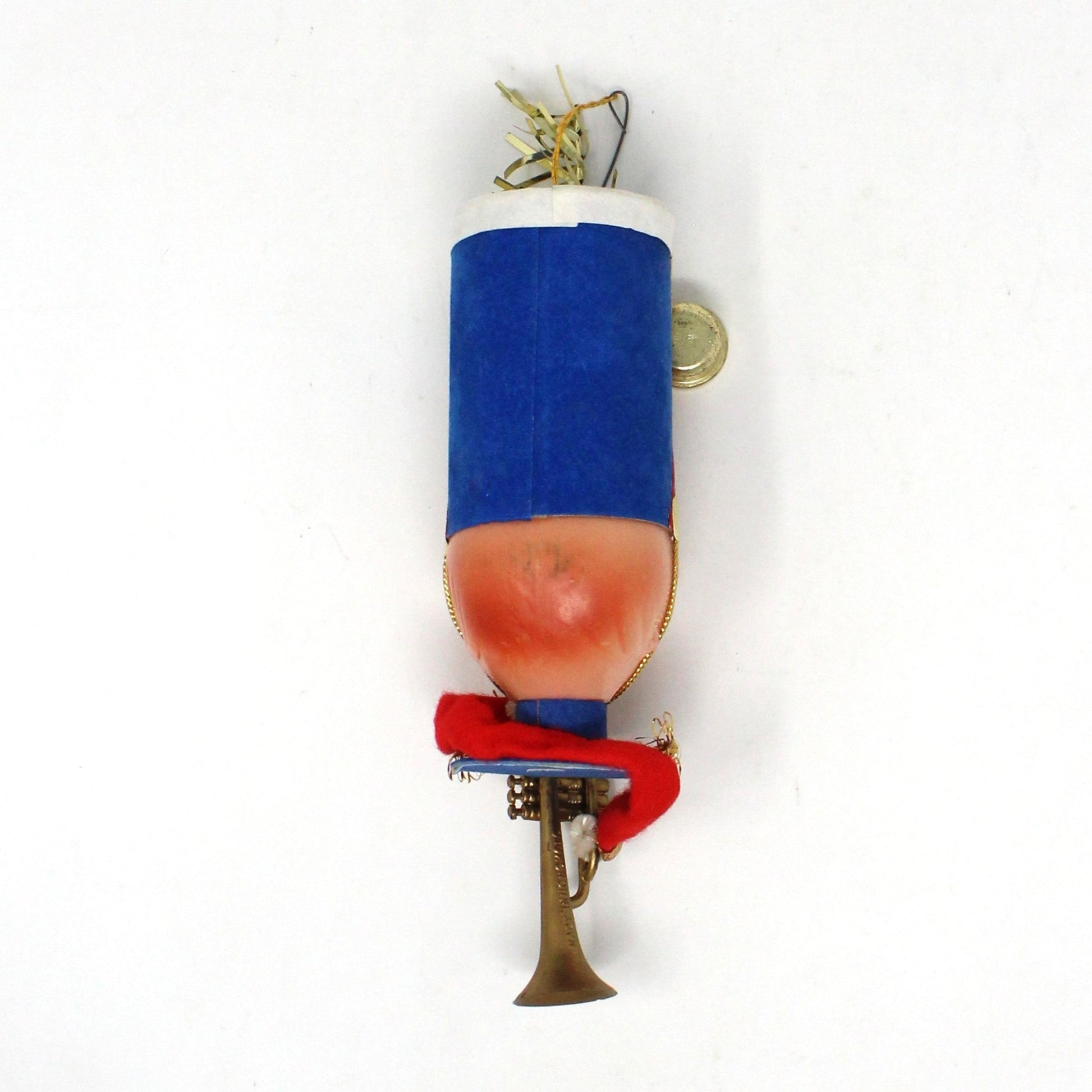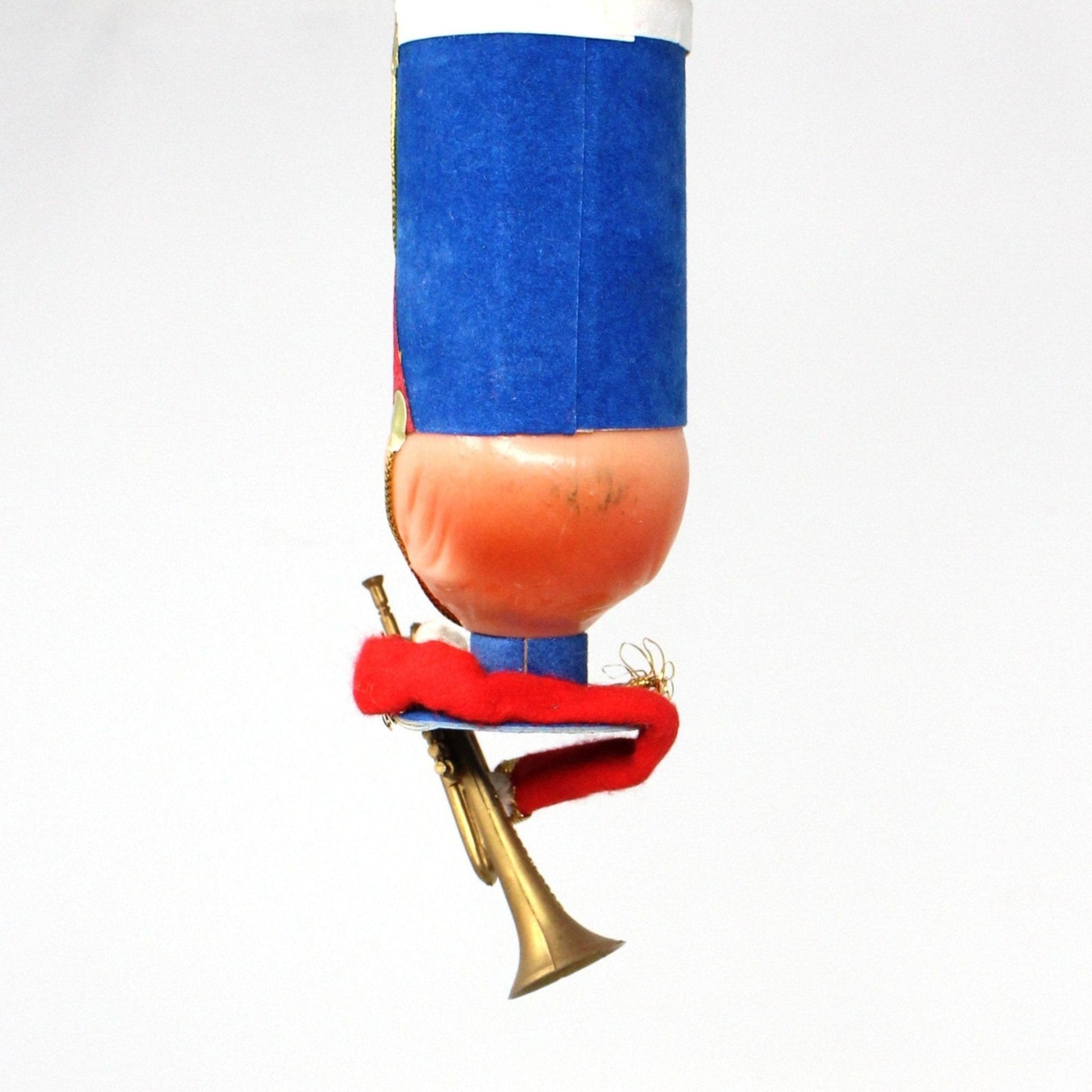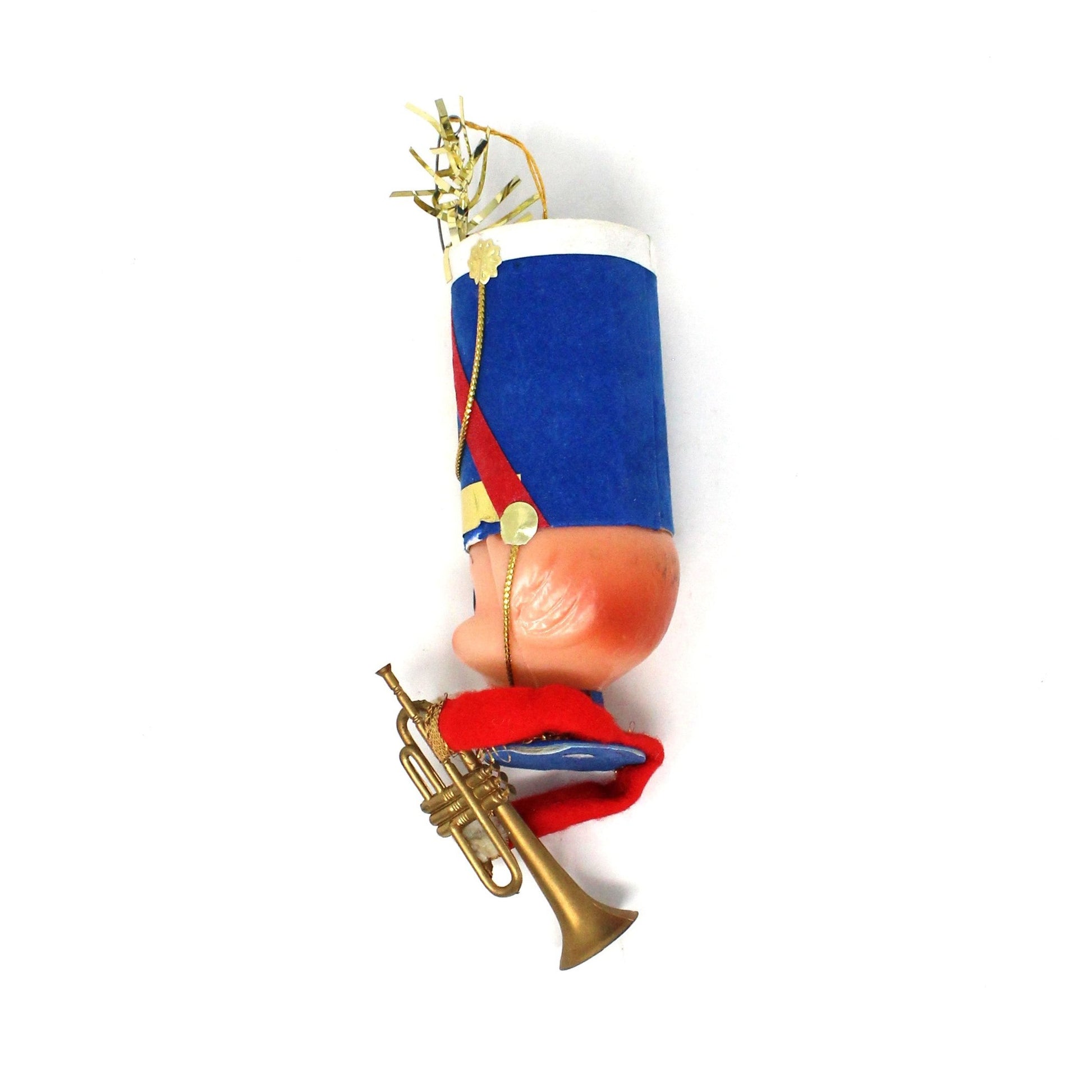 - Details: This vintage Christmas ornament will add a touch of nostalgia to your Christmas tree. It is a rare find running across Marching Band Soldier, with the hands and musical instrument still intact, this one has it all, and is in absolutely wonderful vintage condition. He is blue, red and gold, with a blow-mold celluloid face, plastic trumpet, gold tinsel plume, even his shoulder epaulettes are in place, and has a gold cord for hanging. Great addition to your Christmas Tree or added to gift packages. We offer 20% off on the purchase of any 3 or more ornaments, mix and match. Please Contact Us, let us know which ornaments you're interested in to receive discount. (Sets Count as 1 Item).