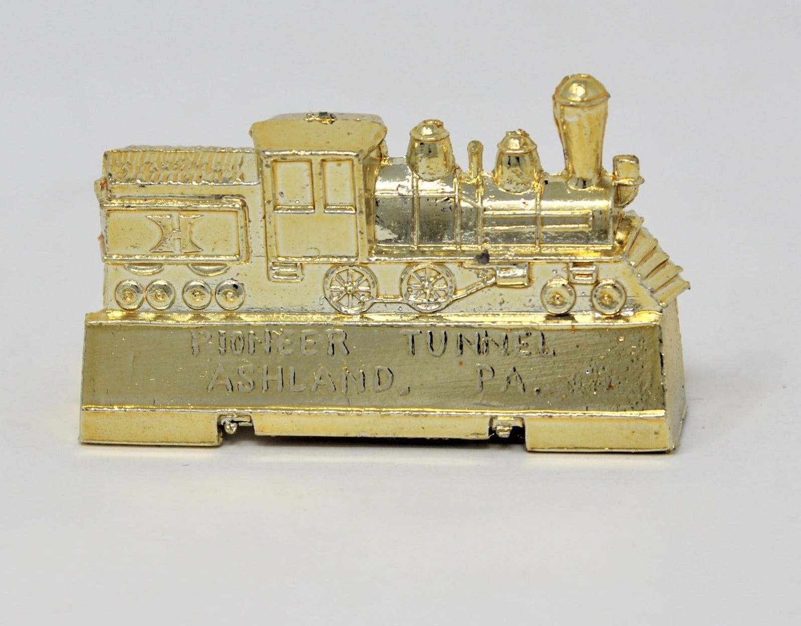- Details: This is a set of brand new, never used, still in its original plastic bag, pencil sharpener. This pencil sharpener, was possibly a souvenir given by the Chattanooga Choo Choo to those who traveled to Ashland, PA. The details on this train are extremely well done, down to the spokes on the wheels. The box where these were found was labeled: "Antimony Ware Hand-Made Pencil Sharpener". The origin of antimony products dates back to 1877 Tokyo. Antimony is an alloy, which easily takes impressions, has a smooth surface and does not shrink during cooling after casting. It is used to produce fine and highly detailed features on varied articles such as accessories, figurines, presentation trophies, music boxes, etc. The sharpener is marked: "Chattanooga Choo Choo" on one side and the other side: "Pioneer Tunnel, Ashland, PA". Perfect for a train lover/collector or pencil sharpener collector. Great conversation piece!